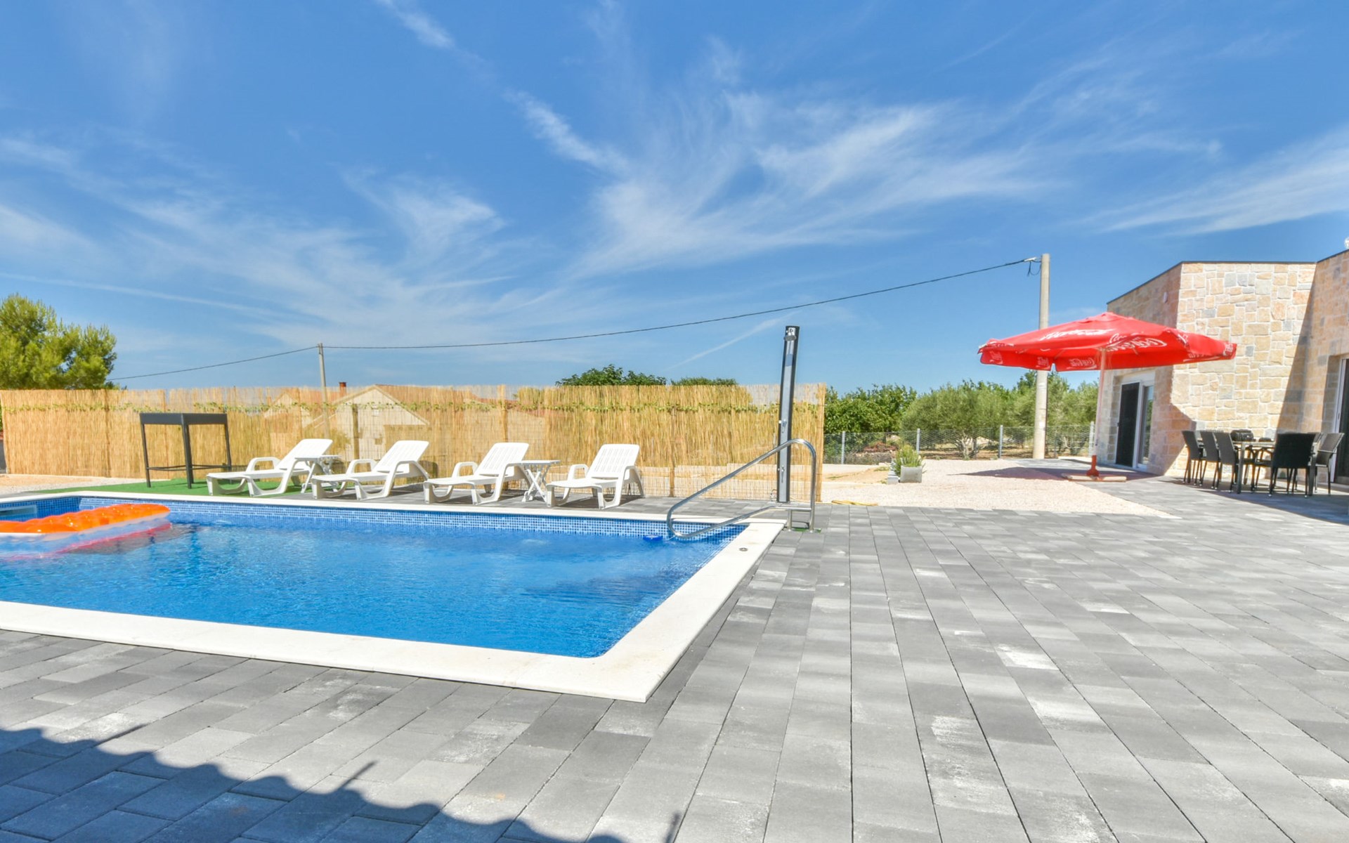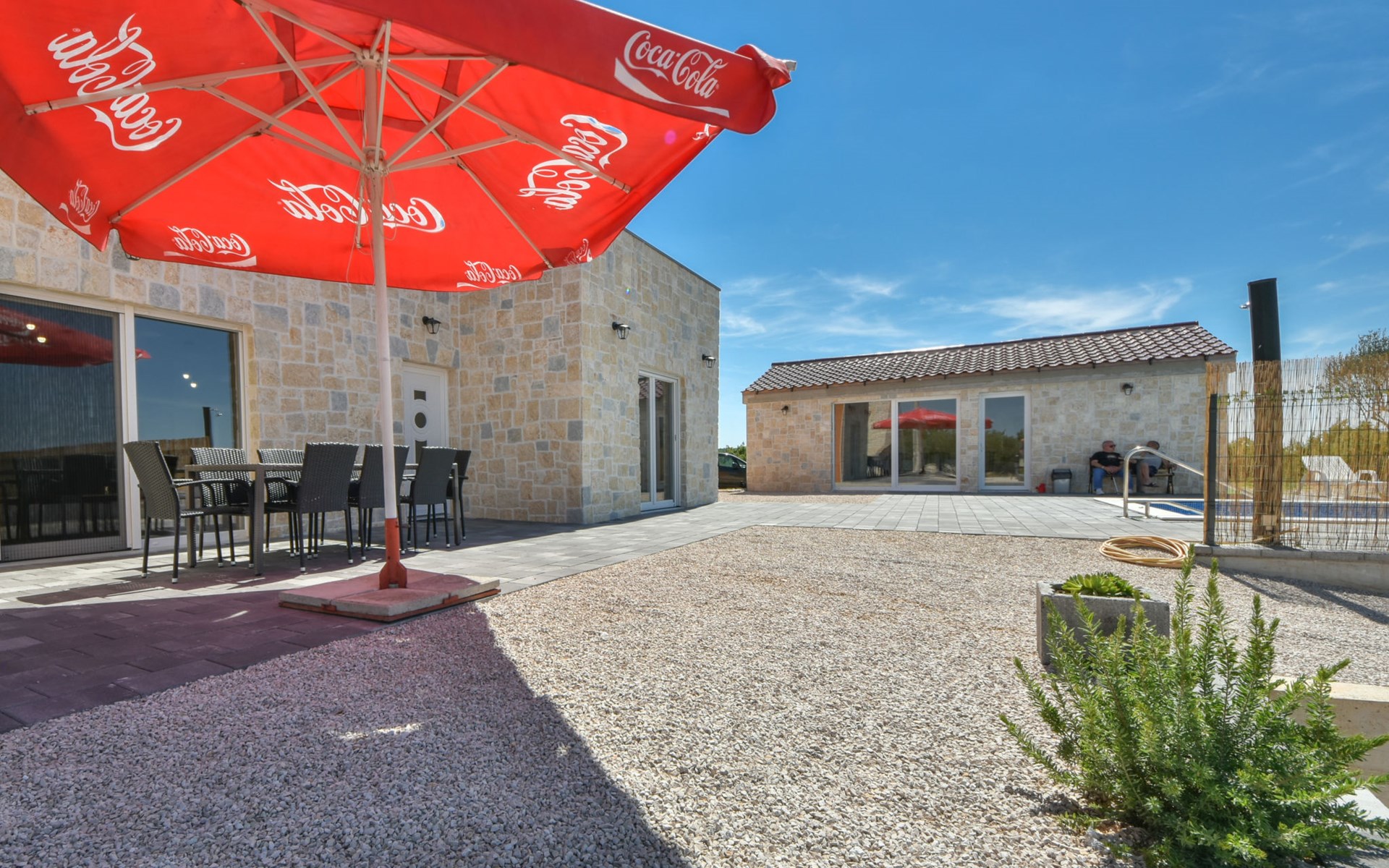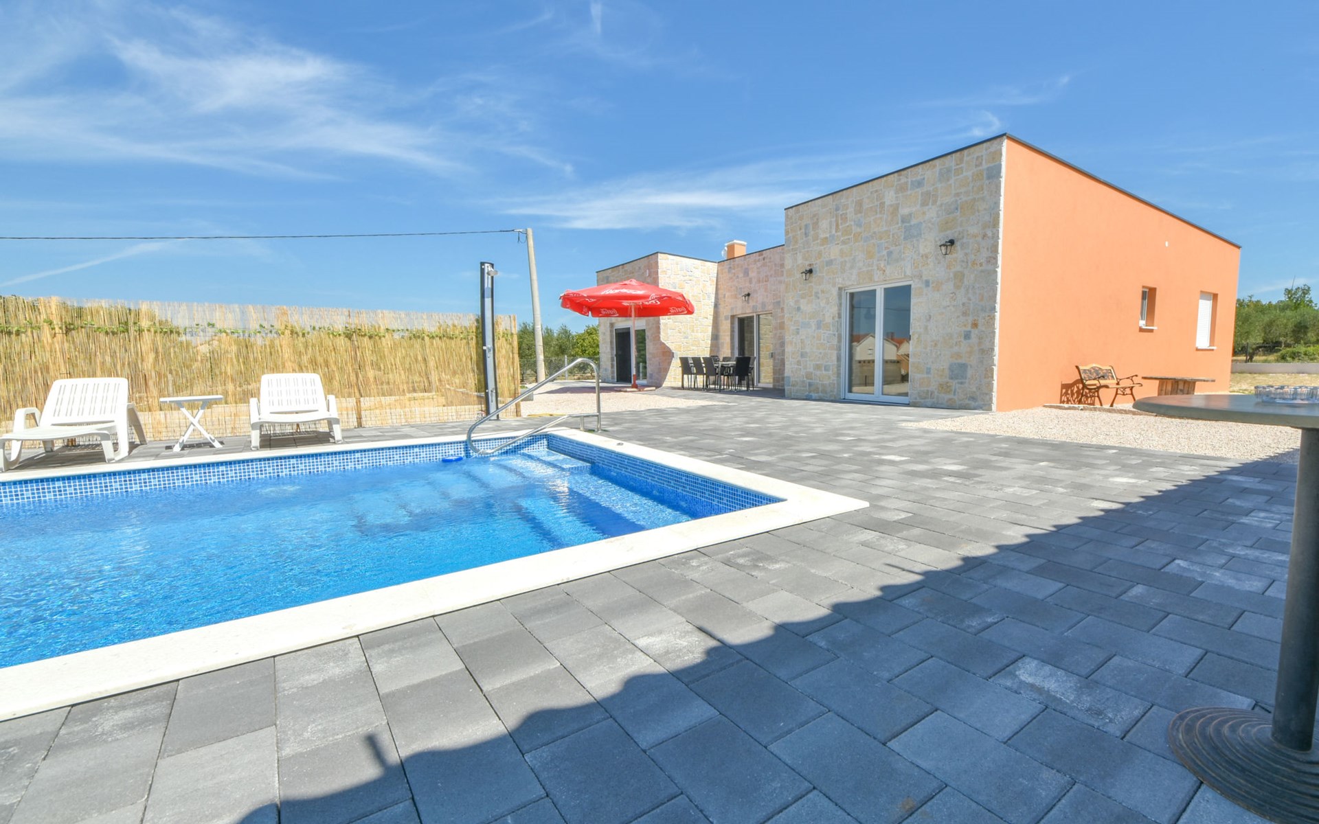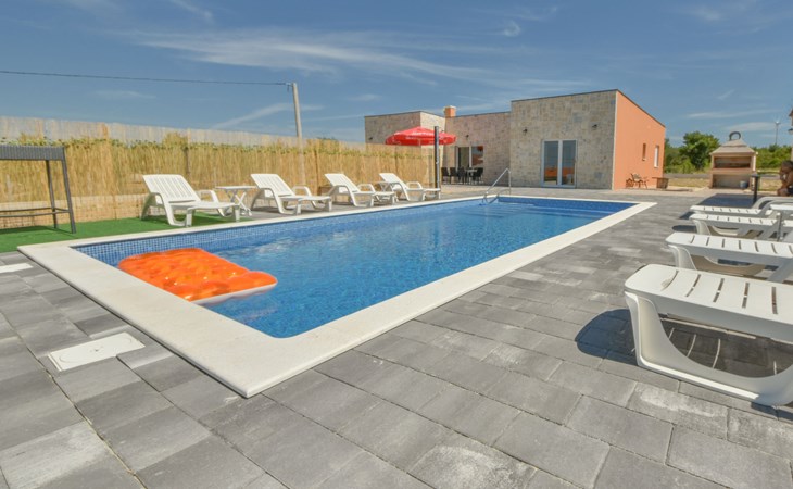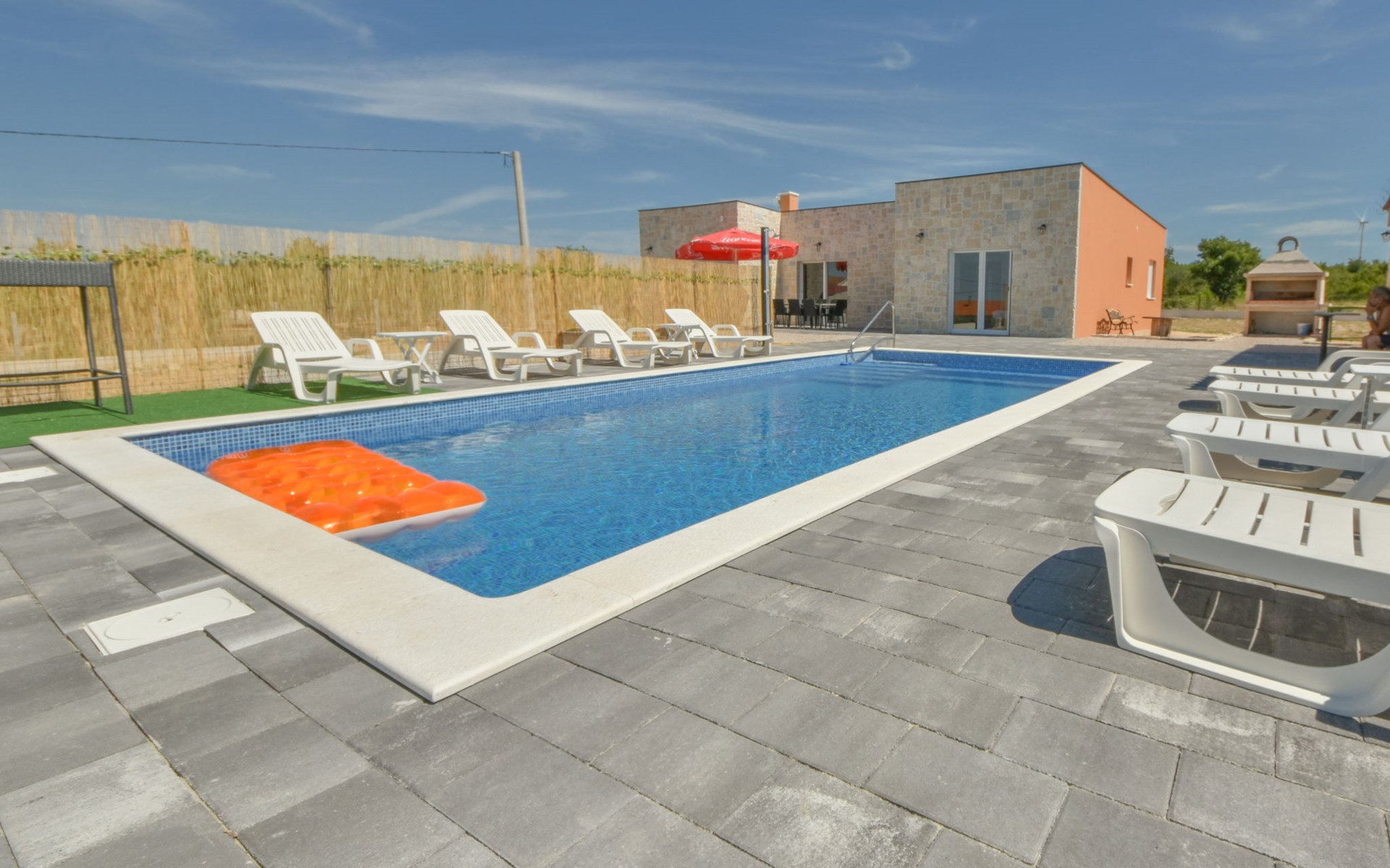 Korlat 13 km van Novigrad: Moderne eengezinswoning "Vulelija Holiday Home", bouwjaar 2024. 11 km van het centrum van Benkovac, 100 m van de bosrand, 16 km van zee. Voor alleengebruik: wild terrein 5.000 m2, openluchtzwembad hoekig, verwarmd (8 x 4 m, 145 cm diepte, seizoensgebonden beschikbaarheid: 01.Mei. - 01.Okt.). Buitendouche, terras (20 m2), tuinmeubelen, barbecue, grill. In het huis: internetaansluiting, wasmachine. Parkeerplaats (voor 4 auto's) op het terrein. Winkel 11 km, restaurant 13 km, bushalte 16.6 km, kiezelstrand 16 km.