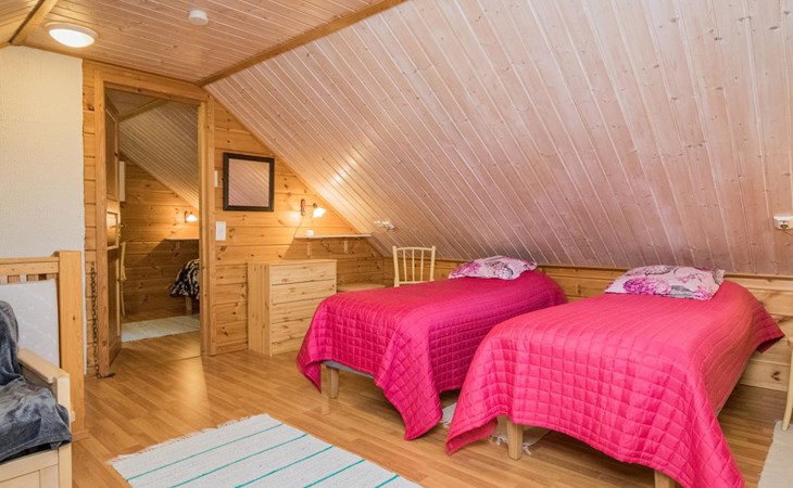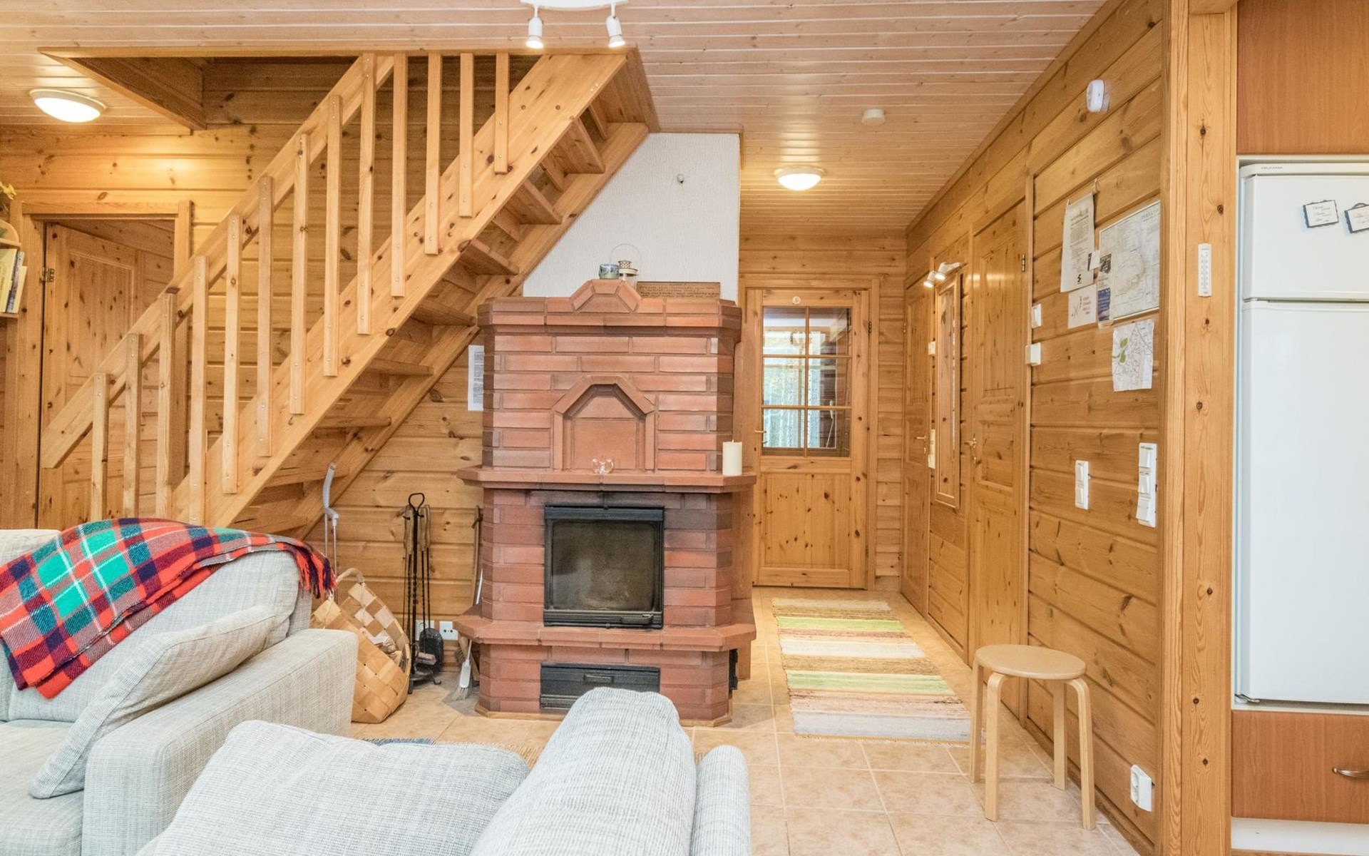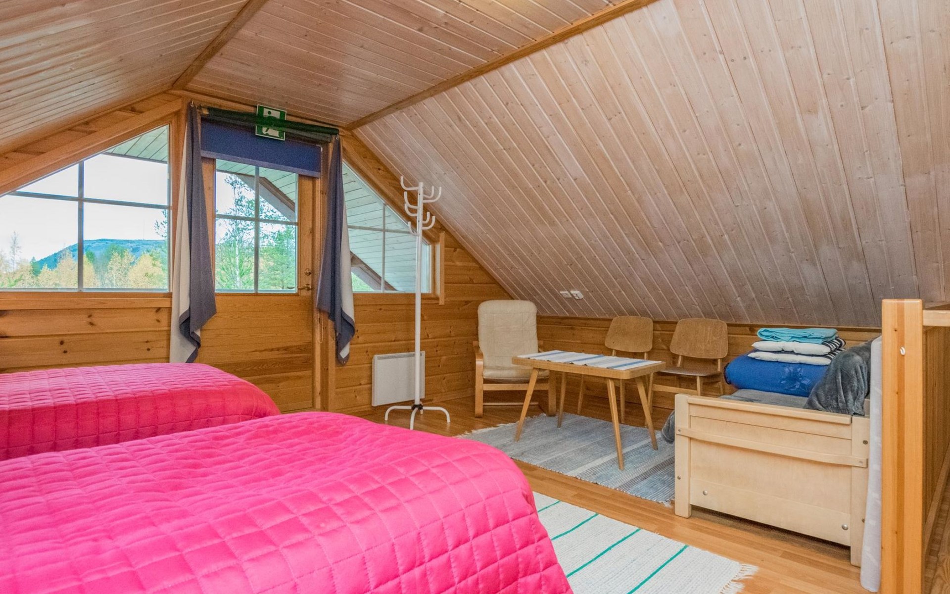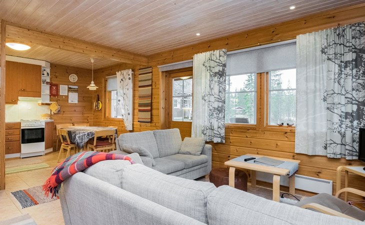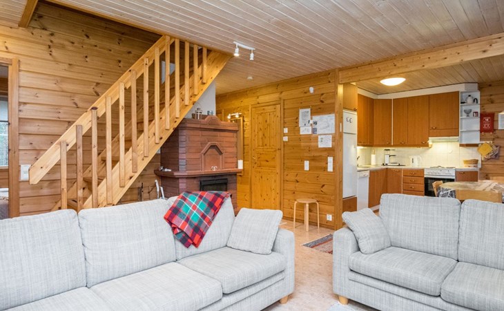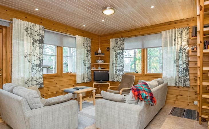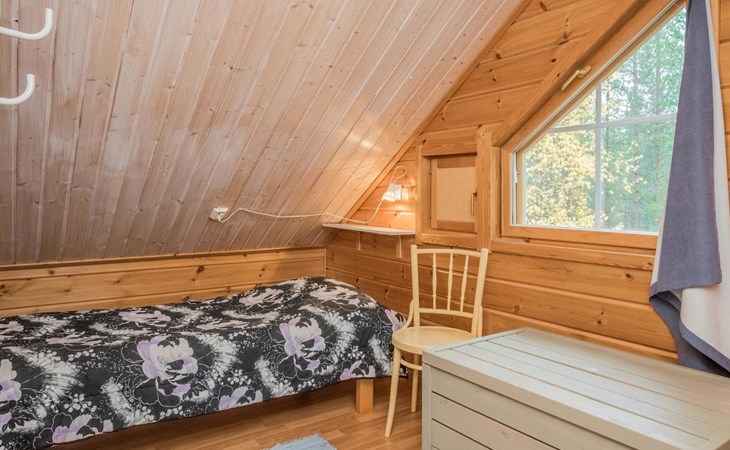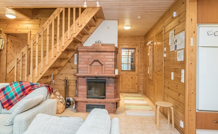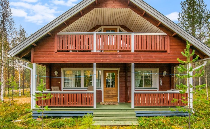 45 km north from Kemijärvi. Log cabin built in 2003. Downstairs living room/kitchen, bedroom with double bed, toilet, washroom and sauna (electric stove). Upstairs bedroom with two separate beds, in loft double bed and couch with two extra beds, balcony. Separate wood storage room and outdoor storage with ski waxing room.