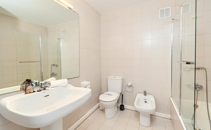- Badkamer met enkele wastafel, bad/douchecombinatie, bidet en toilet