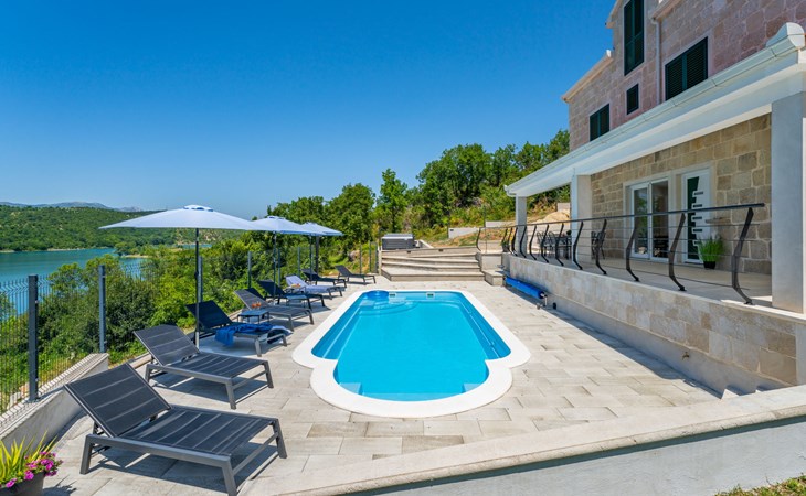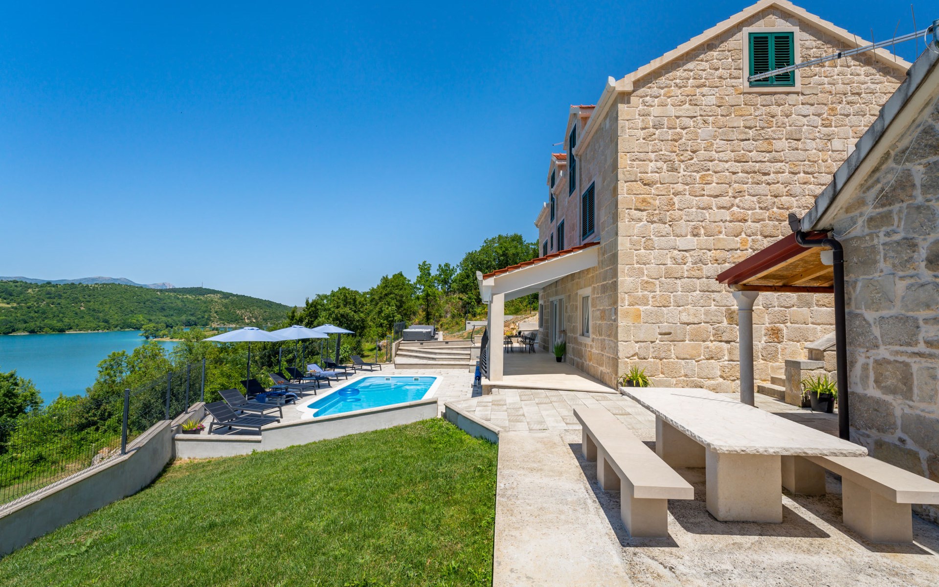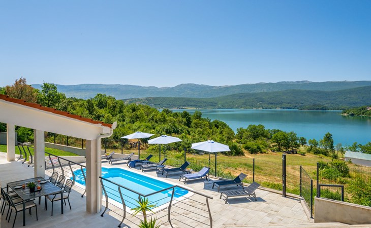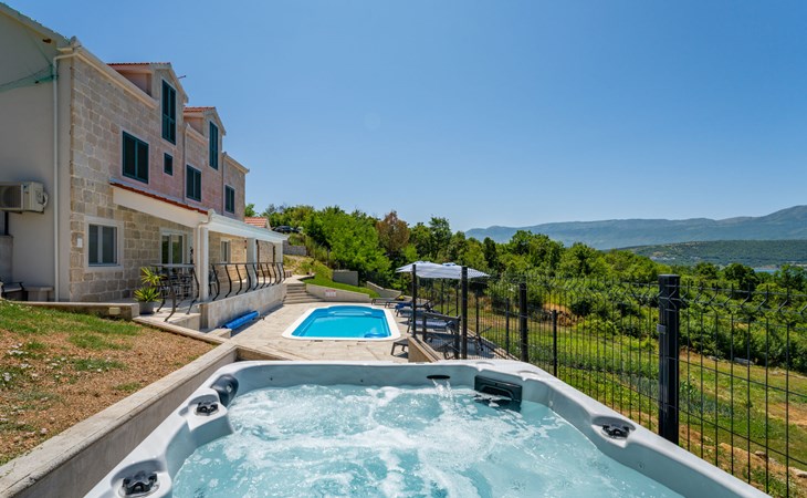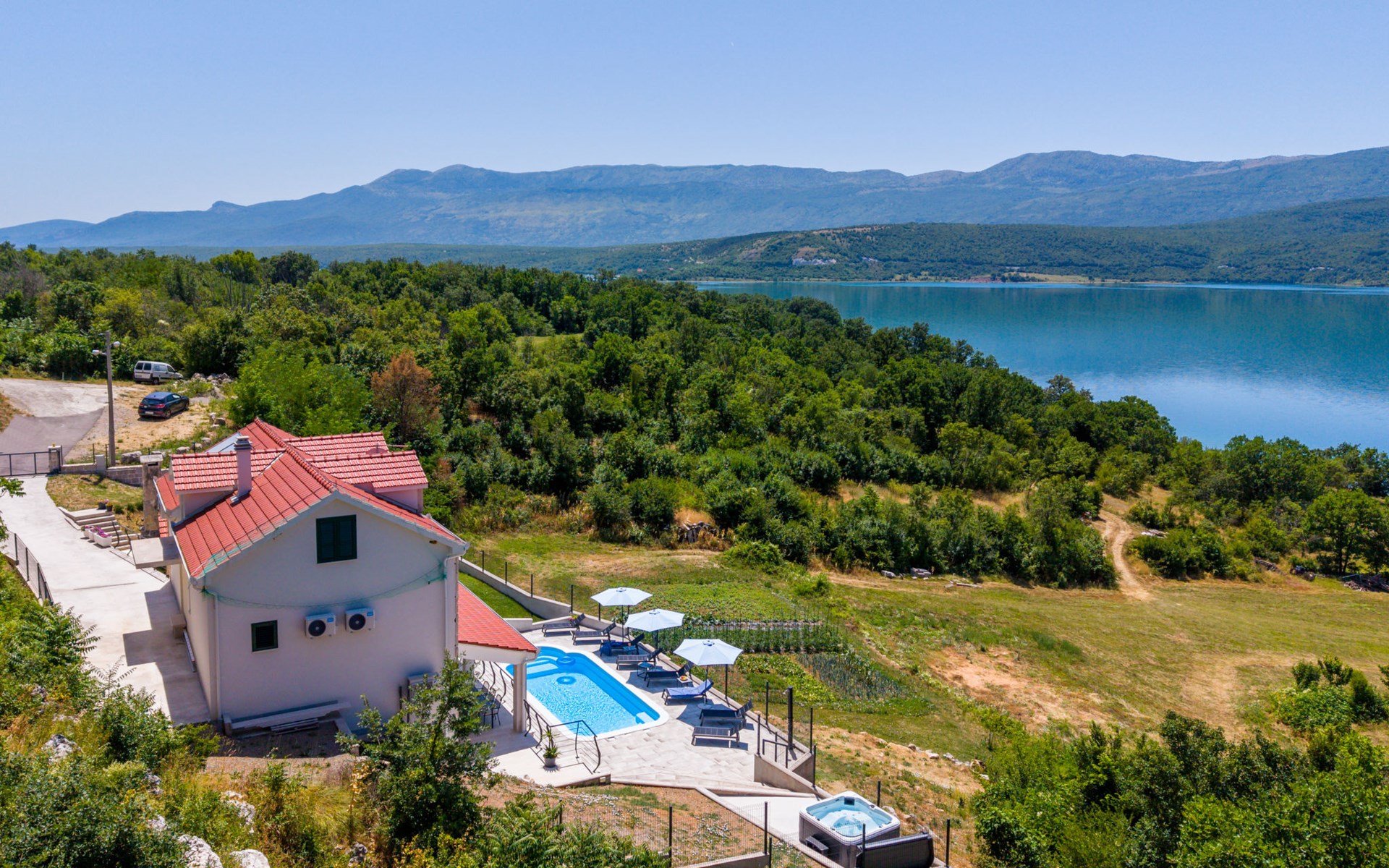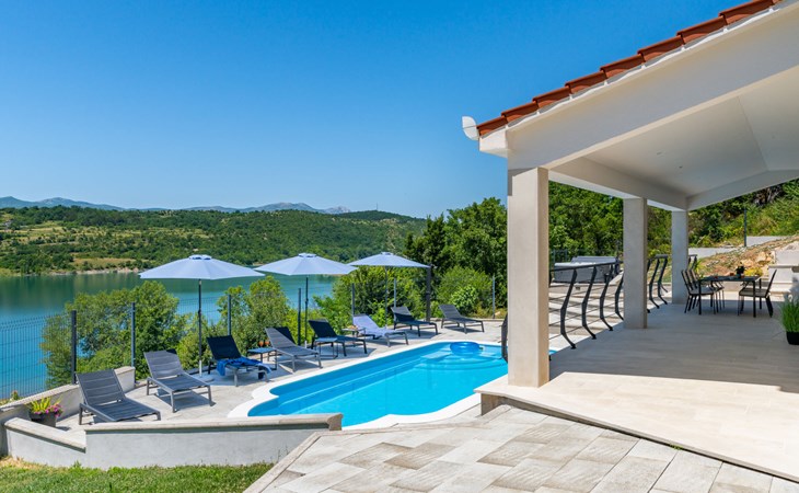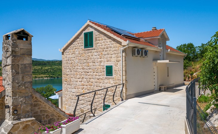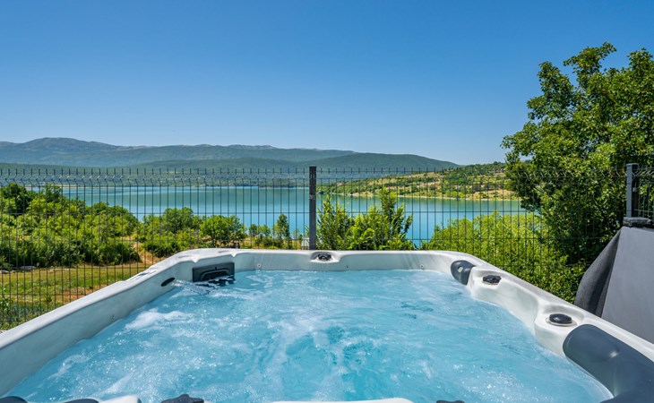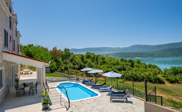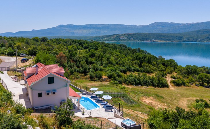 Garjak 11 km van Vrlika: Eengezinswoning "Escape on lake". Rustige, zonnige, verhoogde ligging, 65 km van zee, 20 m van het meer, op het zuidwesten. Voor alleengebruik: terrein 900 m2 (omheind), openluchtzwembad verwarmd (9 x 3 m, 32 m2, 150 cm diepte, seizoensgebonden beschikbaarheid: 01.Mrt. - 01.Nov.) met trap. Buitendouche, privé-strand, hot tub, terras (45 m2), tuinmeubelen, barbecue, grill. In het huis: internetaansluiting, wasmachine, droger. Boodschappenpakket mogelijk bij aankomst. Parkeerplaats (voor 4 auto's) bij het huis op het terrein. Winkel 11 km, restaurant 11 km, café 11 km, bushalte 11 km, kiezelstrand 68 km, meer (zwemmen) "Peručko jezero" 20 m. Fietspad 1 km. Attracties in de buurt: Vrelo Cetine 11 km, NP Krka 54 km. Bekende meren kunnen gemakkelijk worden bereikt: Peručko jezero 20 m. Op aanvraag kan een transfer vanaf de luchthaven naar de vakantiewoning geregeld worden.