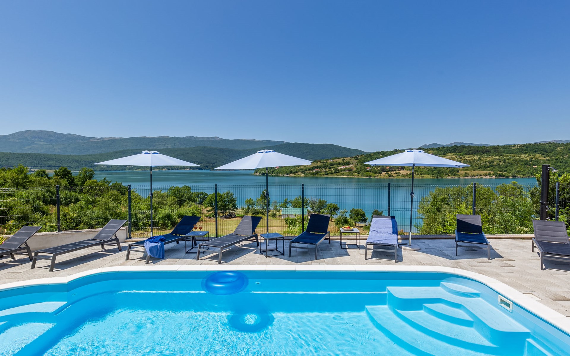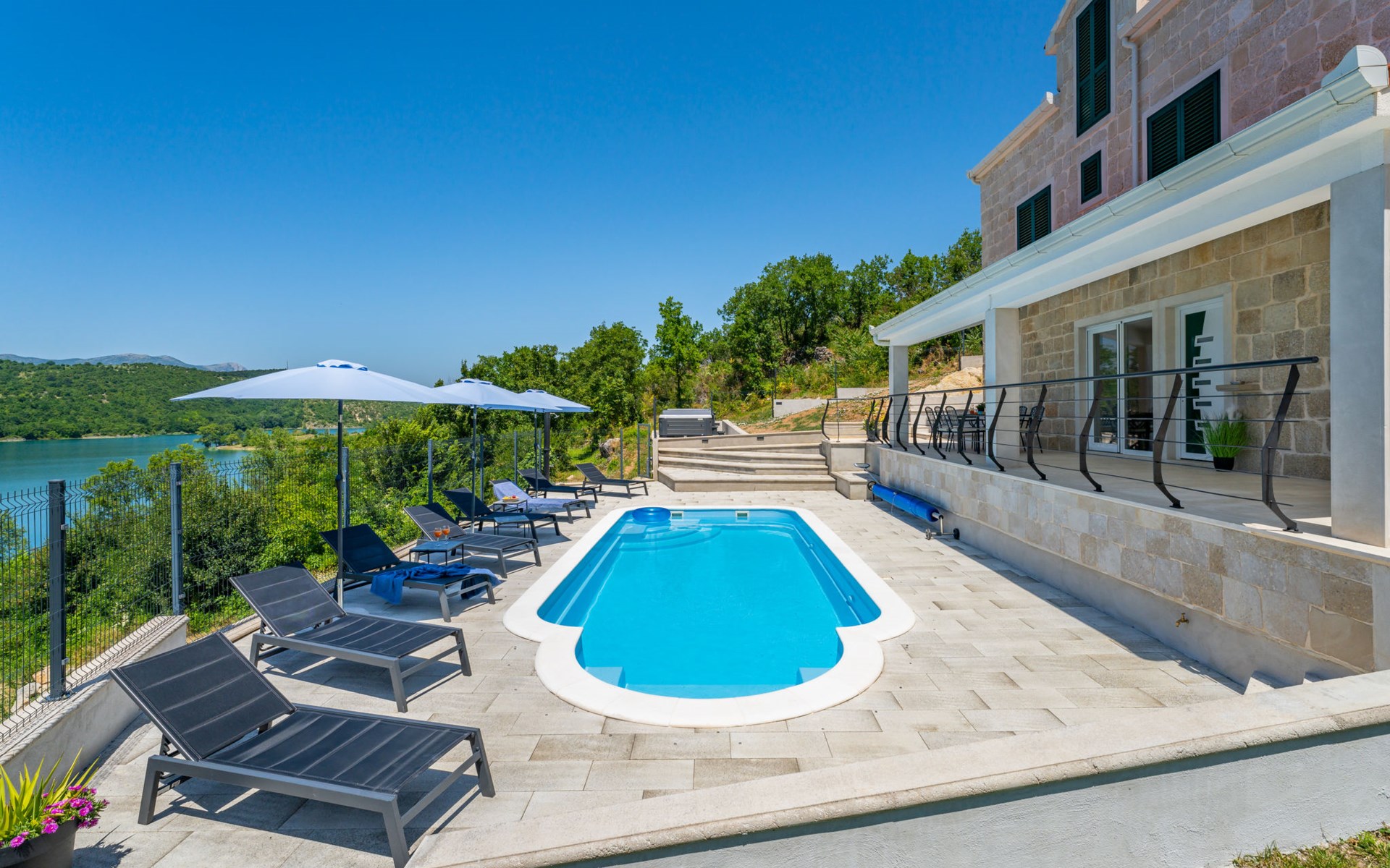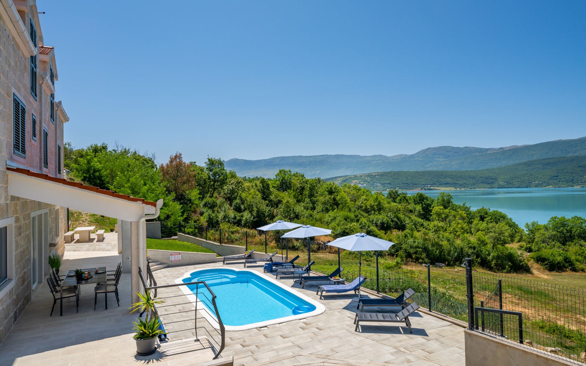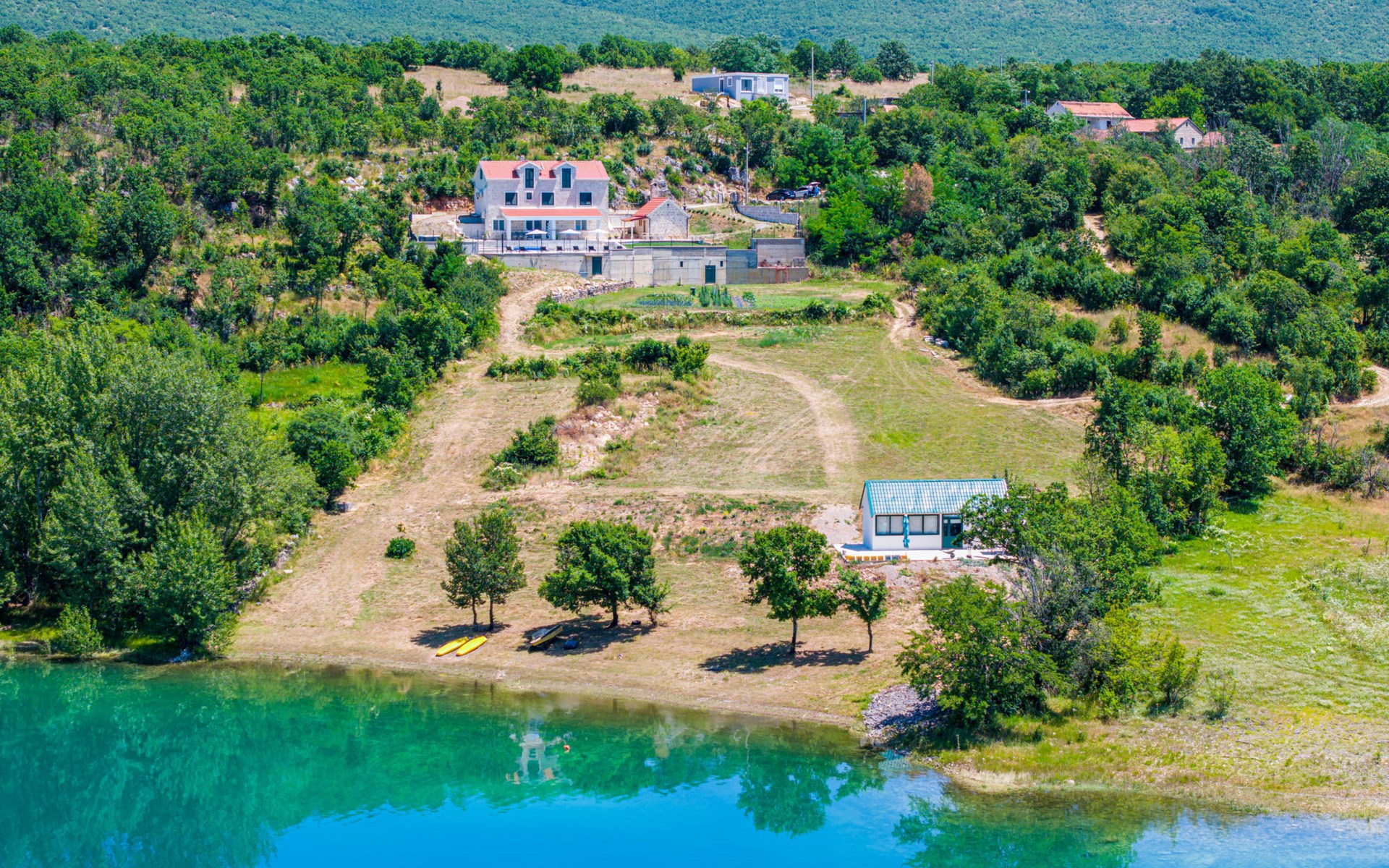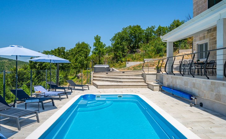 Garjak 11 km van Vrlika: Eengezinswoning "Escape on lake". Rustige, zonnige, verhoogde ligging, 65 km van zee, 20 m van het meer, op het zuidwesten. Voor alleengebruik: terrein 900 m2 (omheind), openluchtzwembad verwarmd (9 x 3 m, 32 m2, 150 cm diepte, seizoensgebonden beschikbaarheid: 01.Mrt. - 01.Nov.) met trap. Buitendouche, privé-strand, hot tub, terras (45 m2), tuinmeubelen, barbecue, grill. In het huis: internetaansluiting, wasmachine, droger. Boodschappenpakket mogelijk bij aankomst. Parkeerplaats (voor 4 auto's) bij het huis op het terrein. Winkel 11 km, restaurant 11 km, café 11 km, bushalte 11 km, kiezelstrand 68 km, meer (zwemmen) "Peručko jezero" 20 m. Fietspad 1 km. Attracties in de buurt: Vrelo Cetine 11 km, NP Krka 54 km. Bekende meren kunnen gemakkelijk worden bereikt: Peručko jezero 20 m. Op aanvraag kan een transfer vanaf de luchthaven naar de vakantiewoning geregeld worden.
