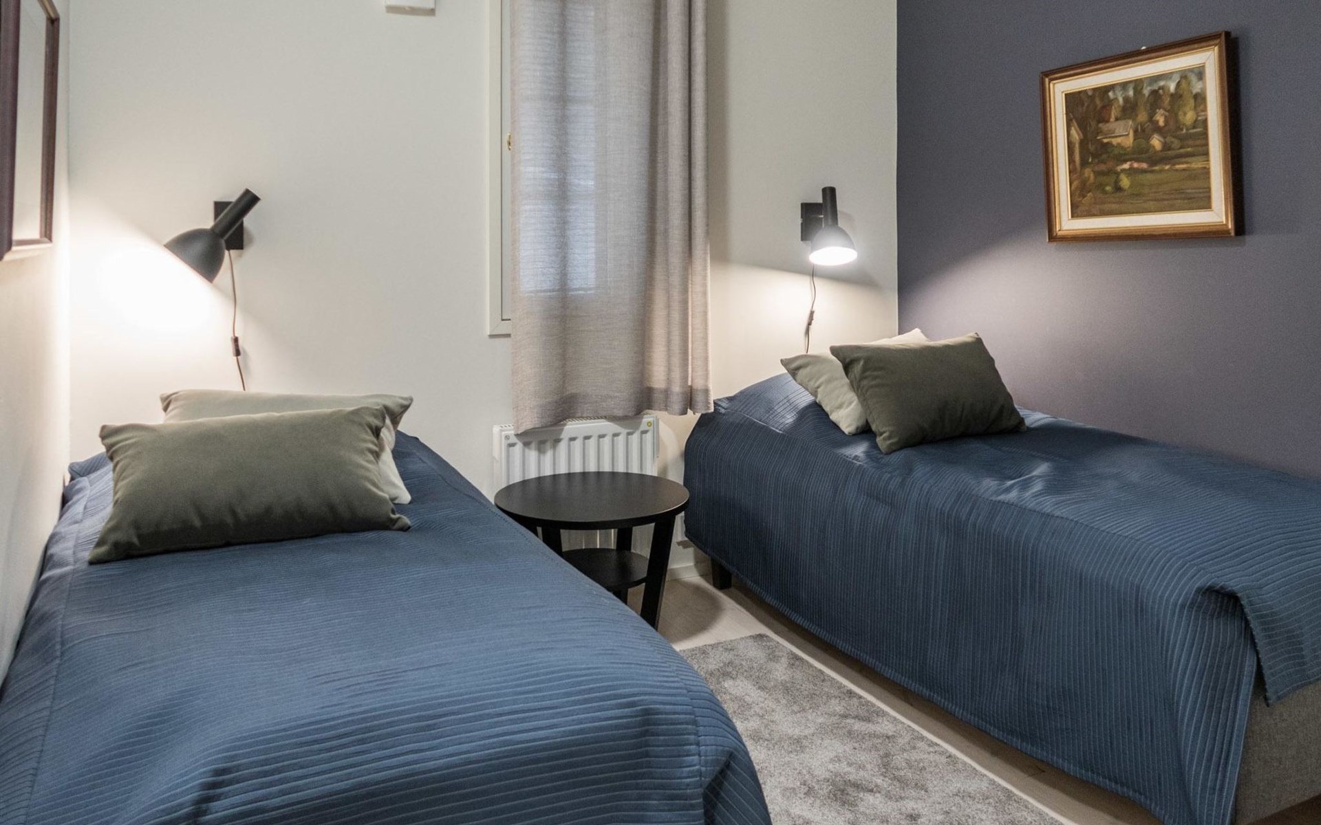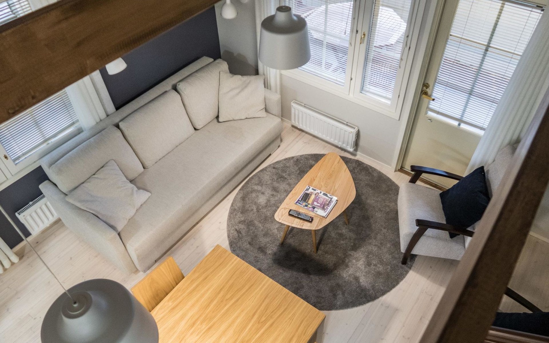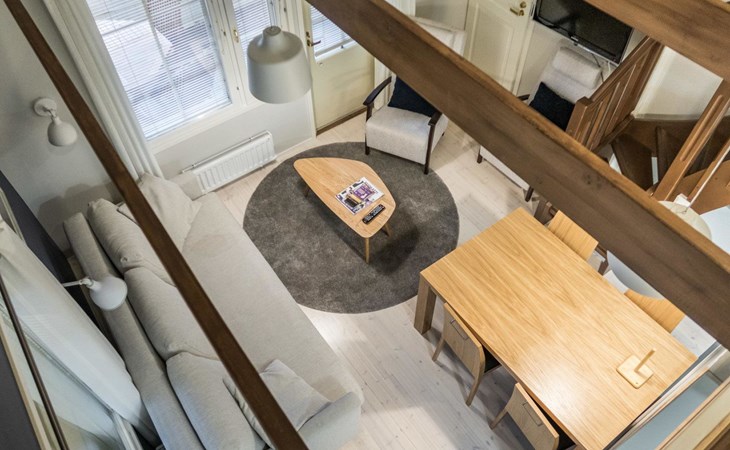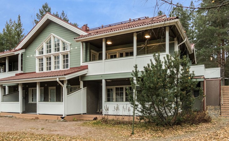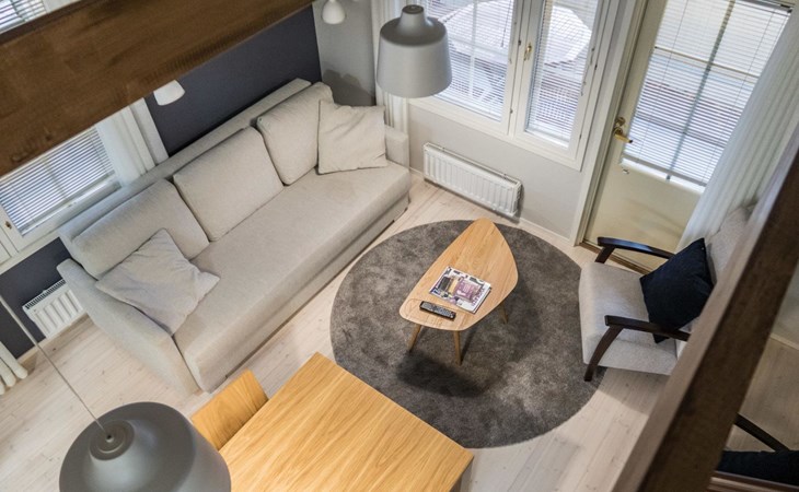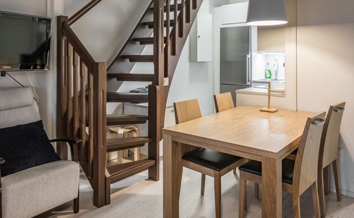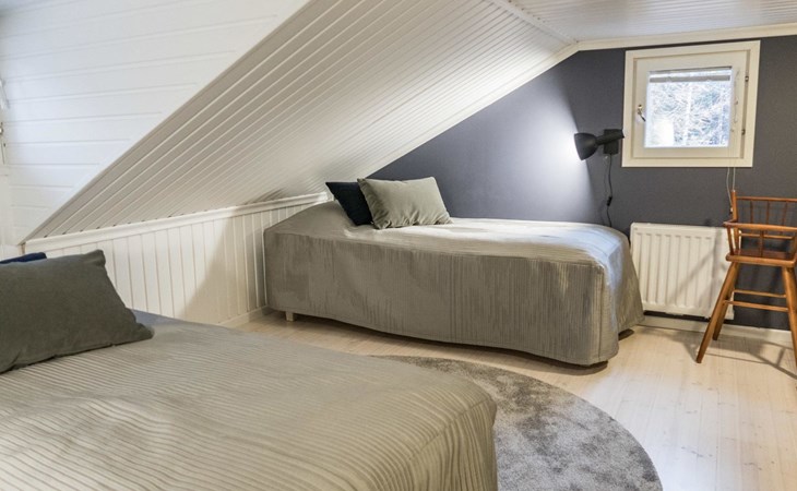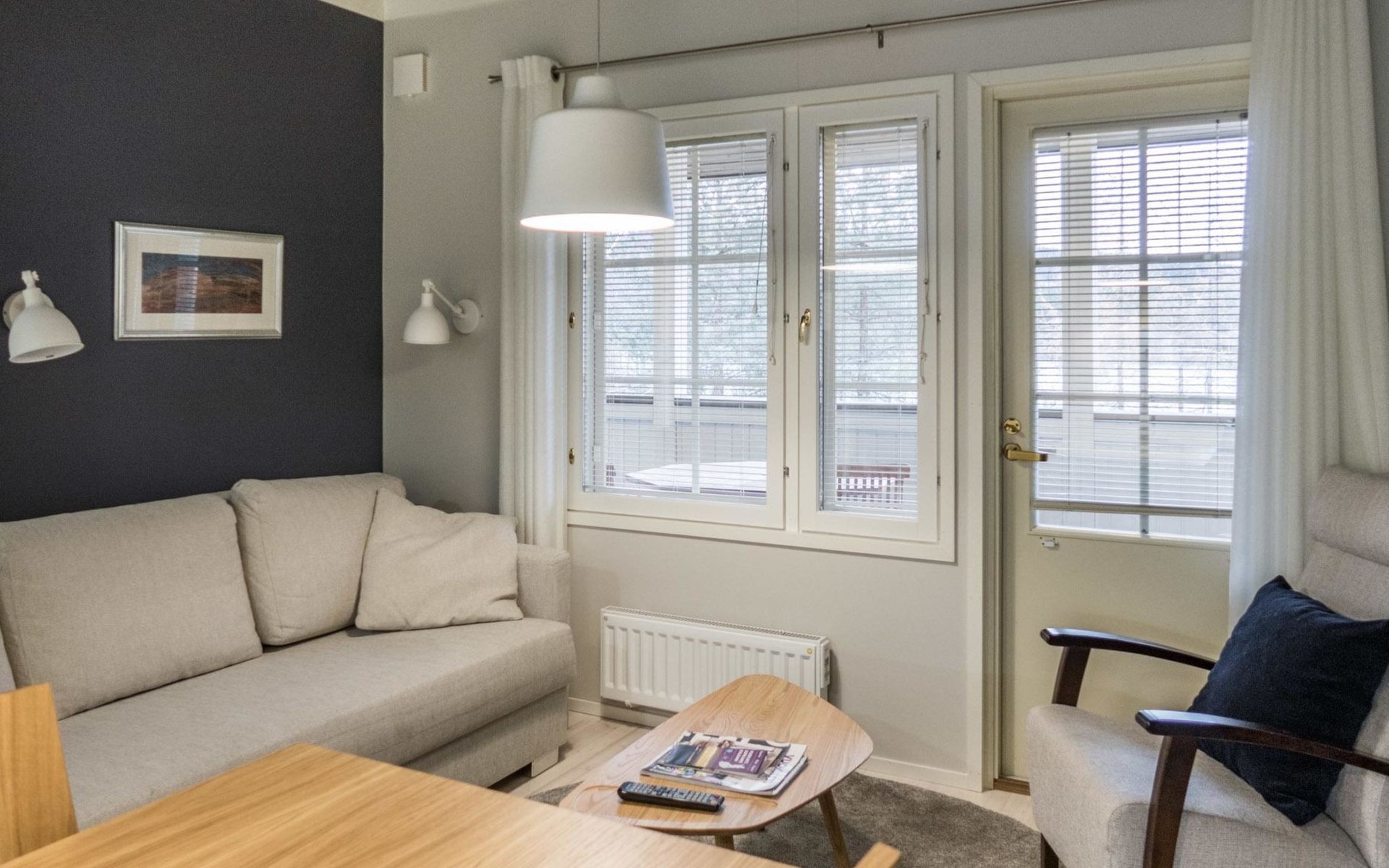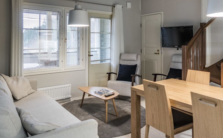 Mustikka - apartment is 40 m² + 15 m² balcony. There is a combination of livingroom/kitchen, with sofabed for 1-2 persons. One bedroom with separate beds for 2 persons. 2. floor is separate beds for two. Shower / toilet, sauna (electric heating), terrace. Shared swimming place, distance about 50 m.