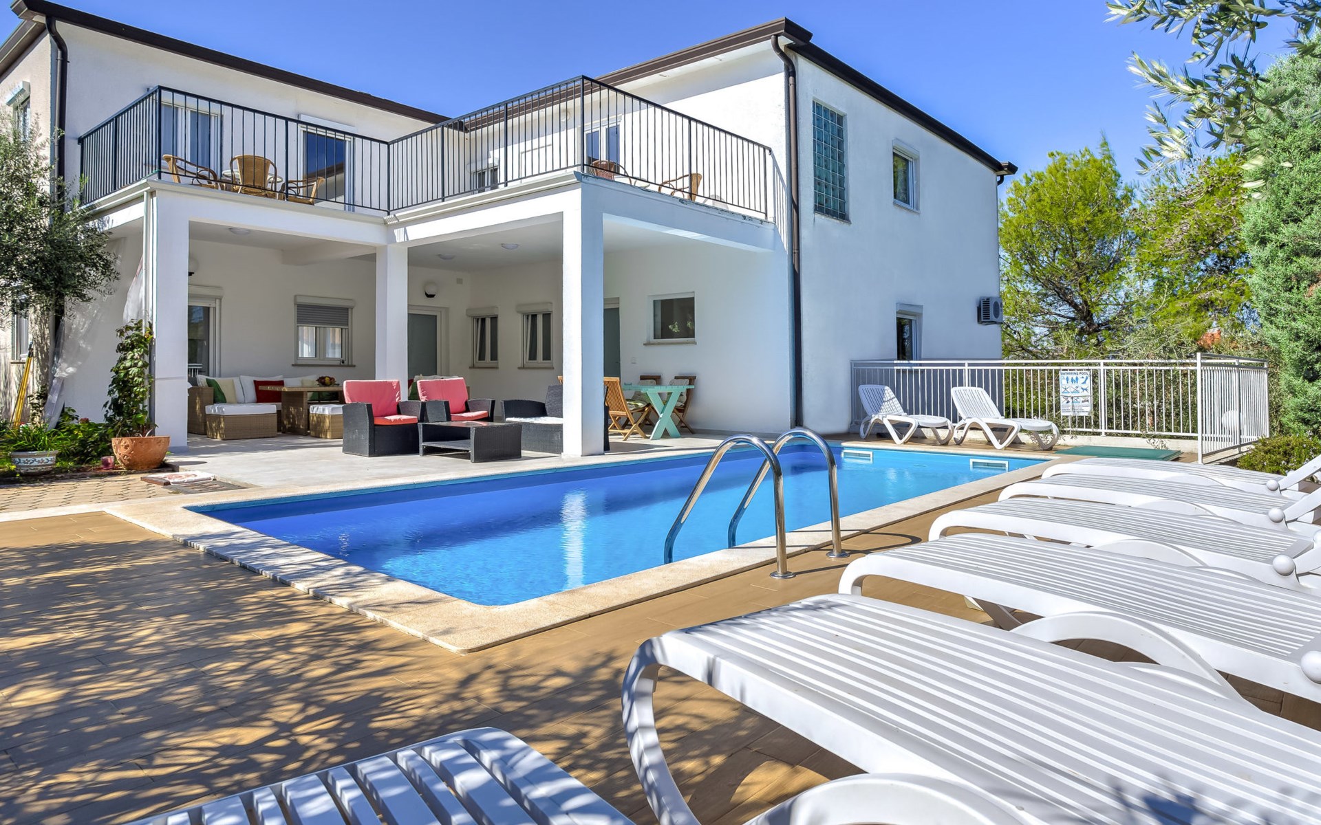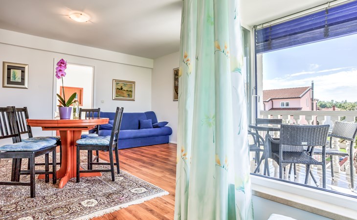 Appartementencomplex "File". In de wijk Zambratija, 3 km van het centrum van Umag, 300 m van zee, 300 m van het strand, aan een doodlopende weg. Voor medegebruik: terrein 1.000 m2 (omheind) met gazon 100 m2, planten, openluchtzwembad (7 x 4 m, 140 cm diepte, seizoensgebonden beschikbaarheid: 01.Mei. - 15.Sep.). Buitendouche, terras (50 m2), tuinmeubelen, barbecue. In het huis: Internet (WiFi). Parkeerplaats bij het huis. Winkel 500 m, restaurant 100 m, bushalte 5.1 km, kiezelstrand 600 m, stenenstrand, rotsstrand 300 m, strandbad 600 m. Sportcentrum 600 m, kinderspeelplaats 50 m. De eigenaar woont op hetzelfde terrein. Vergelijkbare accommodaties kunnen worden geboekt. WIFI limited speed. Strand met zandbodem, vlak aflopend 600 m. Station van de mini-spoorbaan naar Umag 600 m.