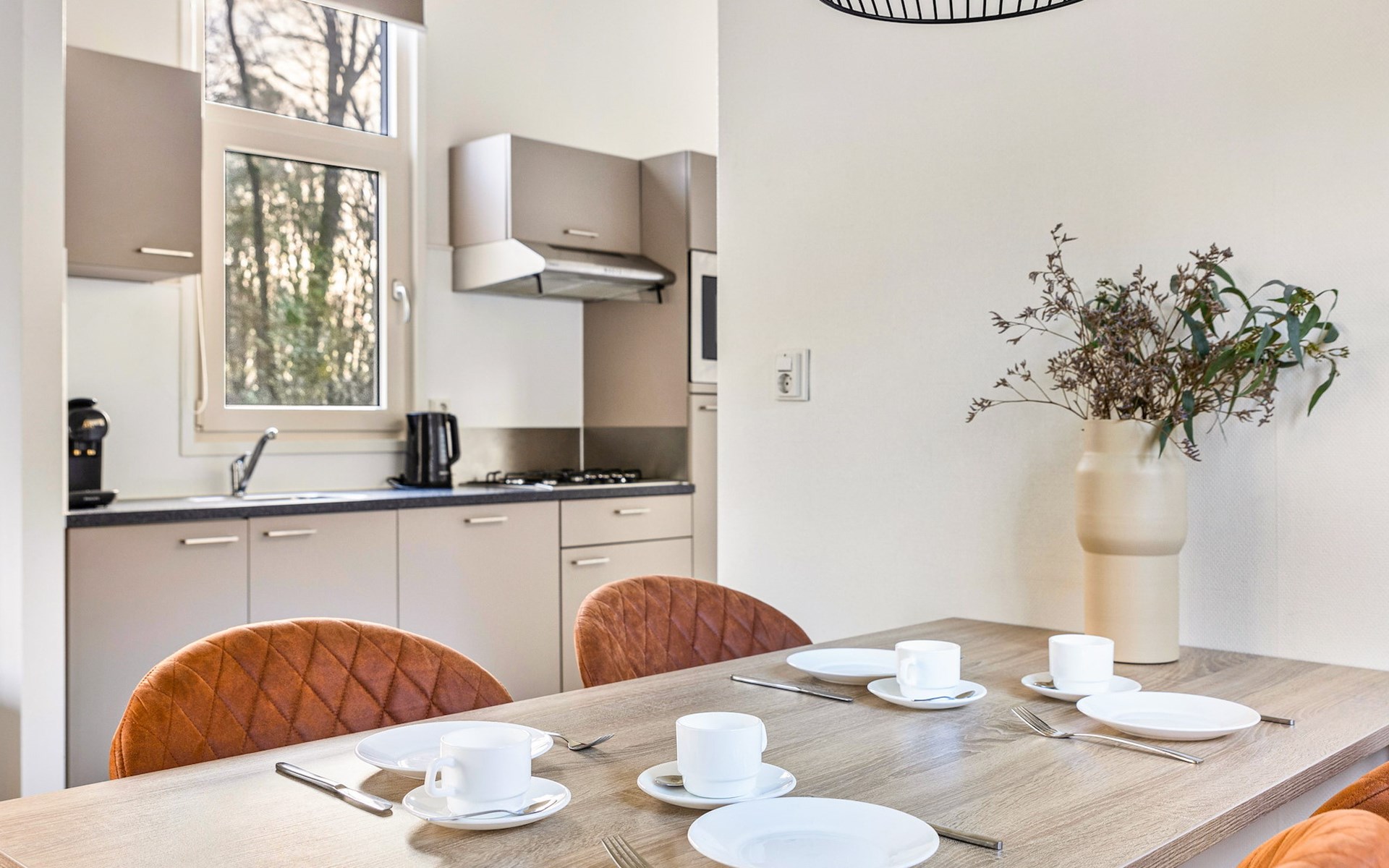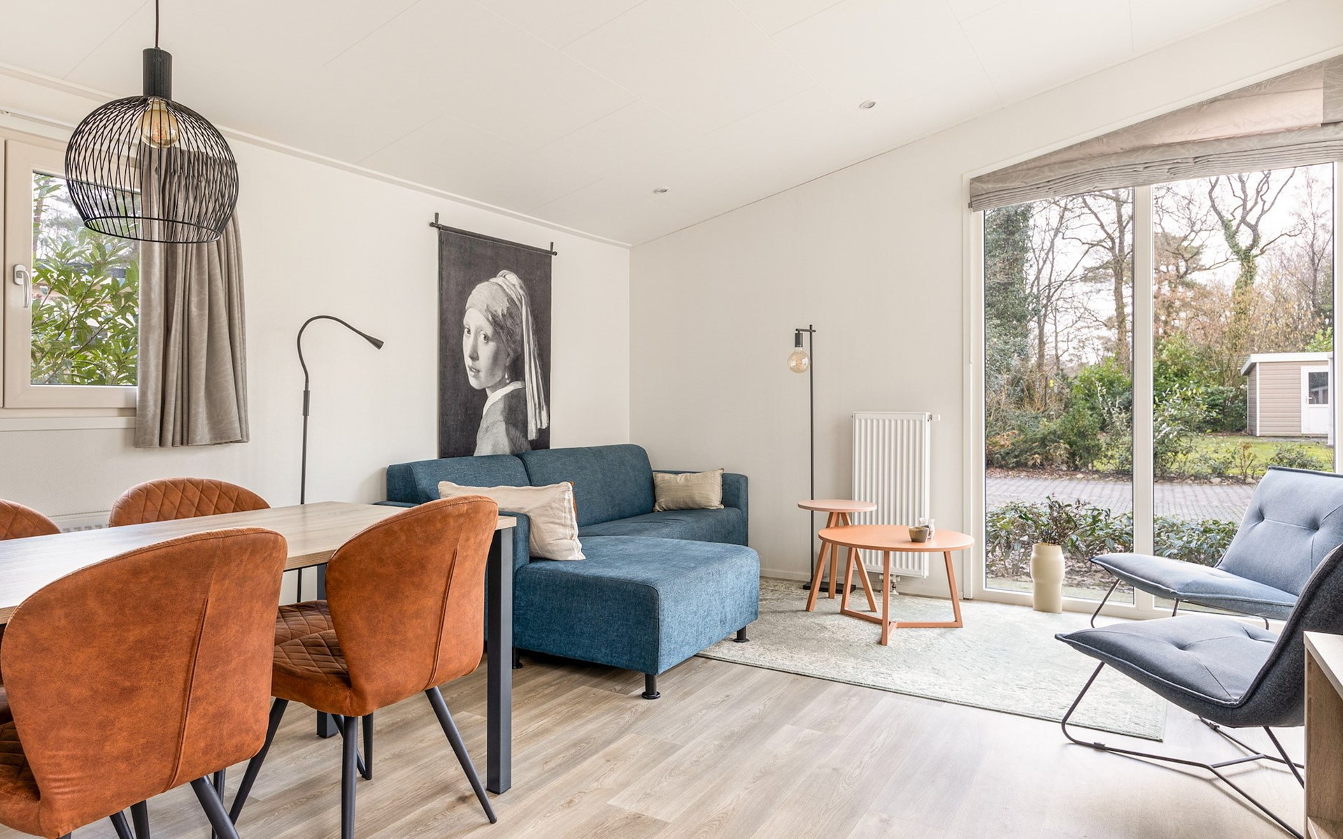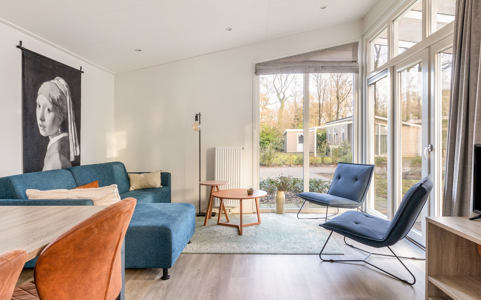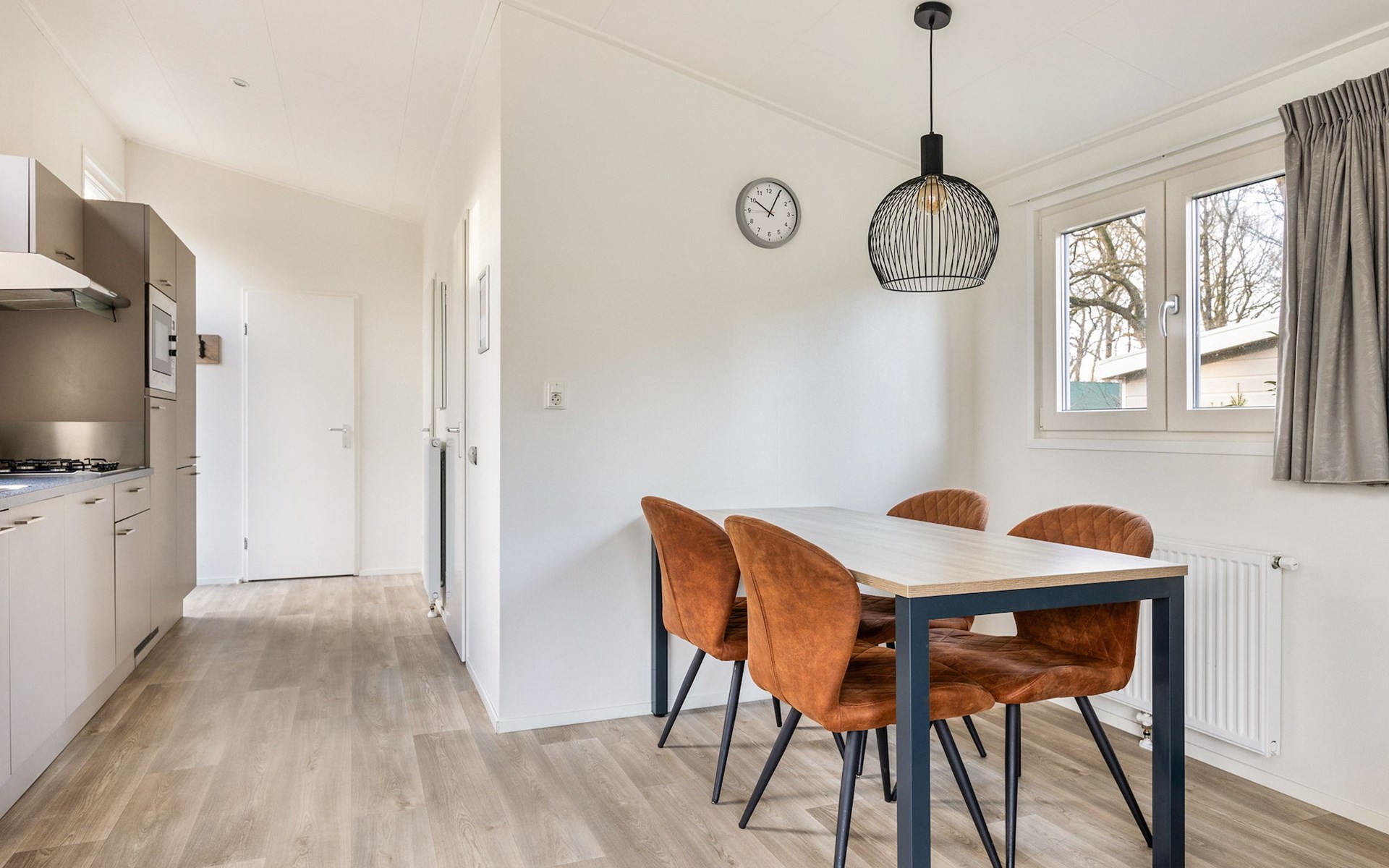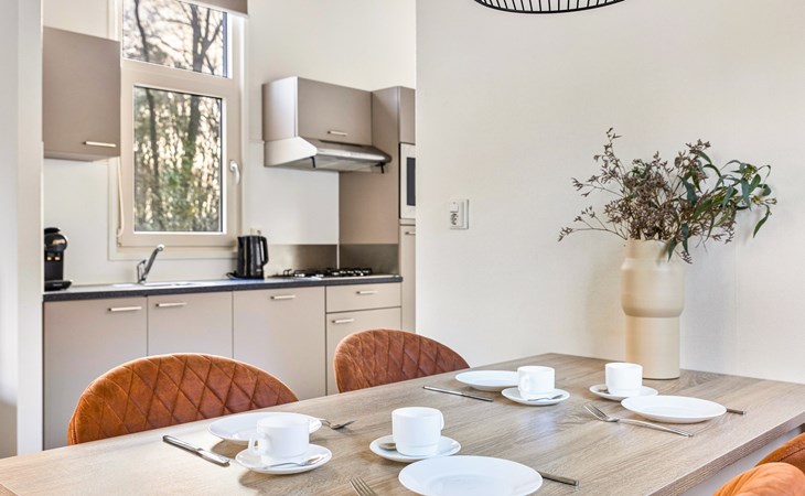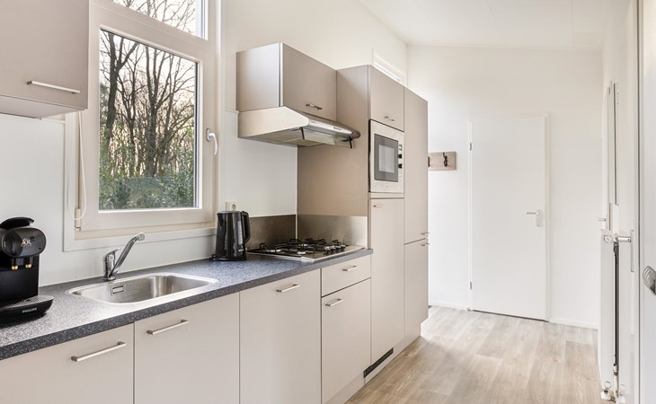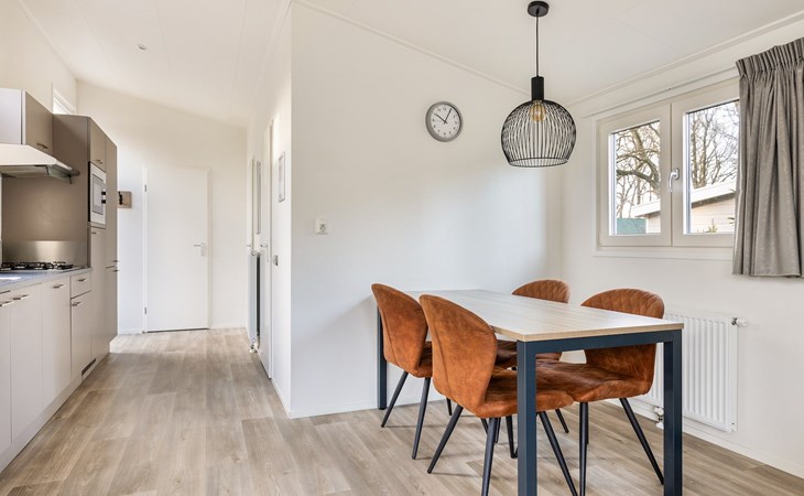 De woonkamer is ingericht met een zithoek, welke grenst aan de open keuken met een eethoek. Deze keuken is voorzien van onder andere een koelkast, filterkoffiezetapparaat, combimagnetron en een vaatwasser.