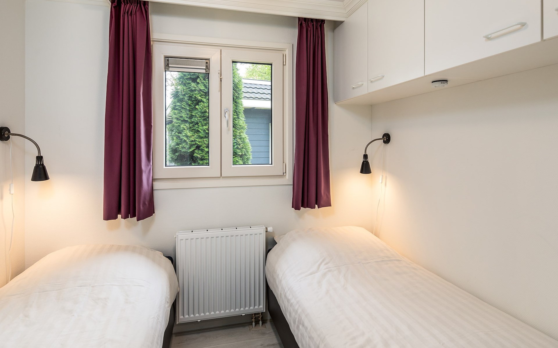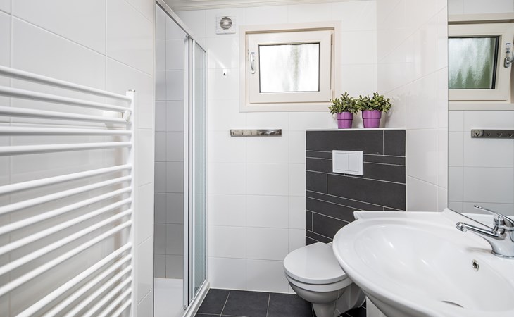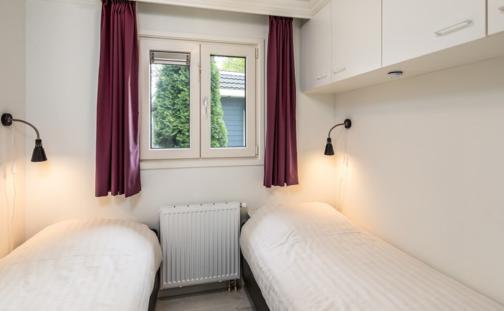 Het chalet heeft 2 slaapkamers met elk 2 éénpersoonsbedden of 1 slaapkamer met 2 éénpersoonsbedden en een stapelbed op de andere slaapkamer. De badkamer beschikt over een douche, een wastafel en een toilet.