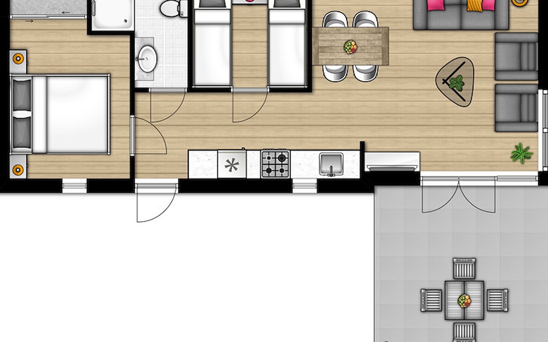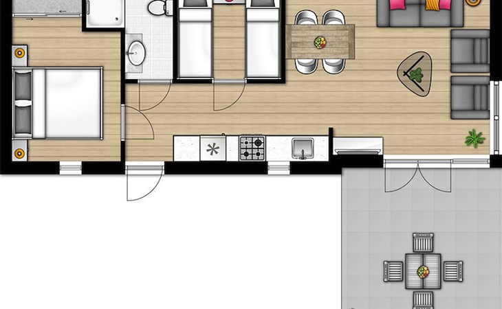 Een aantal chalets beschikt over extra voorzieningen zoals een omheinde tuin of zonneligbedden. Wil je een chalet met extra voorzieningen als voorkeur opgeven? Neem dan telefonisch contact op met ons Customer Contact Center. Voor het plaatsen van een voorkeursboeking geldt mogelijk een toeslag. De accommodatie kan anders zijn ingedeeld en ingericht. Plattegronden en afbeeldingen zijn voorbeelden.