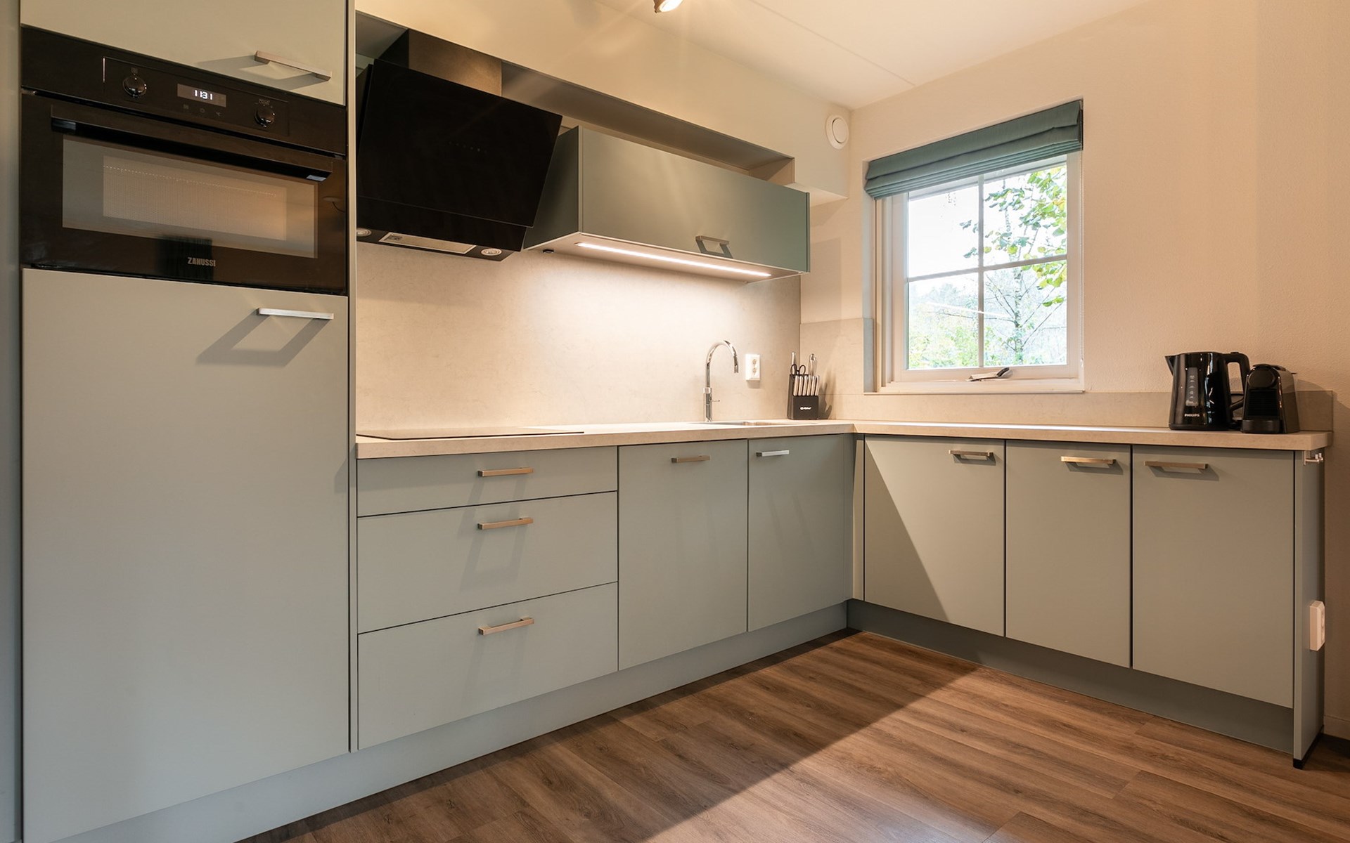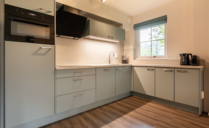 De woonkamer is ingericht met een zithoek, welke grenst aan de open keuken met een eethoek. Deze keuken is voorzien van onder andere een koelkast met vriesvak, filterkoffiezetapparaat, combimagnetron en een vaatwasser.