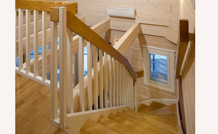 Upstairs: bedroom with double bed (160 cm wide), bedroom with 2 beds (80 cm and 120 cm wide), lounge sofa-bed, bathroom, balcony.