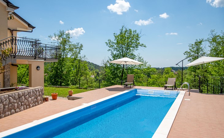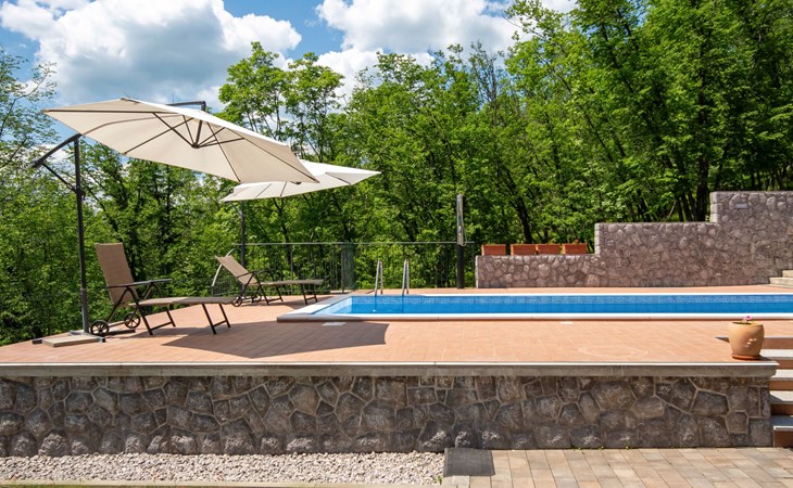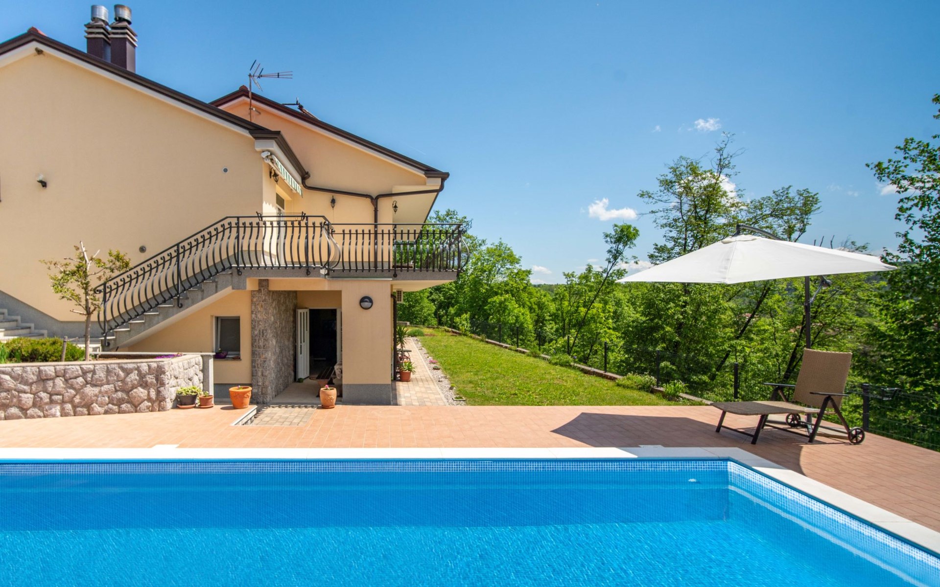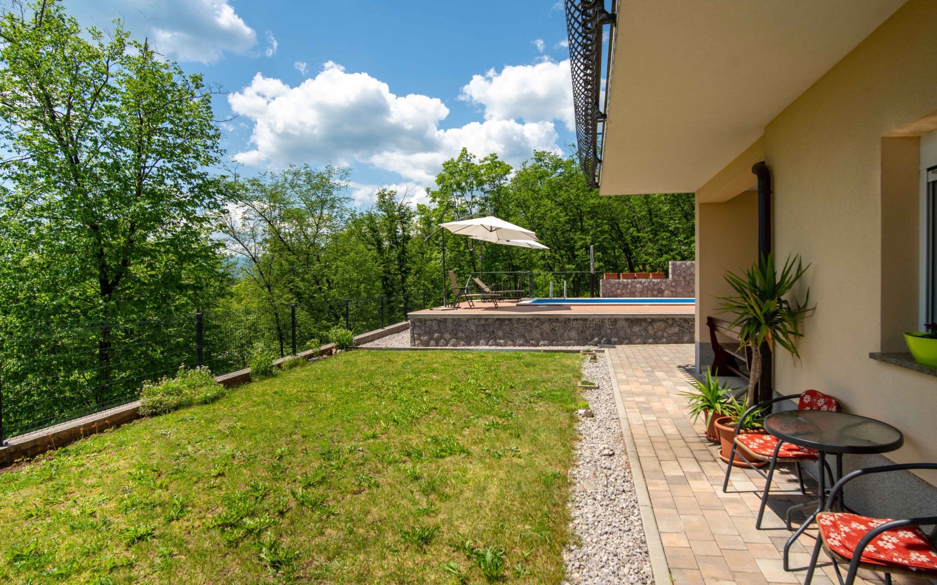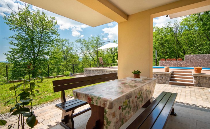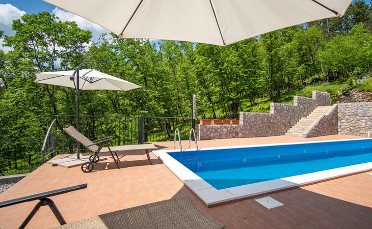 Eengezinswoning "Korina", van 2 verdiepingen. 1.3 km van het centrum van Klana, 19 km van het centrum van Opatija, 15 km van het centrum van Matulji, rustige, zonnige, verhoogde ligging, direct aan de bosrand, 17 km van zee, 17 km van het strand, aan een doodlopende weg. Voor alleengebruik: terrein 1.200 m2 (omheind) met gazon 130 m2, openluchtzwembad hoekig (12 x 3 m, 145 cm diepte, seizoensgebonden beschikbaarheid: 01.Mei. - 30.Sep.). Buitendouche, barbecue, onderhoud zwembad door de eigenaar/tuinman. In het huis: internetaansluiting. Parkeerplaats bij het huis op het terrein. Winkel 1.3 km, restaurant 10 km, bushalte 500 m, kiezelstrand "Volosko" 17 km, betonnen strand 17 km. Eerste verdieping is afgesloten en niet bewoond.