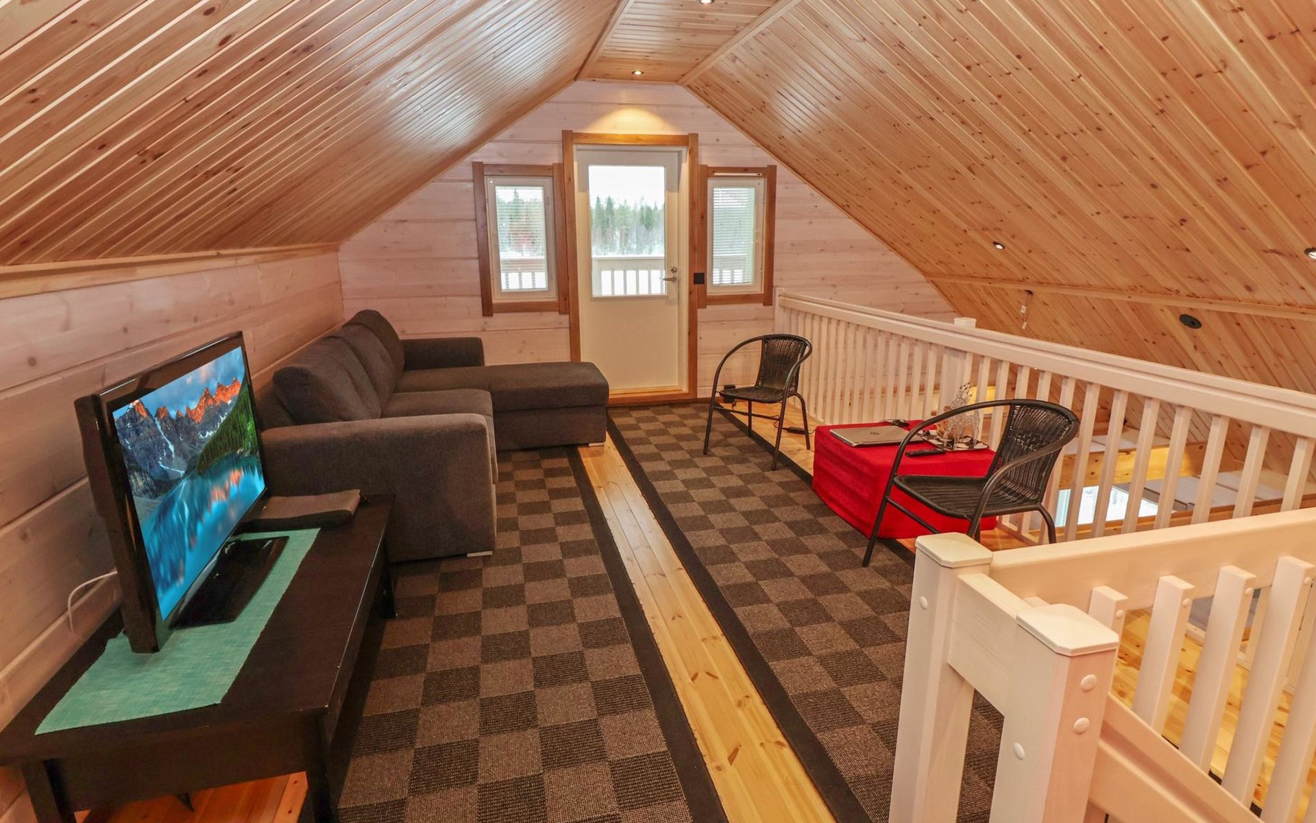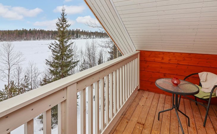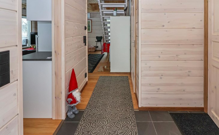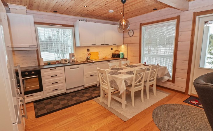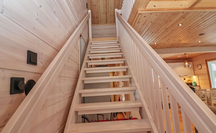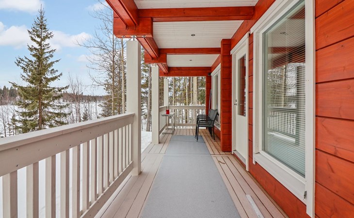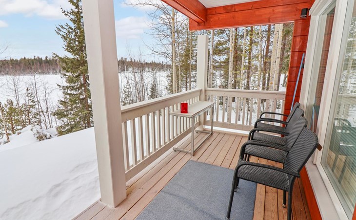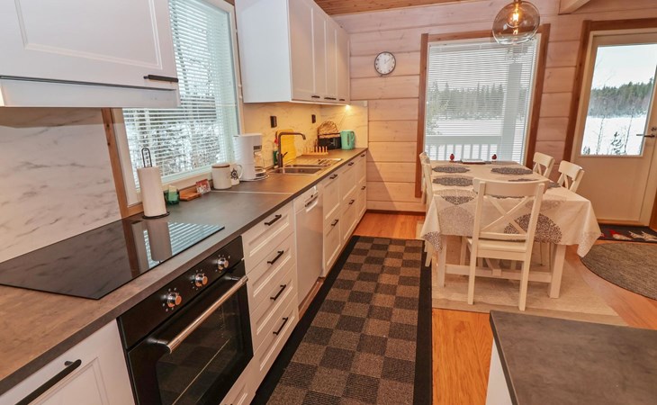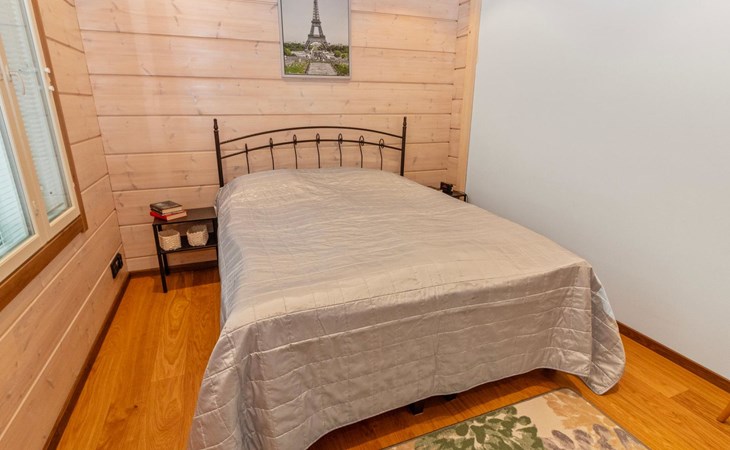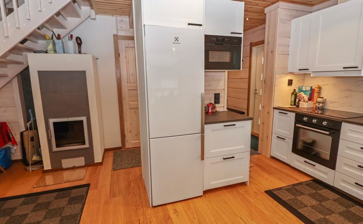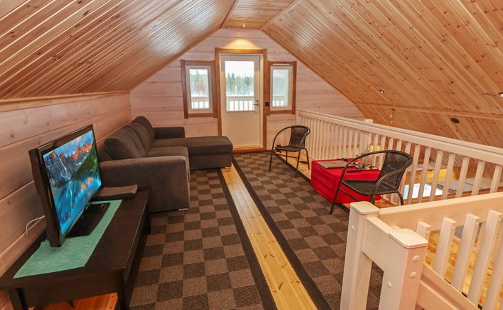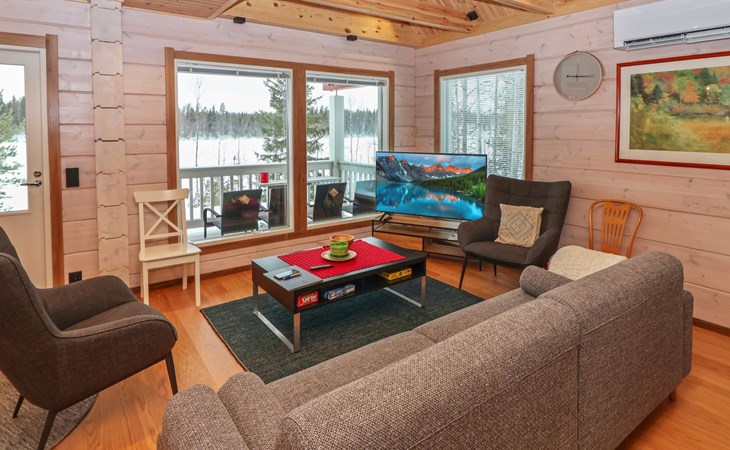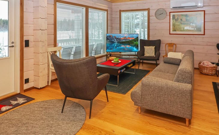 The villa features spacious and cozy accommodations, including two large bedrooms — one downstairs and one upstairs — both furnished with 160 cm wide double beds. Additionally, the loft has a comfortable sofa bed for two. A fully equipped kitchen, spacious living area with a fireplace, a bathroom, and an electric sauna complete the amenities. Large windows and the terrace provide stunning views of the River Tornionjoki.