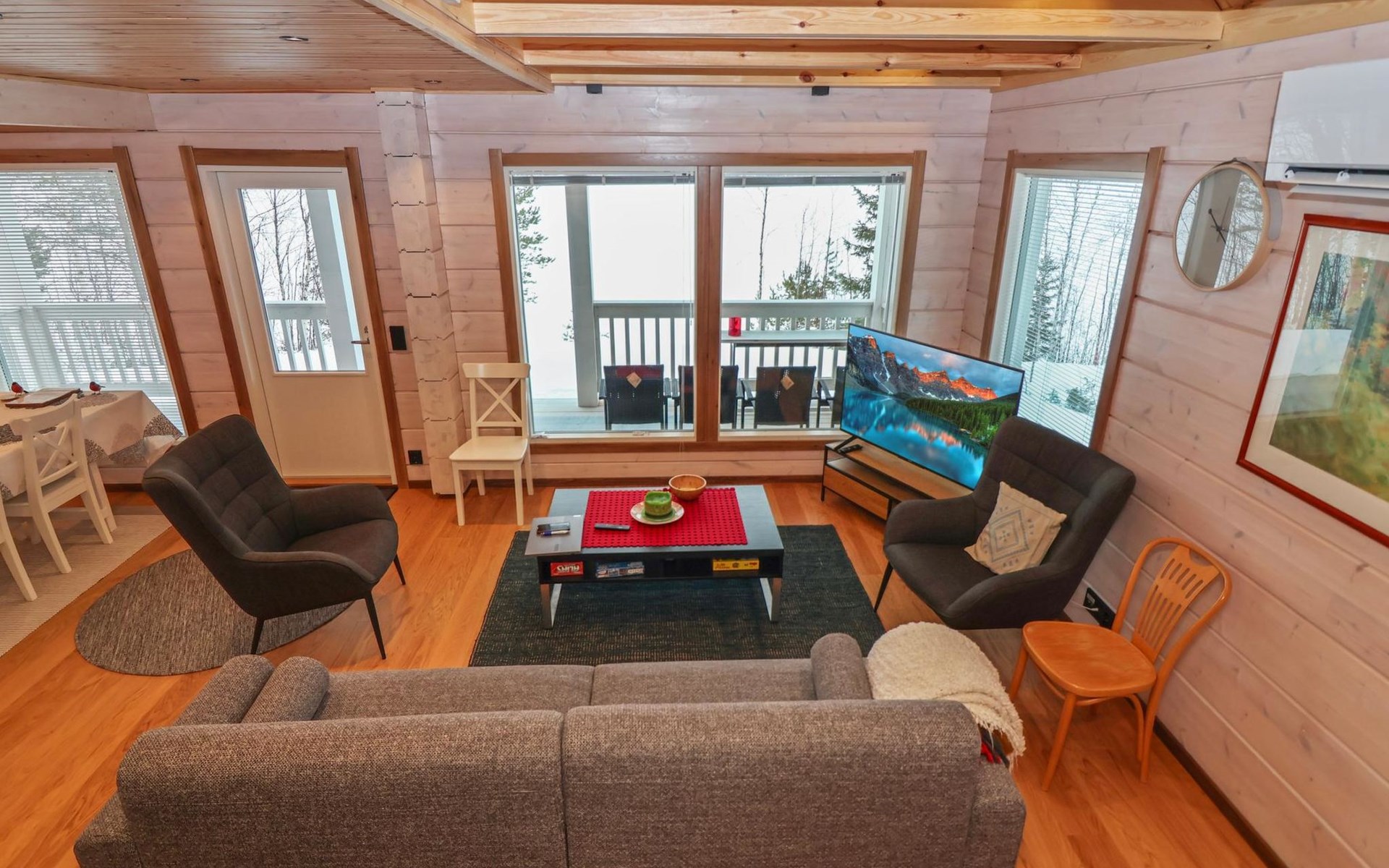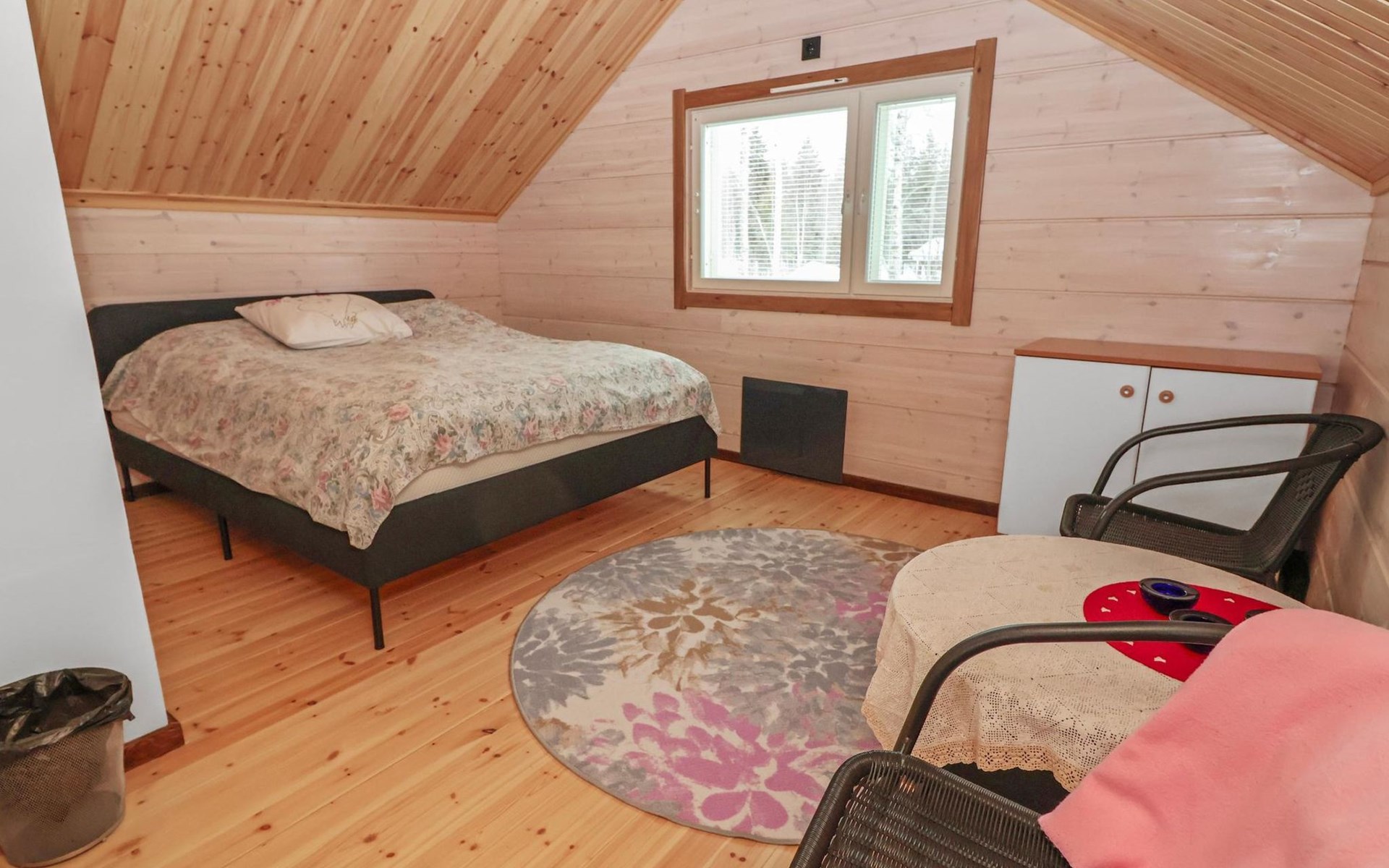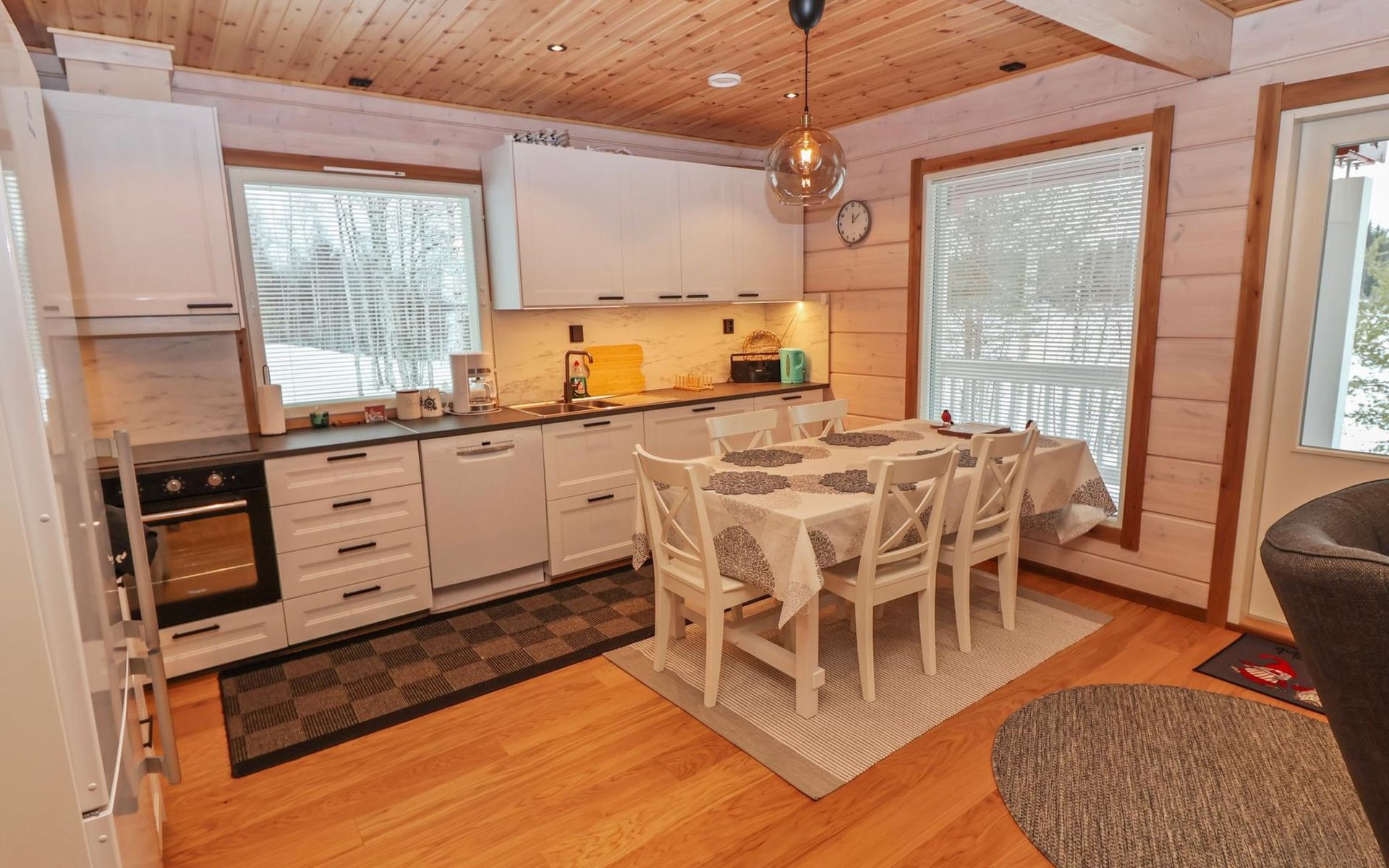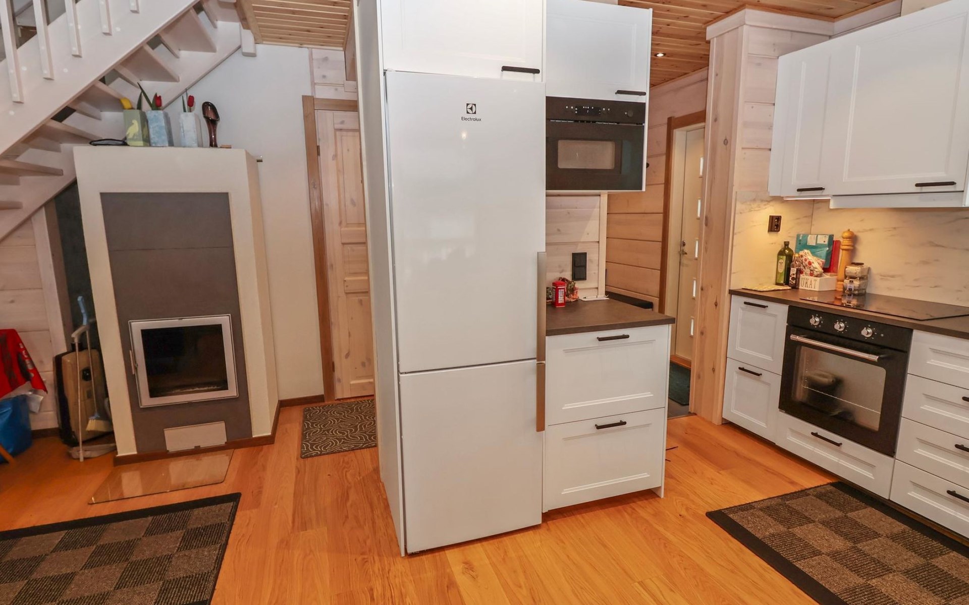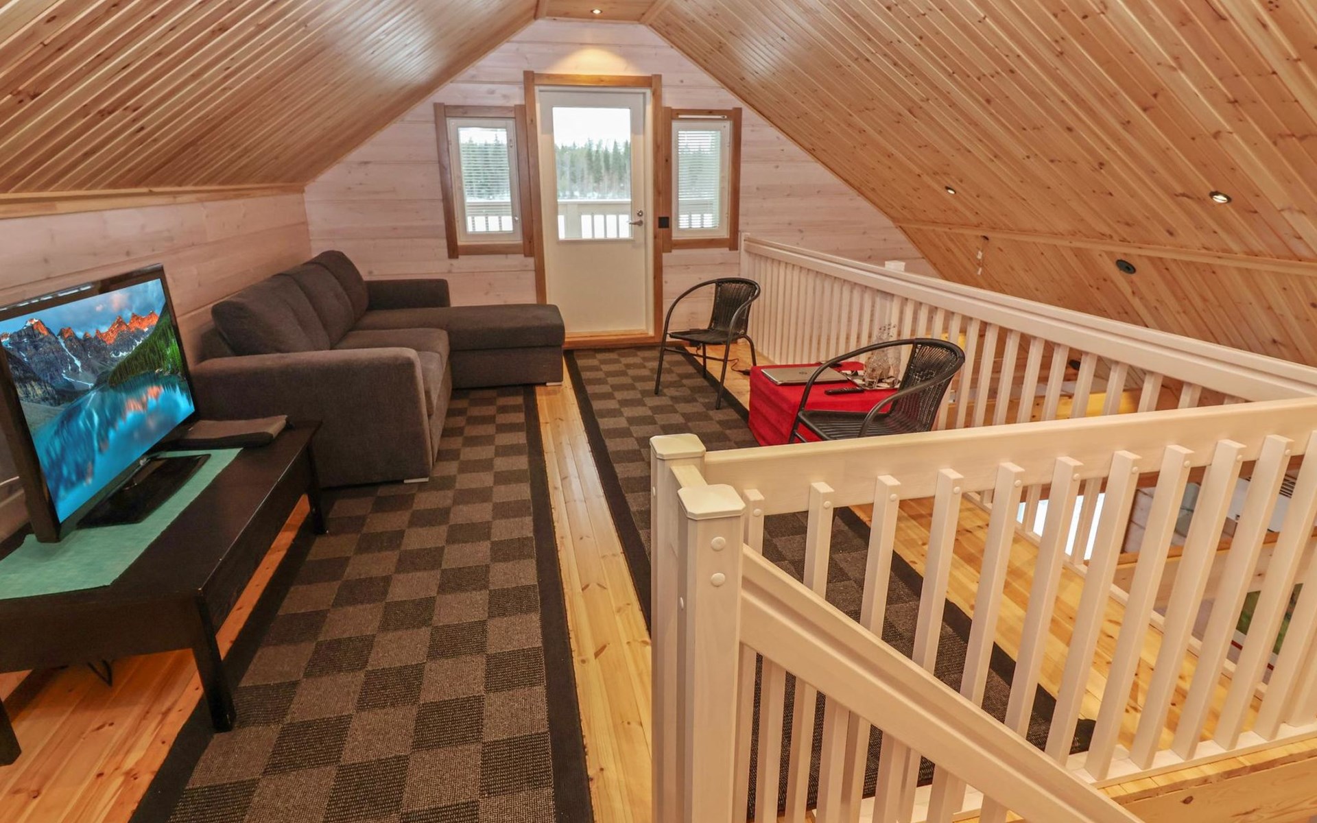 The villa features spacious and cozy accommodations, including two large bedrooms — one downstairs and one upstairs — both furnished with 160 cm wide double beds. Additionally, the loft has a comfortable sofa bed for two. A fully equipped kitchen, spacious living area with a fireplace, a bathroom, and an electric sauna complete the amenities. Large windows and the terrace provide stunning views of the River Tornionjoki.