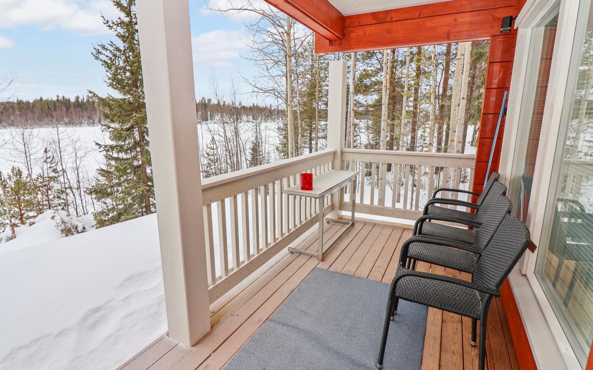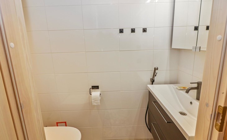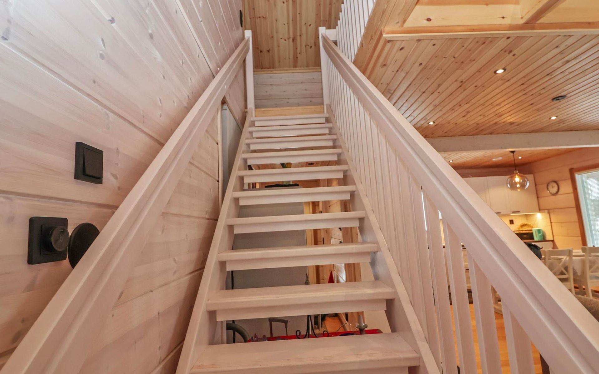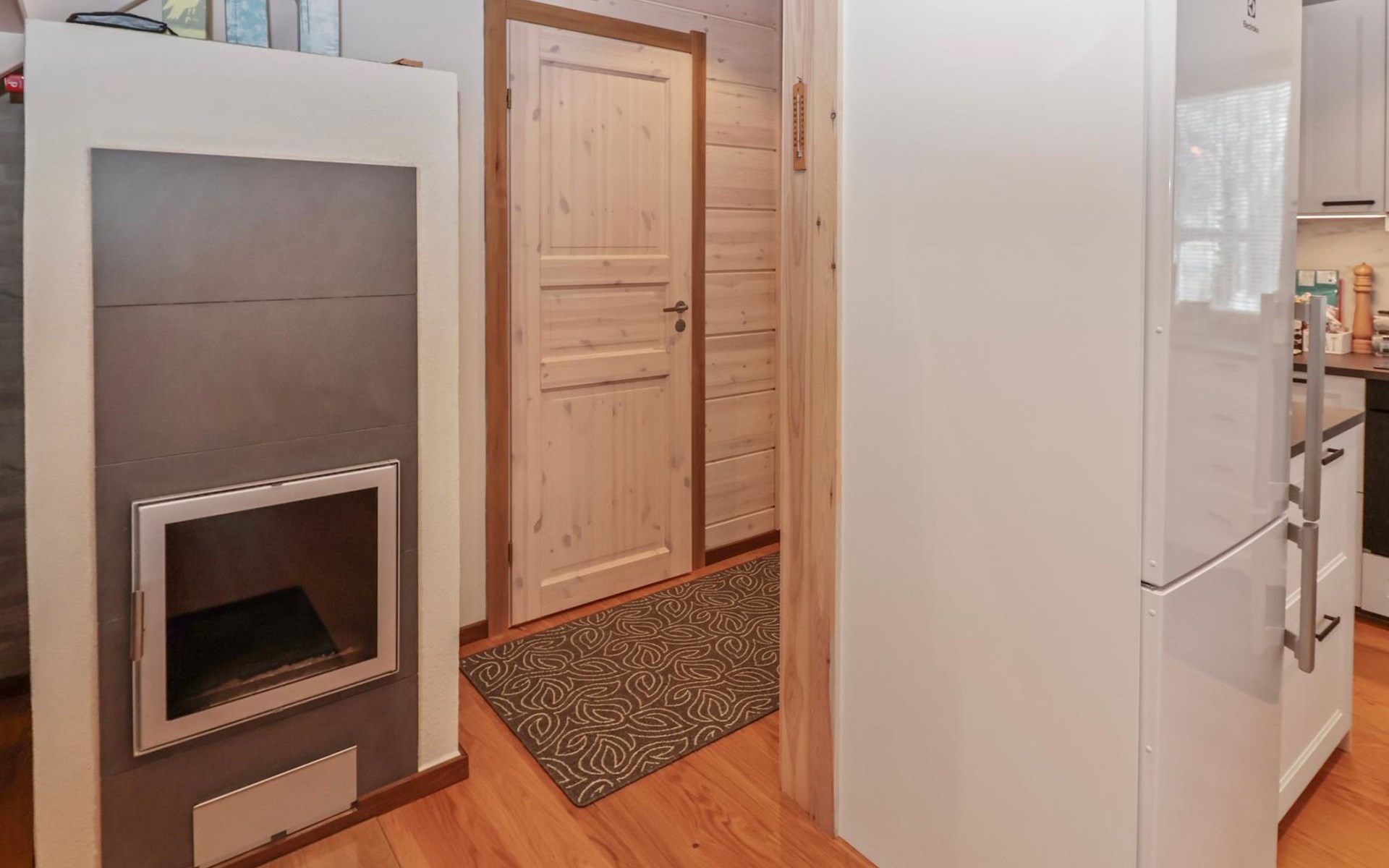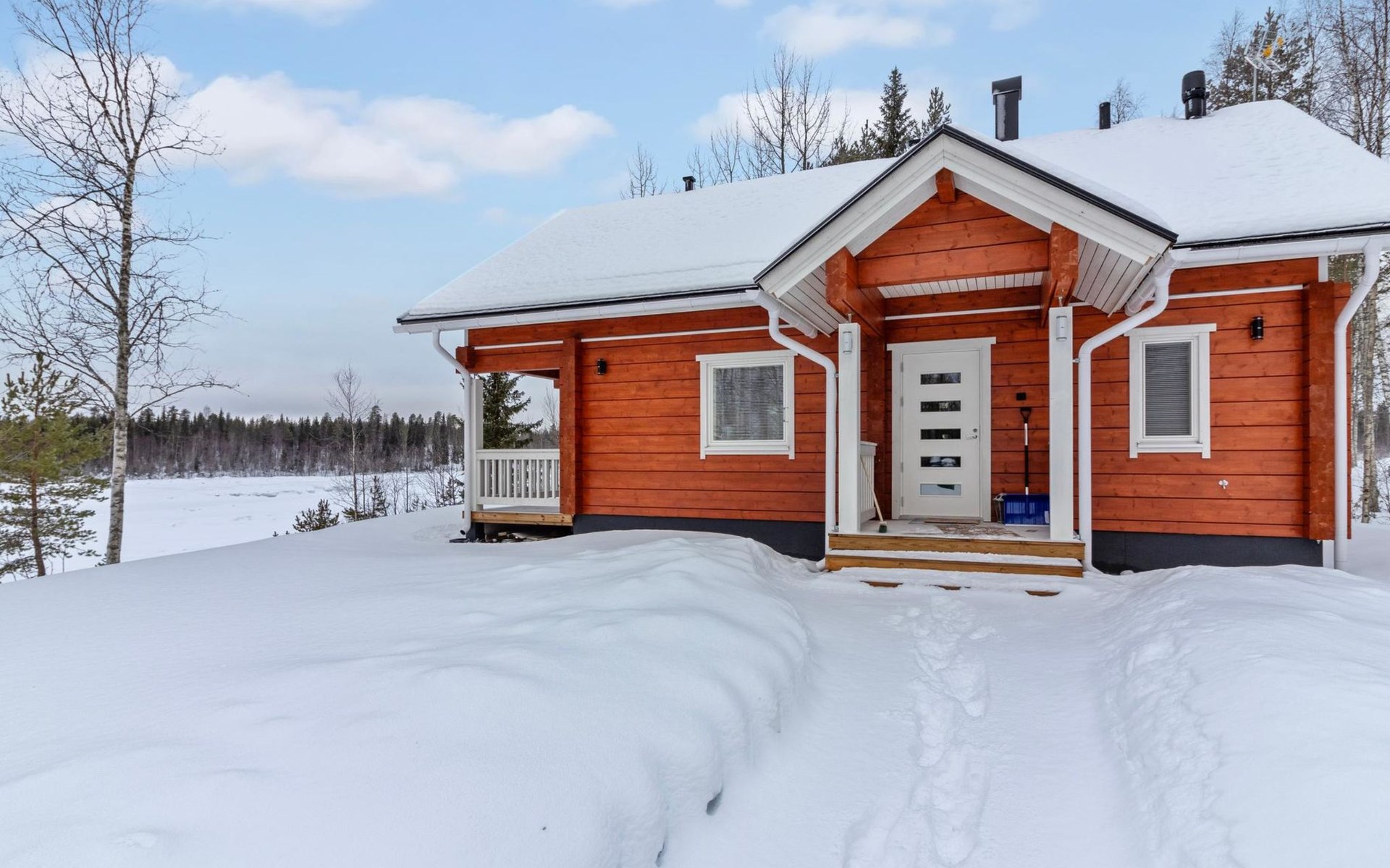 The villa features spacious and cozy accommodations, including two large bedrooms — one downstairs and one upstairs — both furnished with 160 cm wide double beds. Additionally, the loft has a comfortable sofa bed for two. A fully equipped kitchen, spacious living area with a fireplace, a bathroom, and an electric sauna complete the amenities. Large windows and the terrace provide stunning views of the River Tornionjoki.