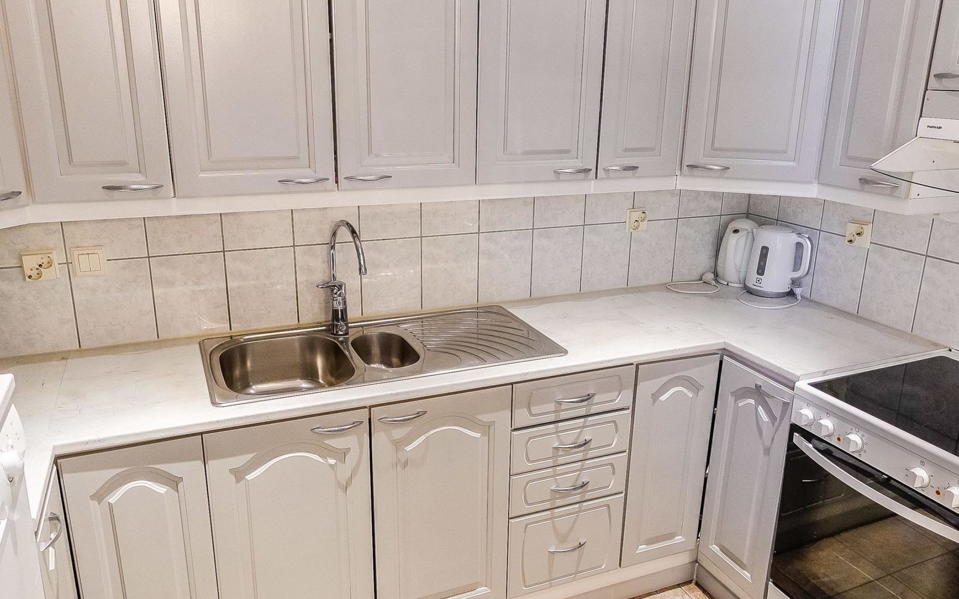 On the upper floor: 4 bedrooms, each with double bed and 2 foldable extra beds (from wall) in every bedroom, living area with kitchenette (fridge and sink), 2 toilets with shower.