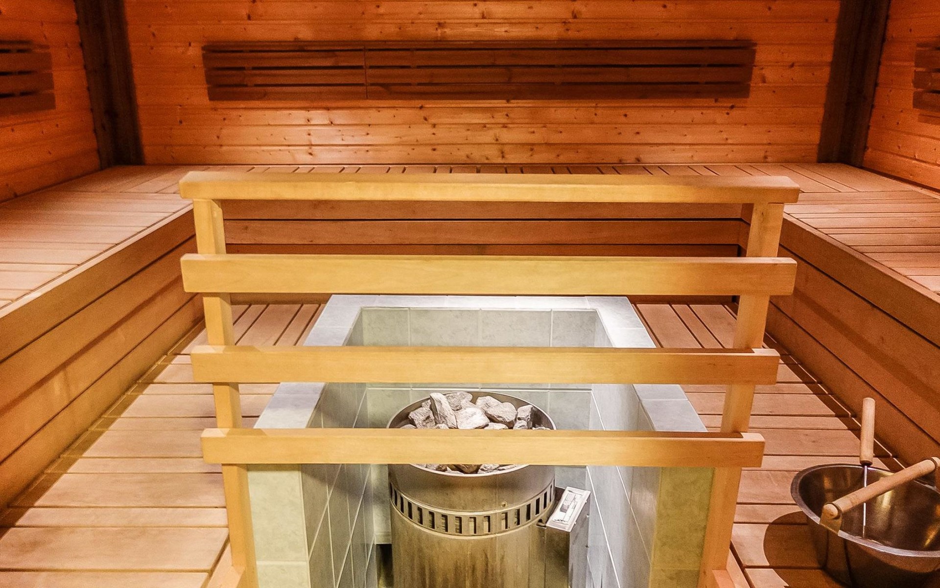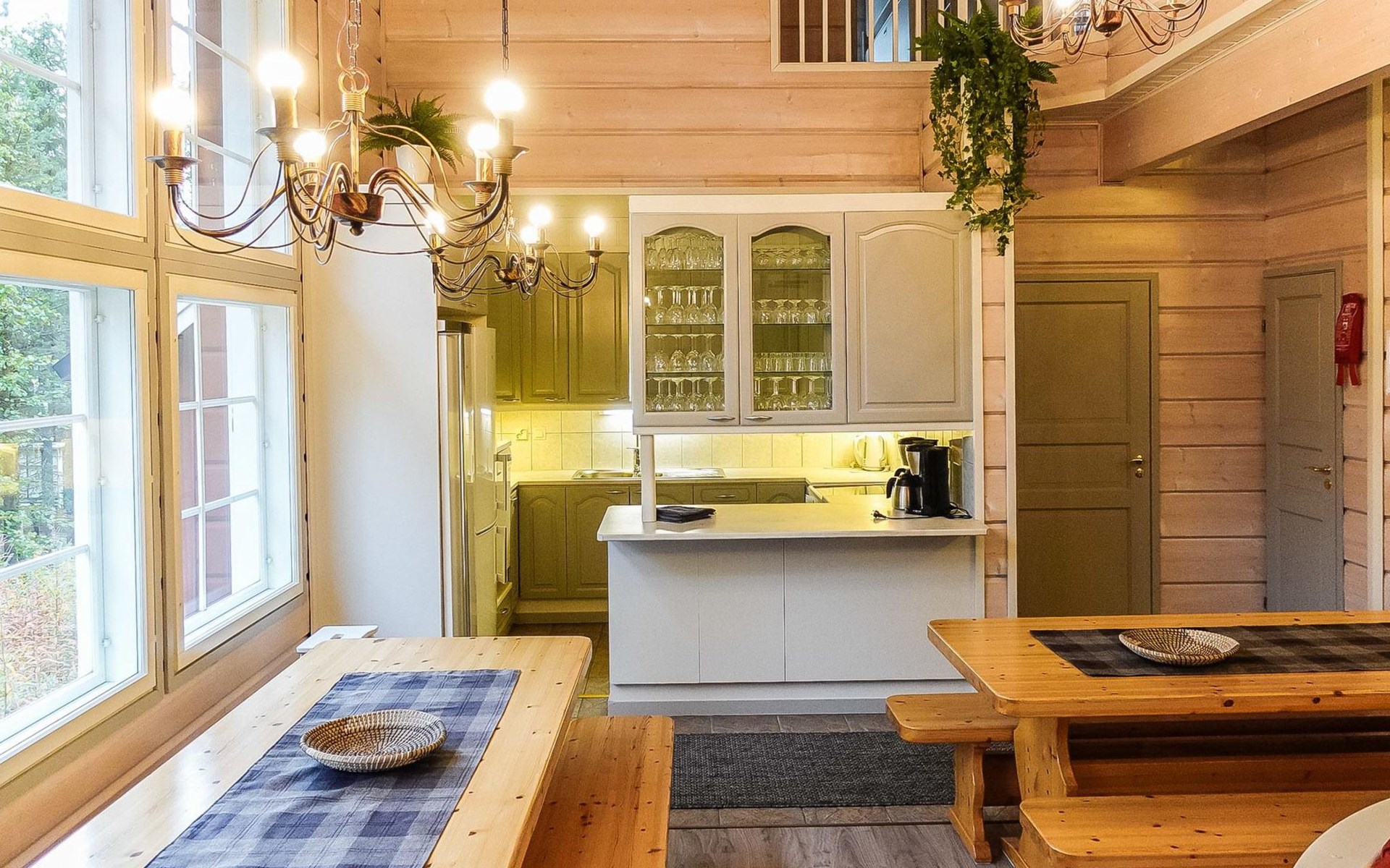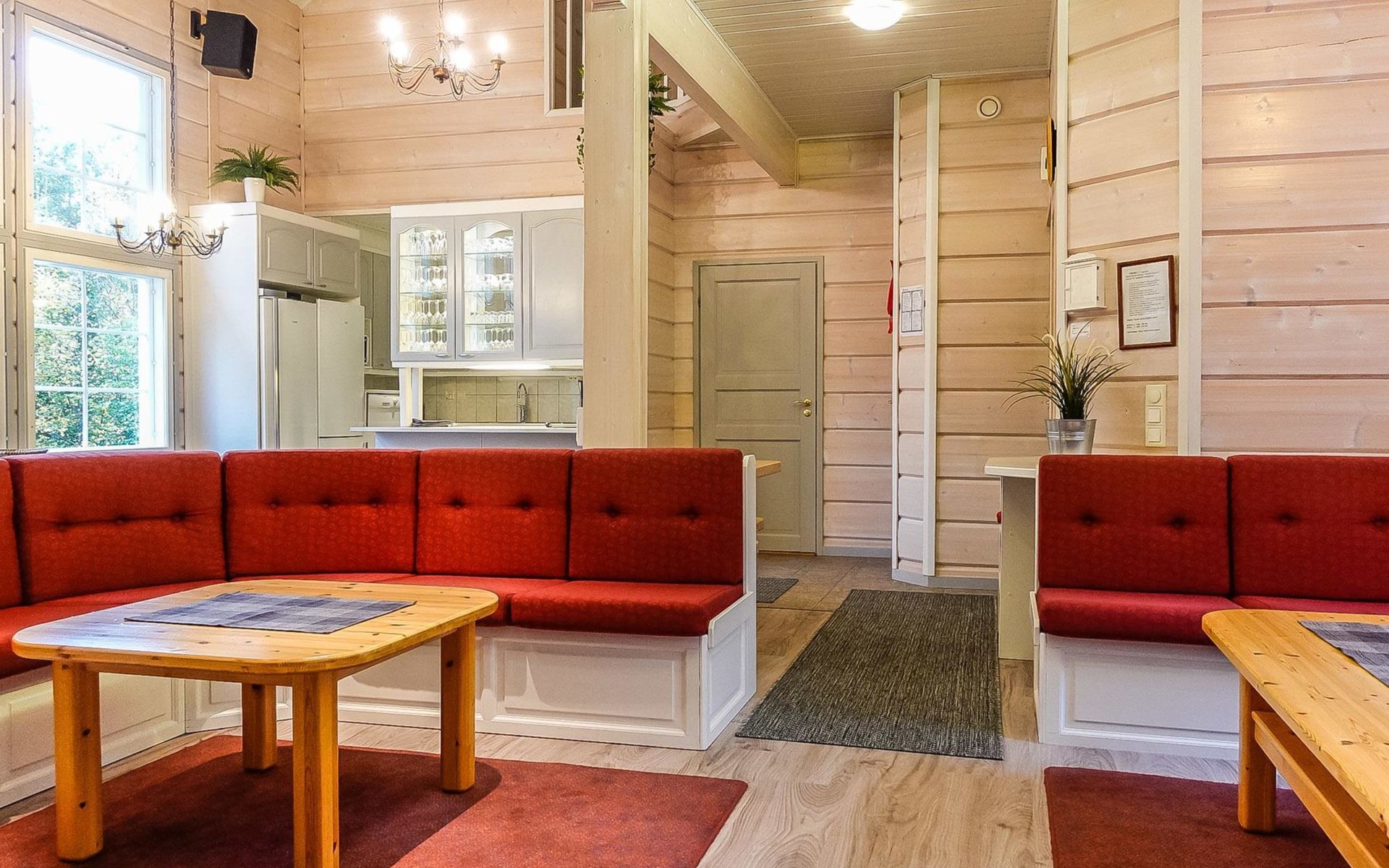 On the ground floor: large living area, open kitchen, 3 bedrooms, double bed in each, 2 foldable extra beds (from wall) in every bedroom. Two of bedrooms have common WC area with shower (access from both bedrooms). Large sauna, washroom (3 showers), dressing room and 2 toilets with shower.