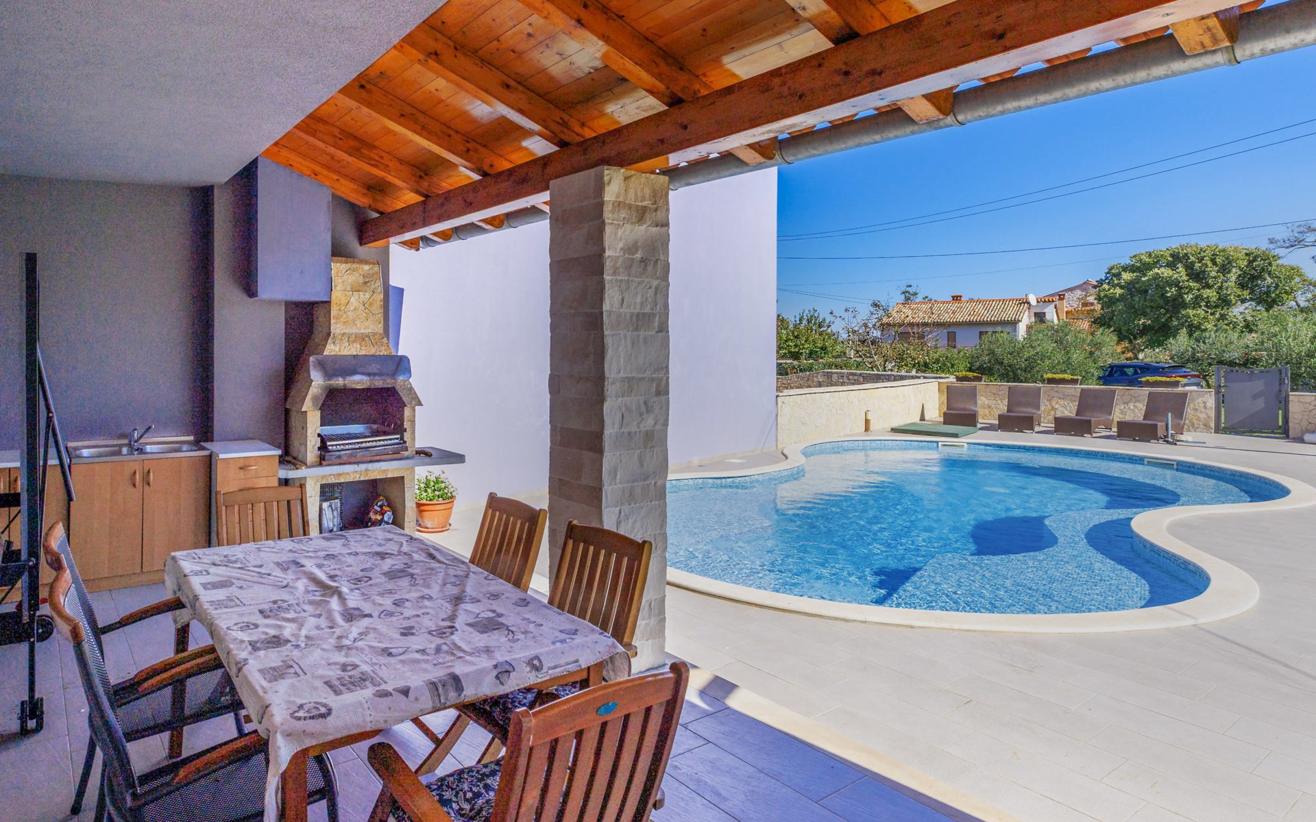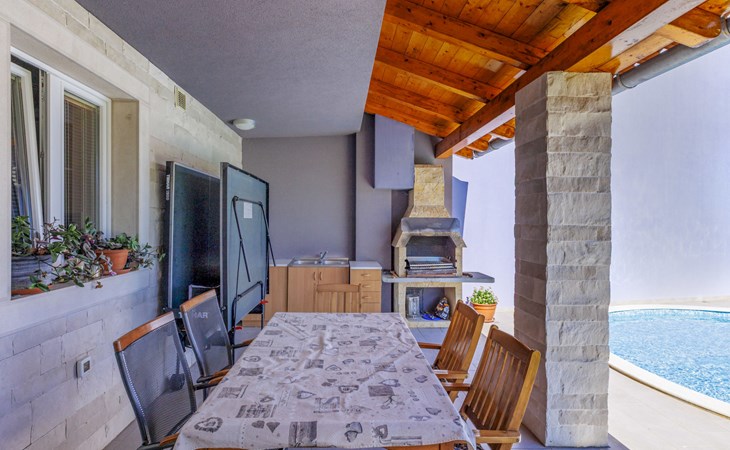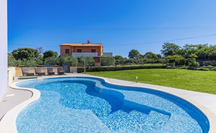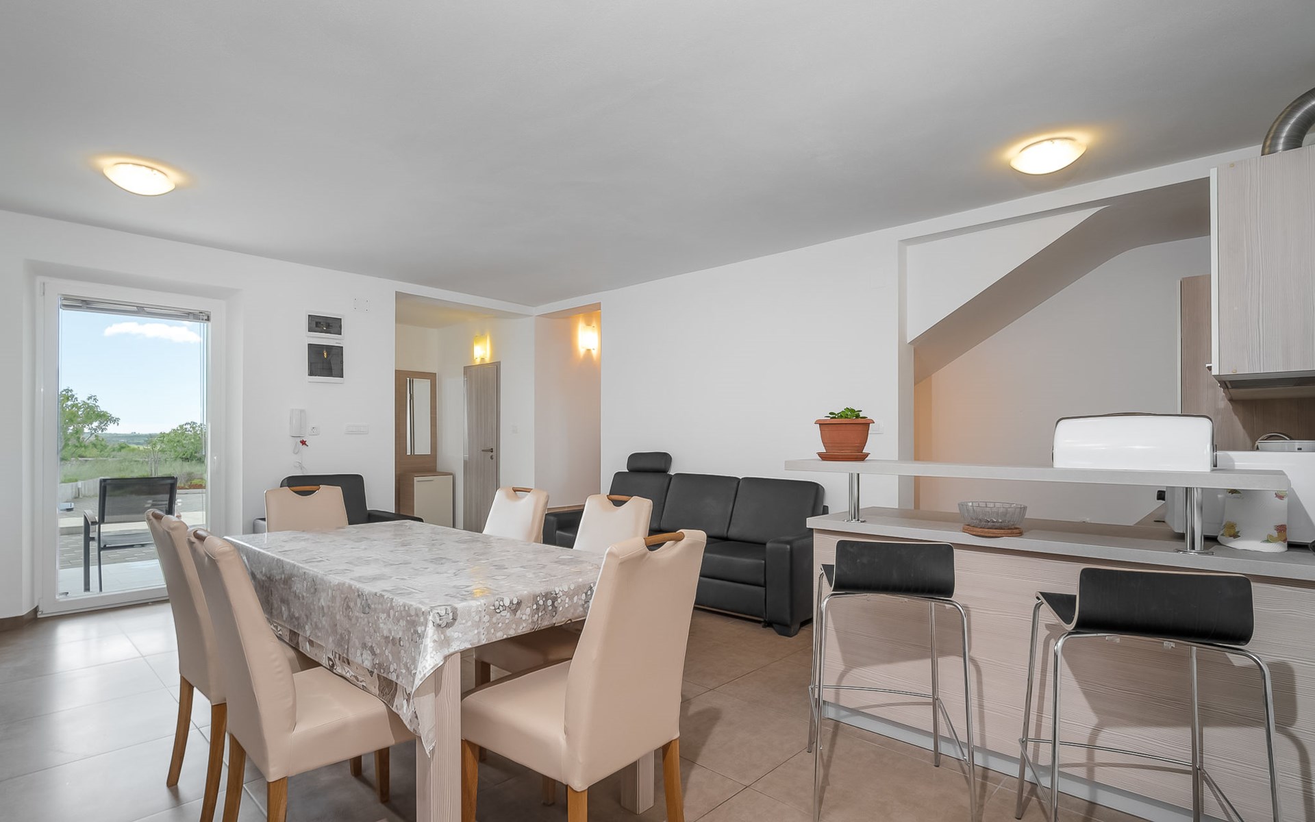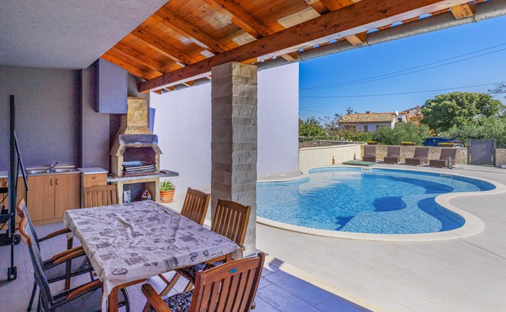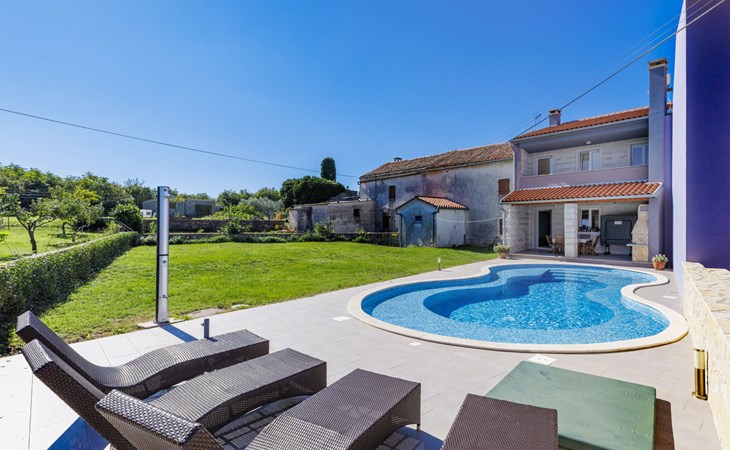 Krnica 22 km van Pula: Mooi rijtjeshuis "Mario 2", van 2 verdiepingen. In het gehucht Bratulići, 5 km van het centrum van Krnica, rustige, zonnige ligging, 7 km van zee. Voor alleengebruik: terrein 200 m2 (omheind), openluchtzwembad (50 m2, 140 cm diepte, seizoensgebonden beschikbaarheid: 02.Mei. - 26.Sep.) met trap. Onregelmatig zwembad. Tuinmeubelen, barbecue. In het huis: internetaansluiting, centrale verwarming, wasmachine. Overdekte parkeerplaats (voor 2 auto's) bij het huis op het terrein. Winkel 2 km, restaurant 100 m, bushalte 1.3 km, kiezelstrand 10 km, rotsstrand 7 km. Tennis 10 km, manege 3 km.