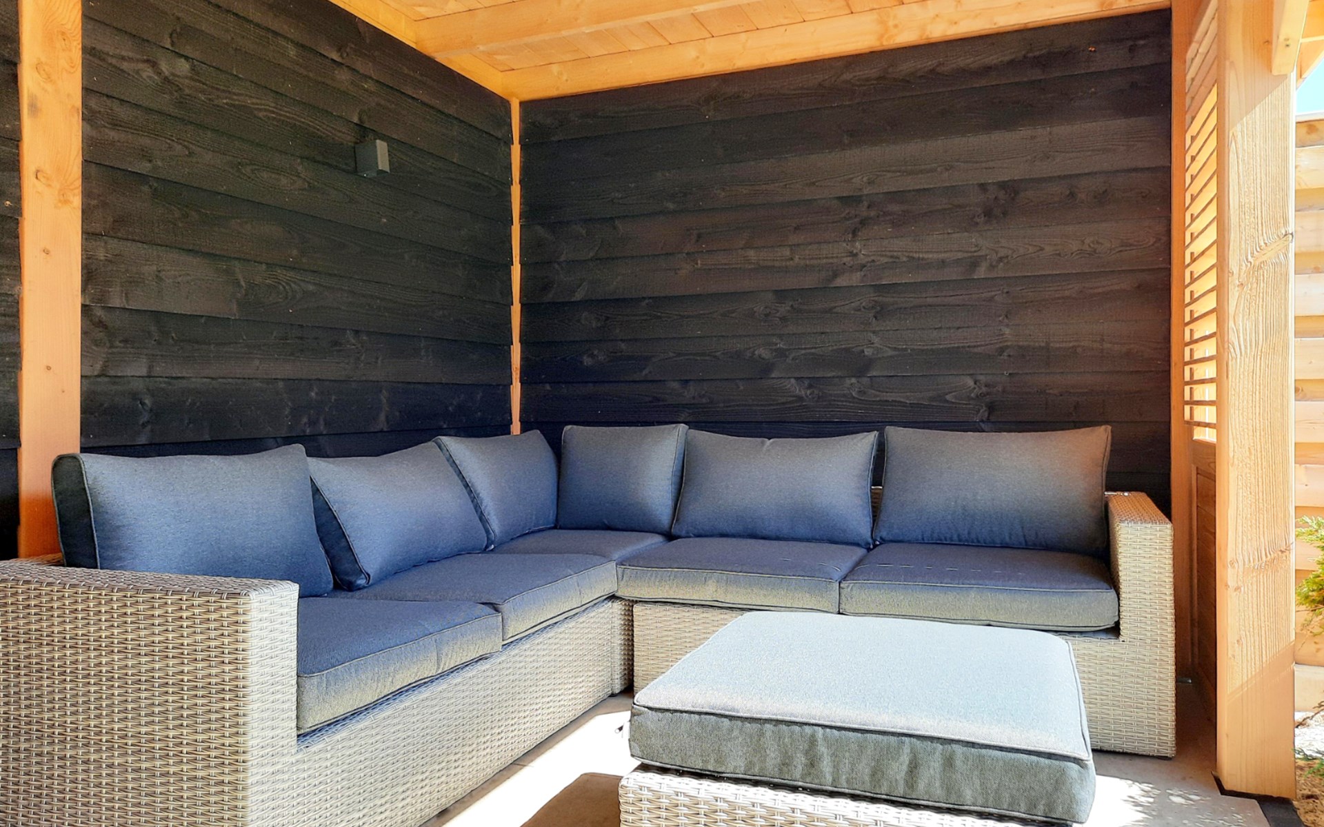 Schöner Garten mit überdachter Sitzecke. Der Garten hat einen hohen Zaun, also perfekt mit Hund.