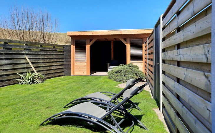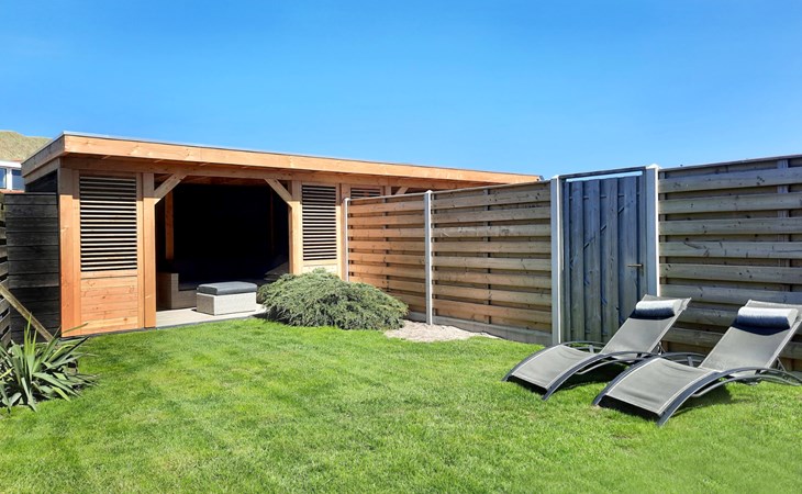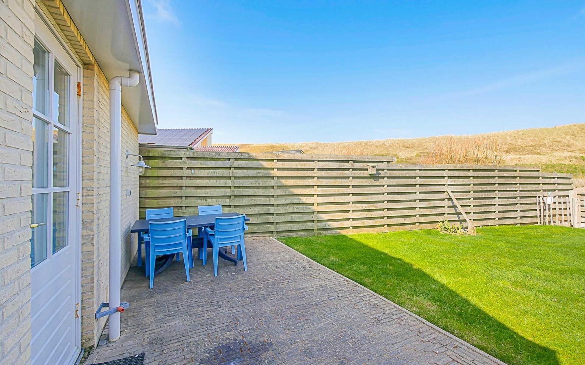 De ruime tuin biedt volop gelegenheid om buiten te zitten en te genieten van de frisse zeelucht en het uitzicht op de duinen.