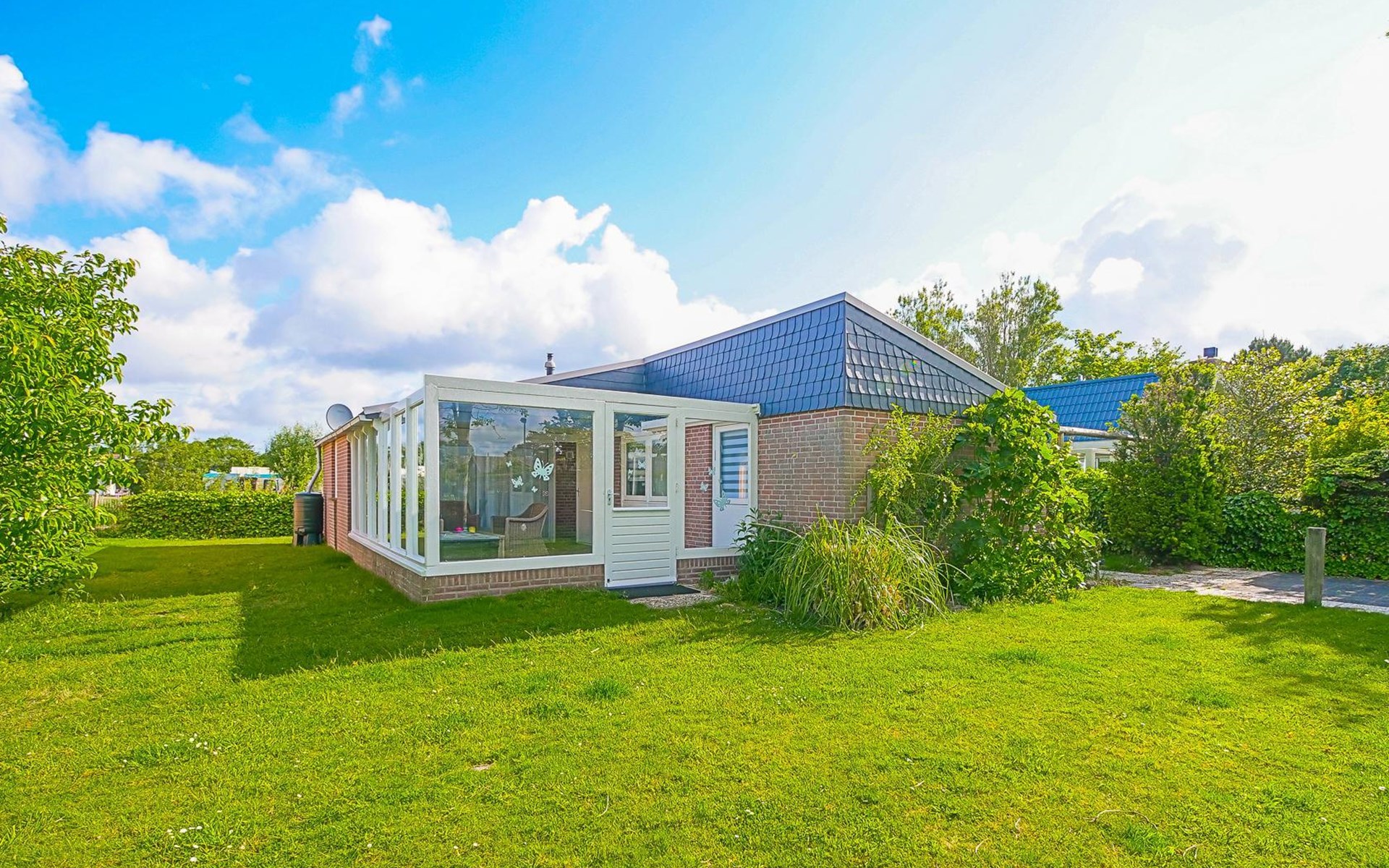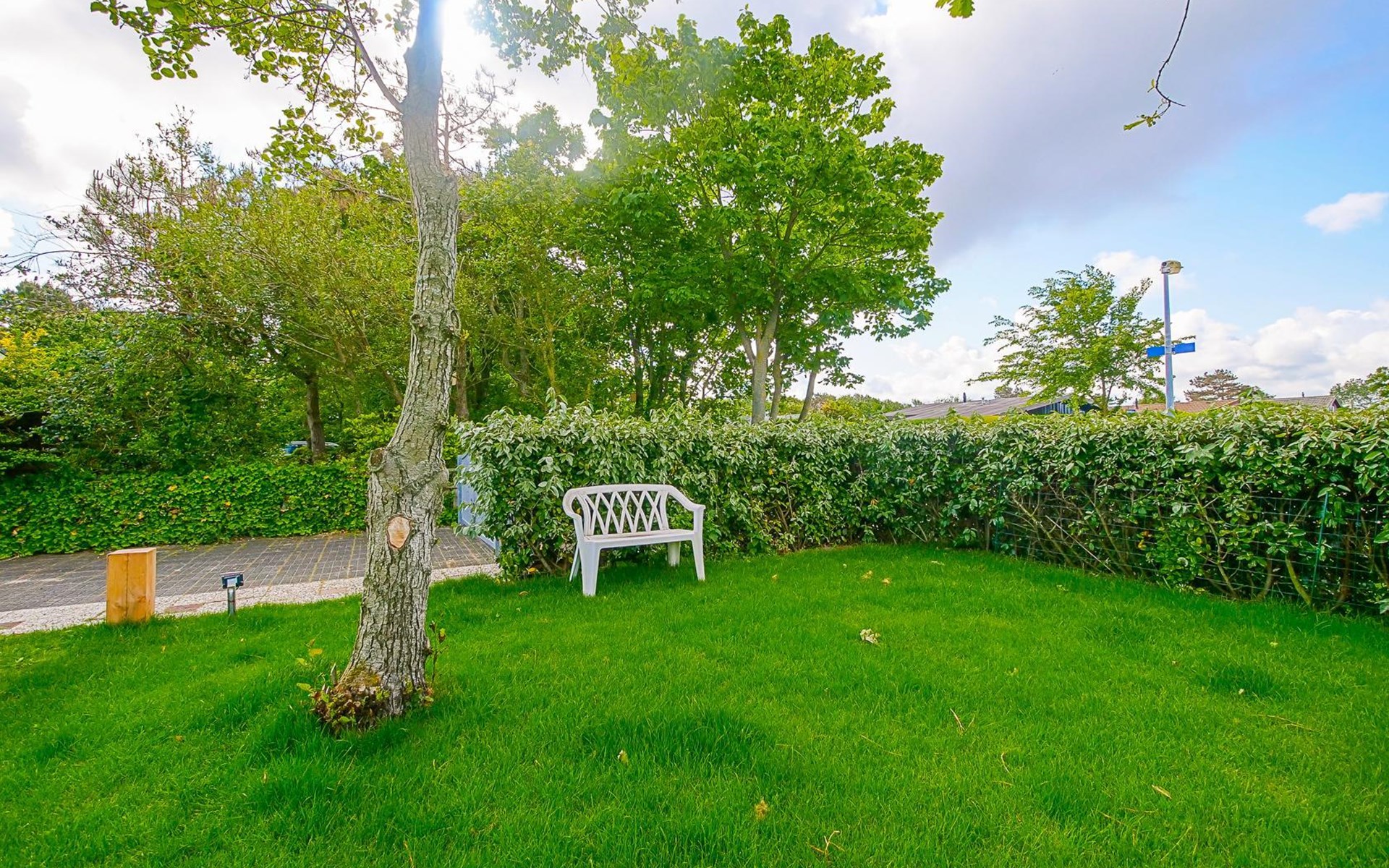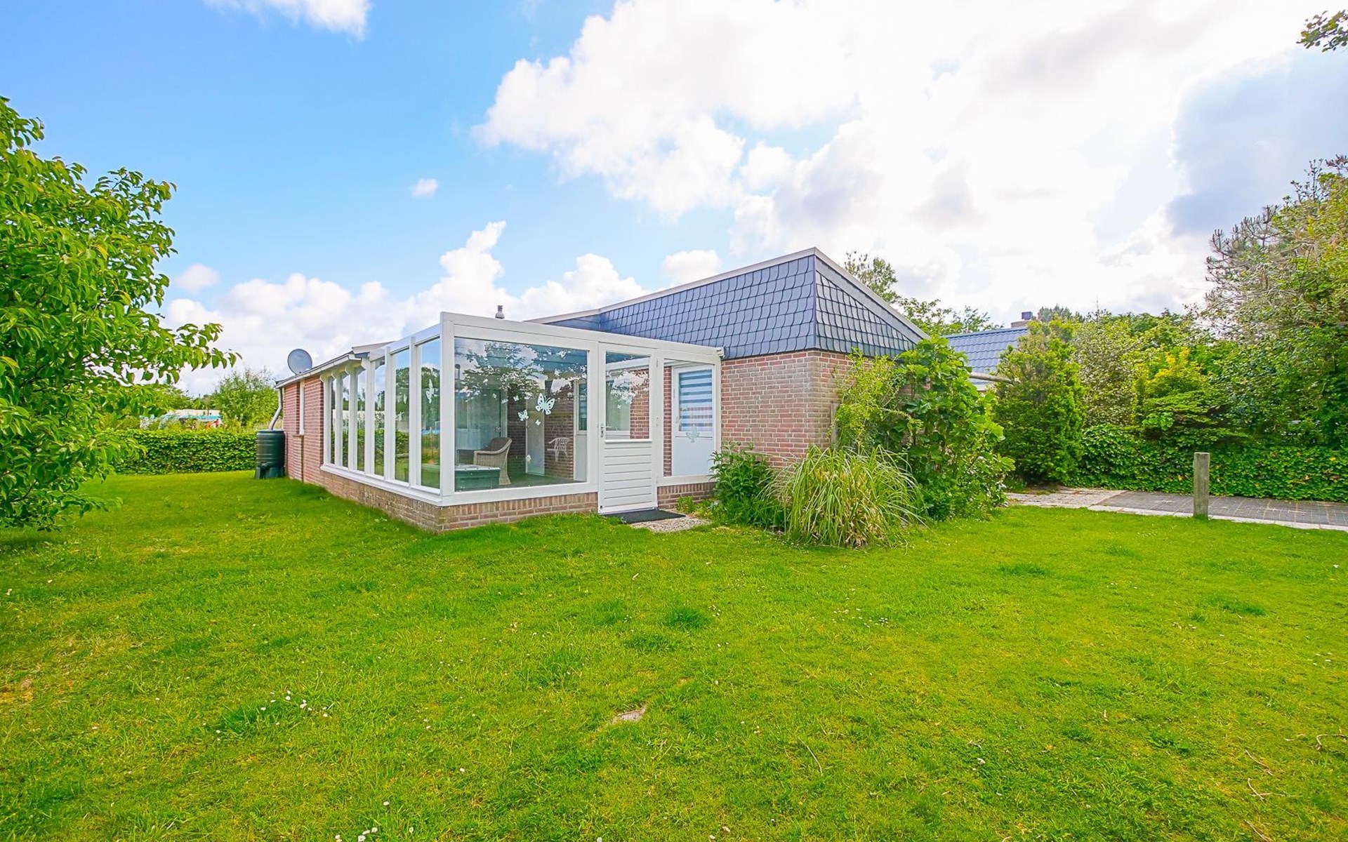 Het vakantiehuis ligt aan de rand van het park en biedt daardoor veel rust en privacy. De volledig omheinde tuin met begroeiing loopt rondom het huis, zodat u op elk moment van de dag van de zon kunt genieten. Binnen enkele minuten wandelen bereikt u de duinen en het brede strand.