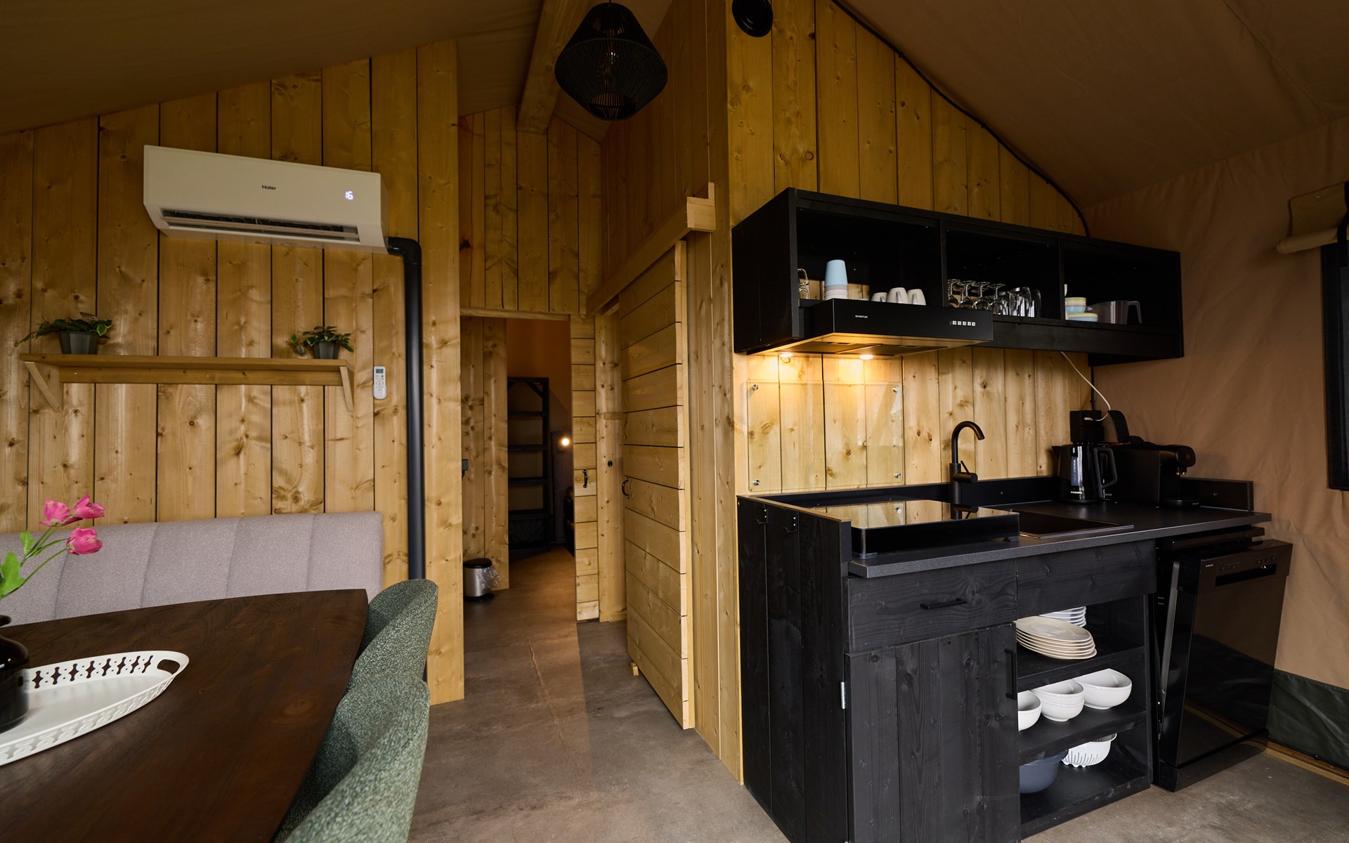 Binnen voelt meteen warm en comfortabel aan. De lodge is modern ingericht en dankzij de airco kun je het zowel verwarmen als verkoelen, ideaal voor elk seizoen! De keuken is volledig uitgerust met een koelkast met vriesvak, vaatwasser en een uitgebreid keukeninventaris. Er zijn twee fijne slaapkamers: één met een 2-persoons boxspringbed en een tweede slaapkamer met een stapelbed en een 1-persoonsbed.