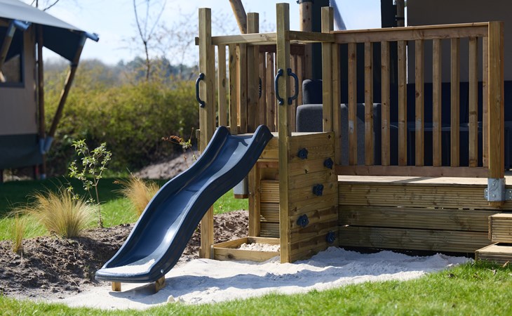 Op de ruime veranda vind je een ingebouwde bank en een gezellige tuinset, perfect voor relax momentjes met het hele gezin. Maar het absolute hoogtepunt? De eigen glijbaan! Kinderen roetsjen zo vanaf de veranda naar beneden. Onder de glijbaan is ook nog eens een zandbak verstopt, de ultieme speelplek voor kleine avonturiers.