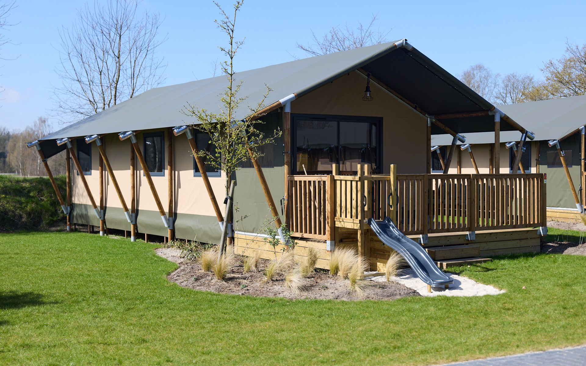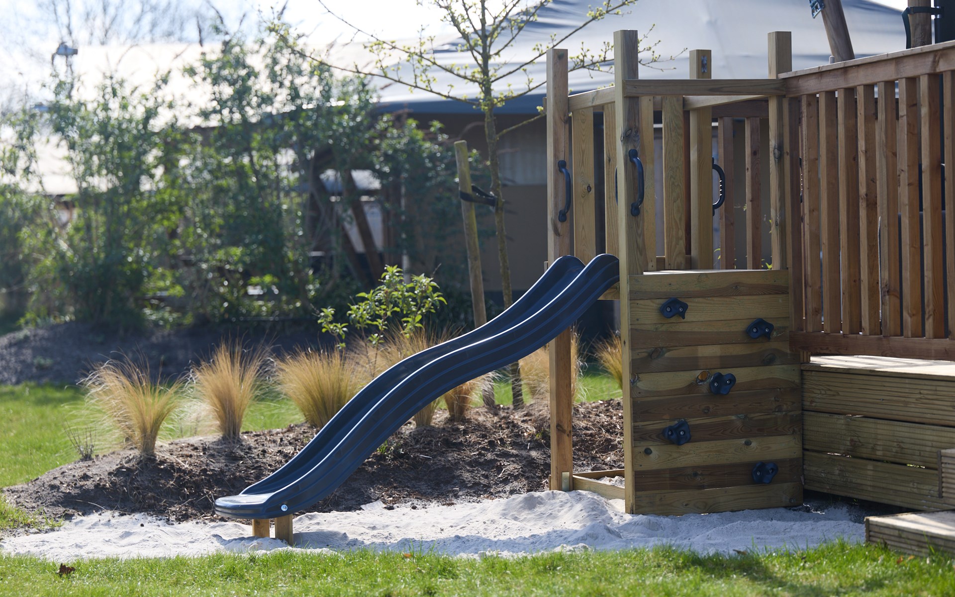 Vanaf de ruime veranda roetsjen de kinderen zo naar beneden via de eigen glijbaan. Onder de glijbaan zit een zandbak verstopt, dé perfecte plek voor kleine zandbouwers. Ondertussen kunnen ouders relaxen op de ingebouwde bank of aan de tuinset, terwijl je het overzicht houdt op alle avonturen.