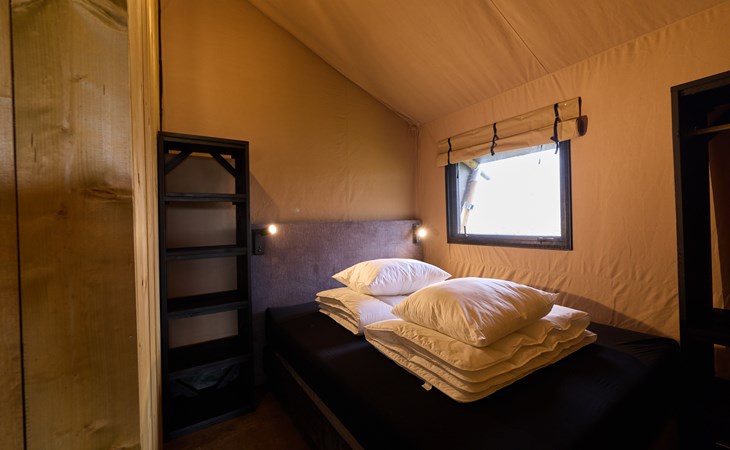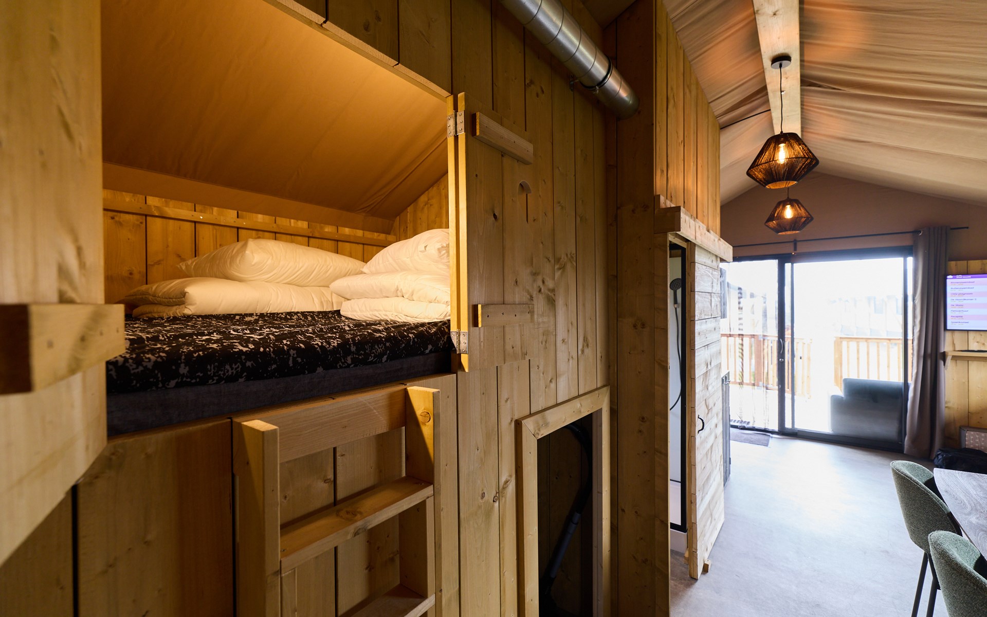 Midden in de accommodatie bevindt zich een speelhoek, speciaal ontworpen voor kinderen. Hier kunnen ze heerlijk spelen, zich terugtrekken én bovenop deze verhoging vind je twee gezellige slaapplaatsen. Het zijn geen standaard bedden, maar knusse ligplekken met lattenbodem en een heerlijk matras. Een écht hutgevoel, waar kinderen meteen verliefd op worden!
