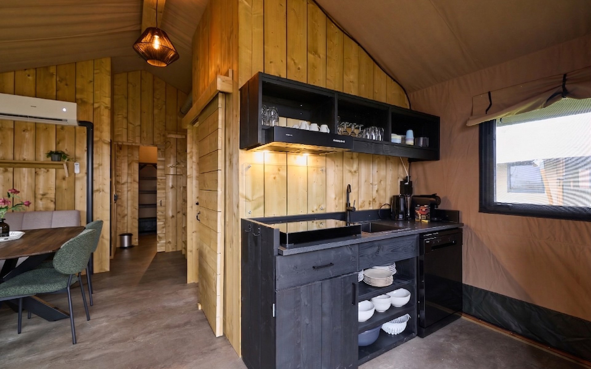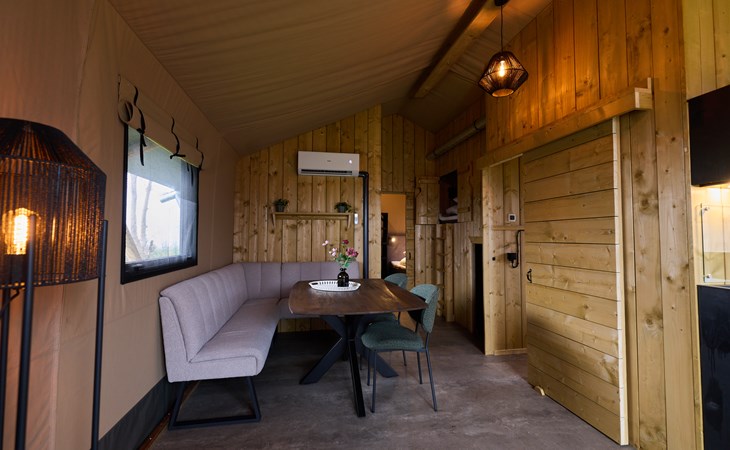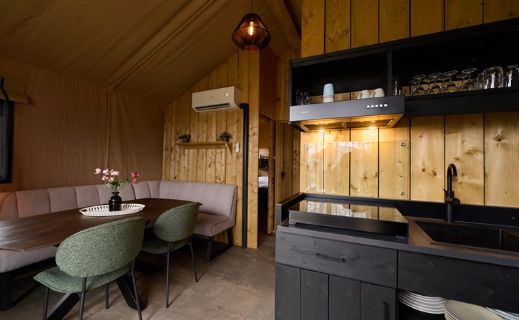 Binnen voelt meteen licht en sfeervol aan. Dankzij de airco kun je de lodge zowel verwarmen als verkoelen, ideaal voor warme zomerdagen en frissere avonden. De volledig uitgeruste keuken met koelkast met vriesvak, vaatwasser en compleet inventaris maakt koken een feestje. De slaapplekken zijn als volgt ingedeeld: