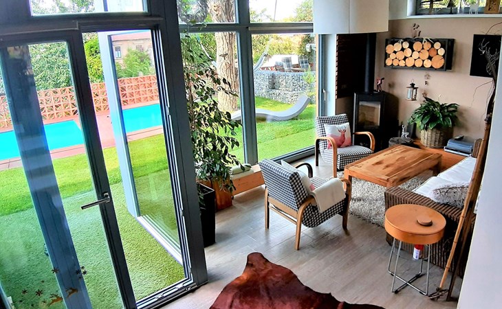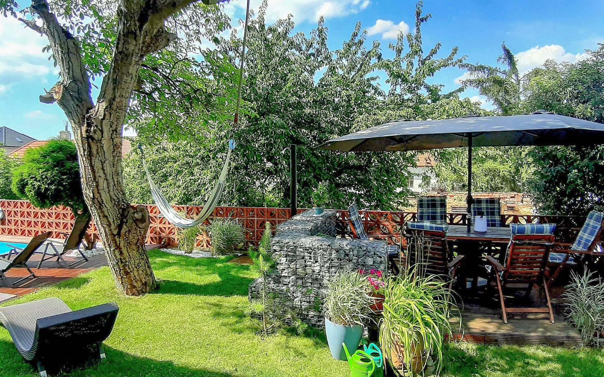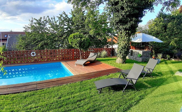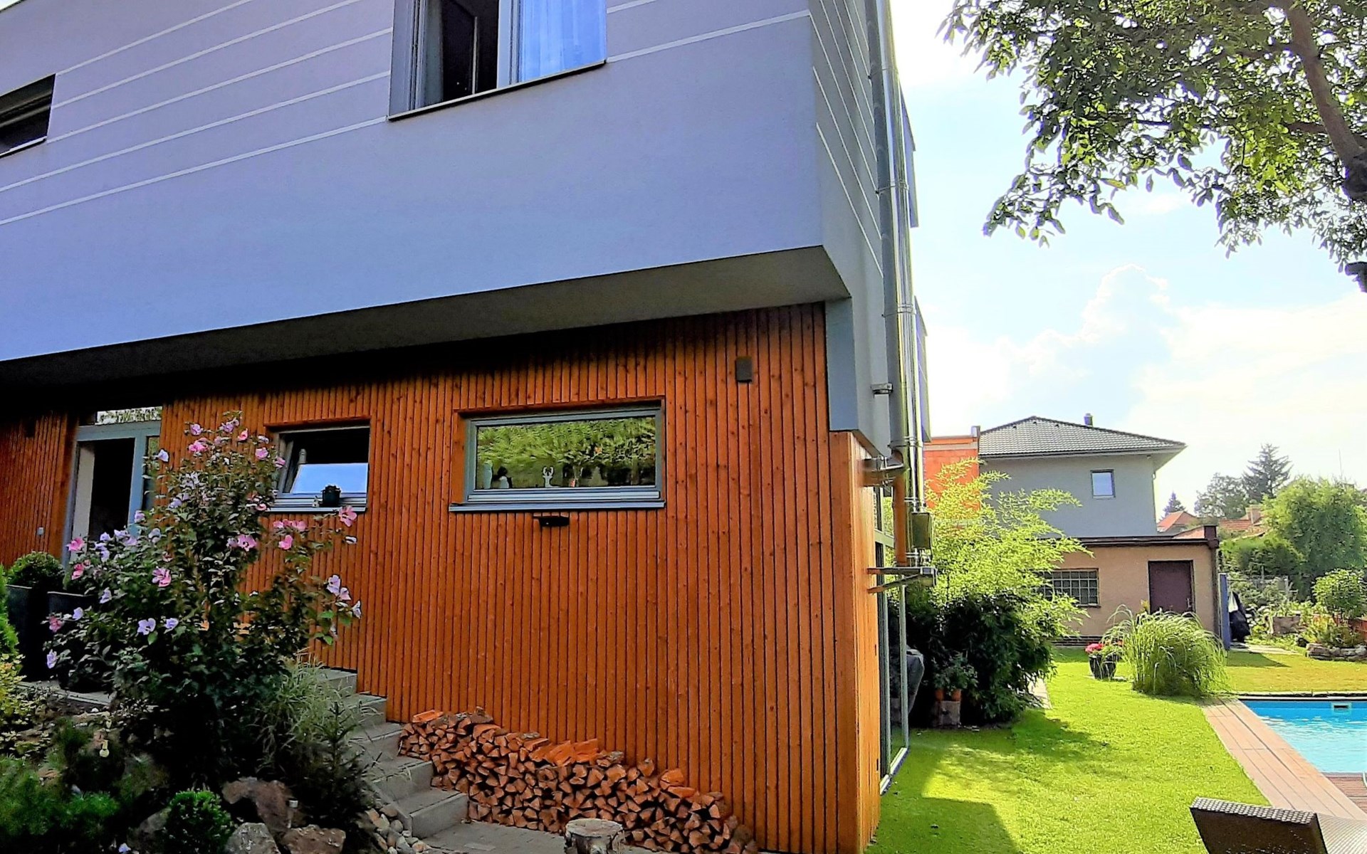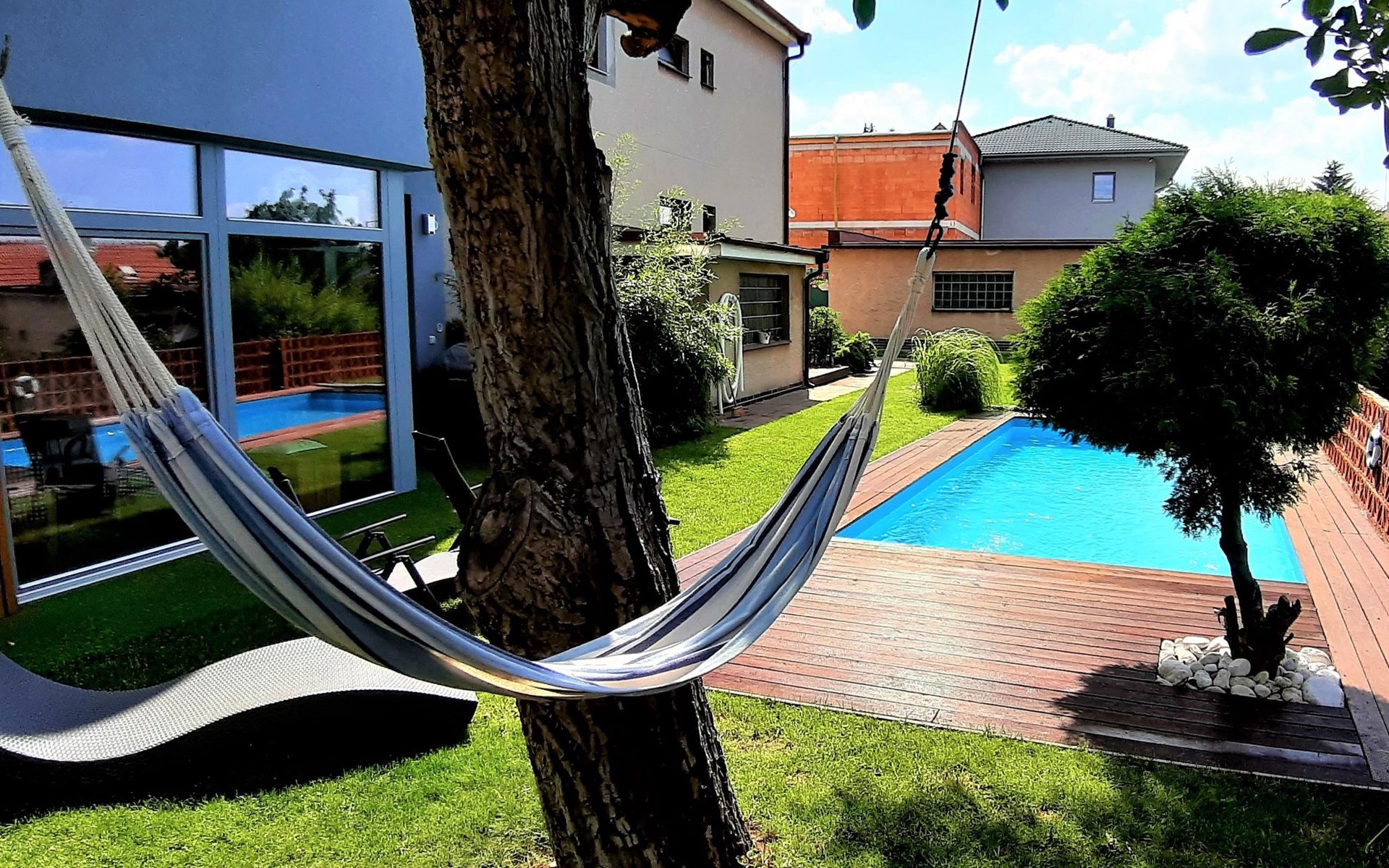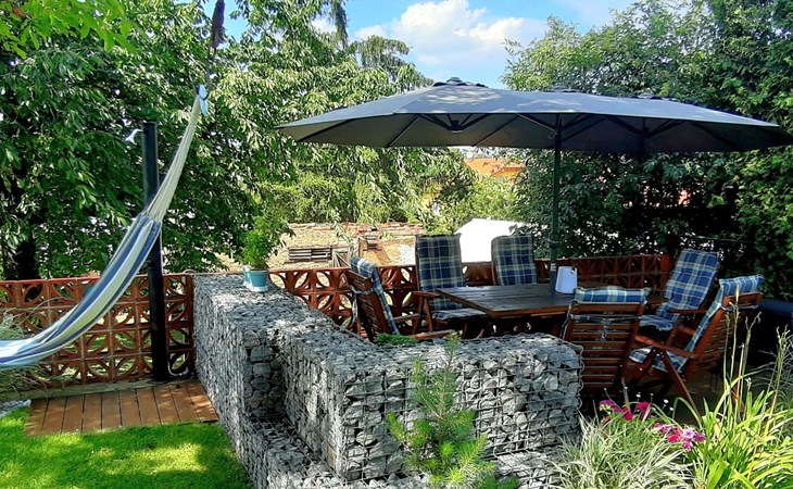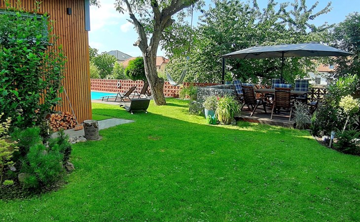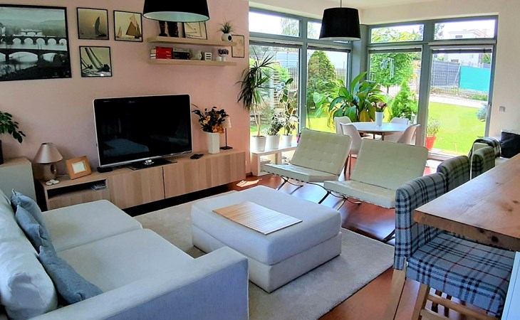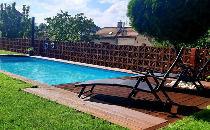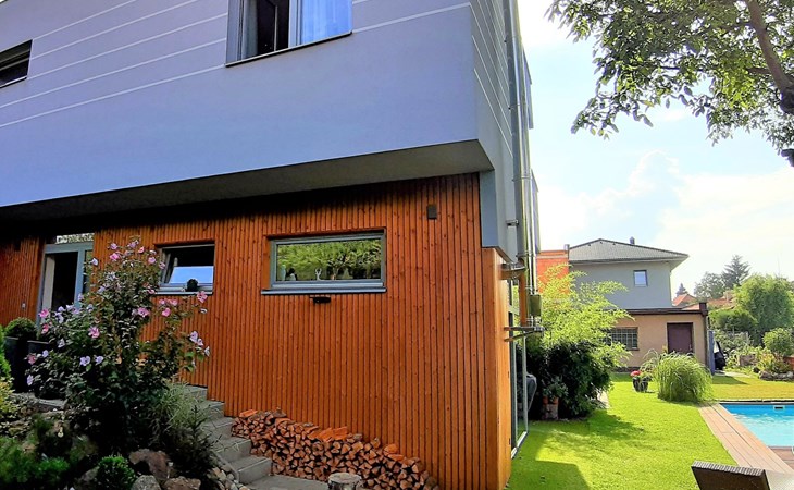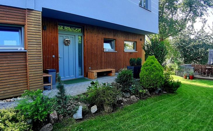 Groot, moderne, luxueuze eengezinswoning "Řeporyje", van 2 verdiepingen, bouwjaar 2015, omgeven door bomen. 13 km van het centrum van Praha, rustige, zonnige ligging. Voor alleengebruik: terrein 1.200 m2 (omheind), gazon, openluchtzwembad (7 x 3 m, 110 cm diepte, seizoensgebonden beschikbaarheid: 30.Jun. - 01.Sep.). Kinderzwembad, buitendouche, barbecue, onderhoud zwembad door de eigenaar/tuinman. In het huis: centrale verwarming, wasmachine. Parkeerplaats (voor 3 auto's) bij het huis. Oplaadstation. Levensmiddelenwinkel 100 m, supermarkt 1 km, winkelcentrum 2.5 km, restaurant 500 m, bushalte "Nádraží Řeporyje" 200 m, station "Nádraží Řeporyje" 200 m, overdekt zwembad 5 km. Golfterrein (18 holes) 6 km, tennis 500 m, kinderspeelplaats 100 m. Attracties in de buurt: Pražský hrad, Vyšehrad, Václavské náměstí, Staroměstské náměstí, Karlův most 12 km. Wandelgebied Dalejské údolí 500 m, Prokopské údolí 6 km.
