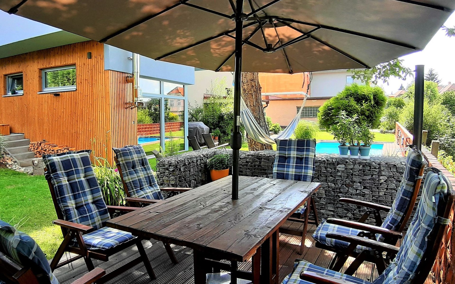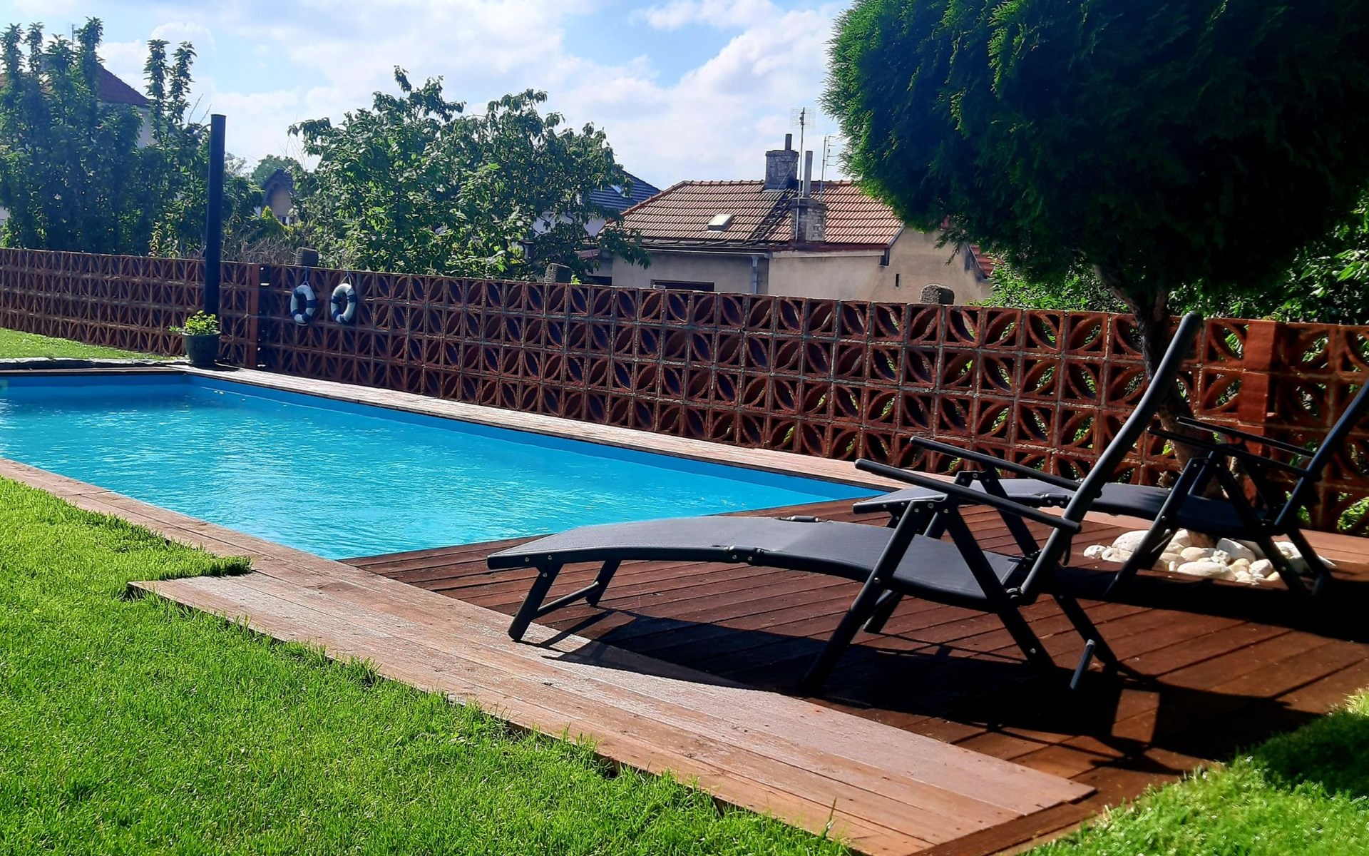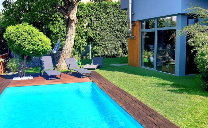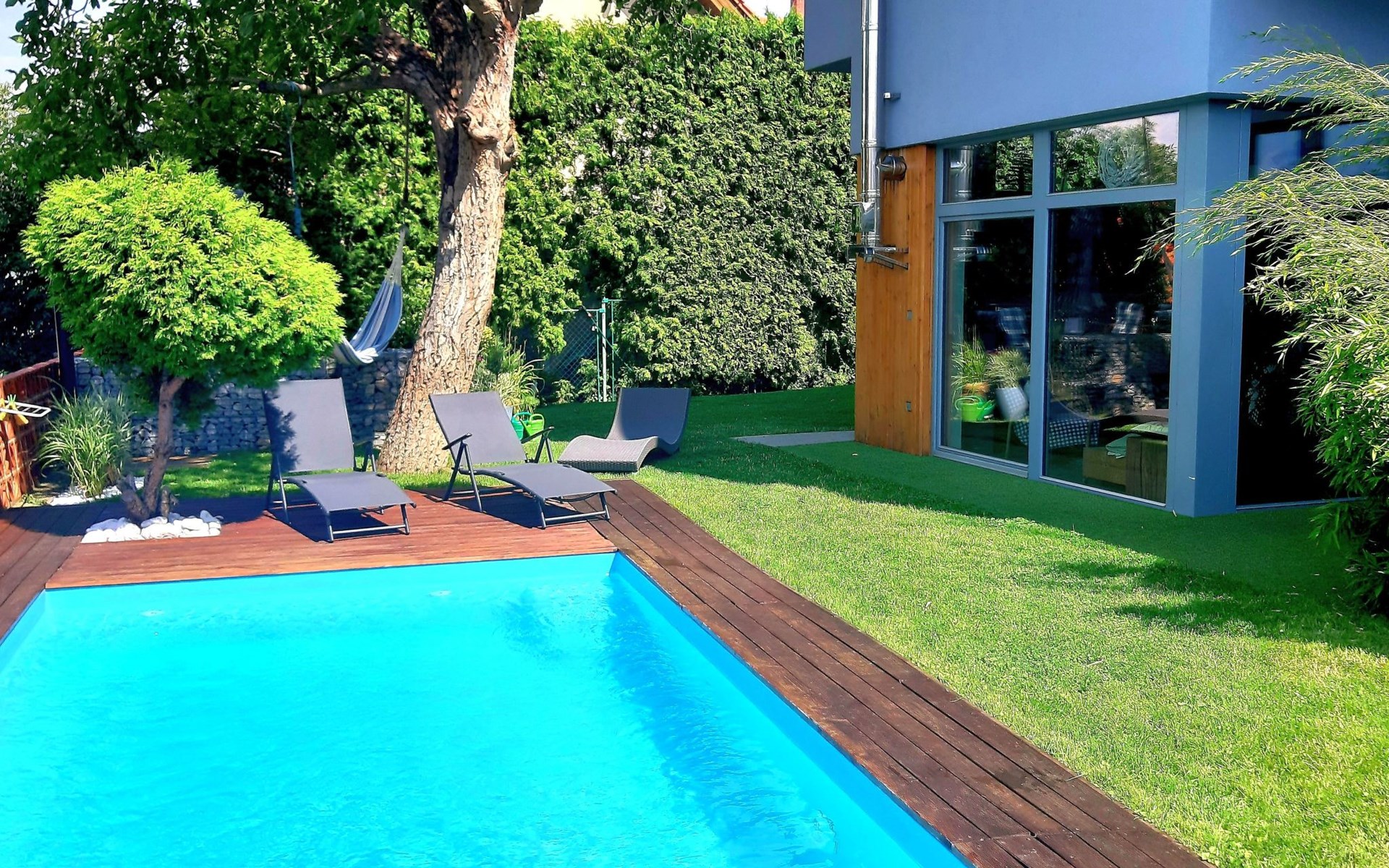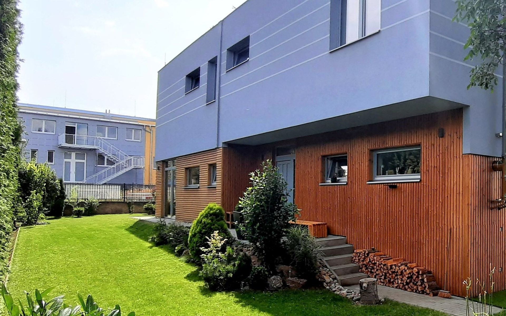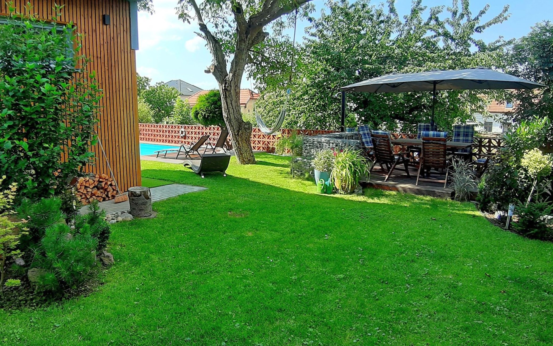 Groot, moderne, luxueuze eengezinswoning "Řeporyje", van 2 verdiepingen, bouwjaar 2015, omgeven door bomen. 13 km van het centrum van Praha, rustige, zonnige ligging. Voor alleengebruik: terrein 1.200 m2 (omheind), gazon, openluchtzwembad (7 x 3 m, 110 cm diepte, seizoensgebonden beschikbaarheid: 30.Jun. - 01.Sep.). Kinderzwembad, buitendouche, barbecue, onderhoud zwembad door de eigenaar/tuinman. In het huis: centrale verwarming, wasmachine. Parkeerplaats (voor 3 auto's) bij het huis. Oplaadstation. Levensmiddelenwinkel 100 m, supermarkt 1 km, winkelcentrum 2.5 km, restaurant 500 m, bushalte "Nádraží Řeporyje" 200 m, station "Nádraží Řeporyje" 200 m, overdekt zwembad 5 km. Golfterrein (18 holes) 6 km, tennis 500 m, kinderspeelplaats 100 m. Attracties in de buurt: Pražský hrad, Vyšehrad, Václavské náměstí, Staroměstské náměstí, Karlův most 12 km. Wandelgebied Dalejské údolí 500 m, Prokopské údolí 6 km.