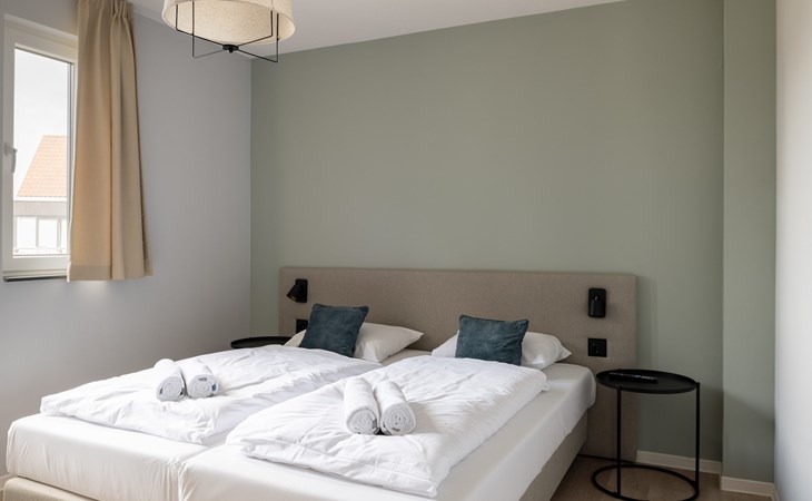 Op de begane grond bevindt zich een slaapkamer met 2 éénpersoonsbedden, een smart-tv met streaming mogelijkheid en een en-suite badkamer met ligbad, douche en wastafelmeubel. Ook is er een separaat toilet aanwezig.
