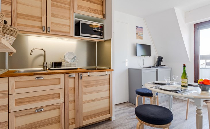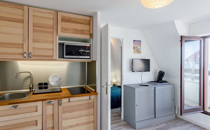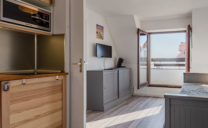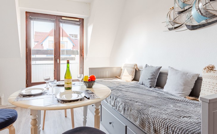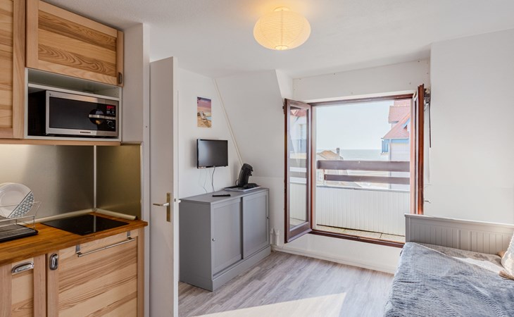 Residentie "Le Grand Cap", van 5 verdiepingen. In de wijk Villers 2000, 1.3 km van het centrum van Villers-sur-Mer, 150 m van zee, 150 m van het strand. In het complex: lift. Parkeerplaats. Winkel 1.3 km, winkelcentrum 50 m, restaurant 150 m, bushalte "Plage" 300 m, thermaalbad "Thalasso de Deauville" 6.7 km. Golfterrein (18 holes) 5.5 km. De sleuteloverdracht vindt plaats bij het agentschap Interhome in Cabourg, 13 km. Vergelijkbare accommodaties kunnen worden geboekt.