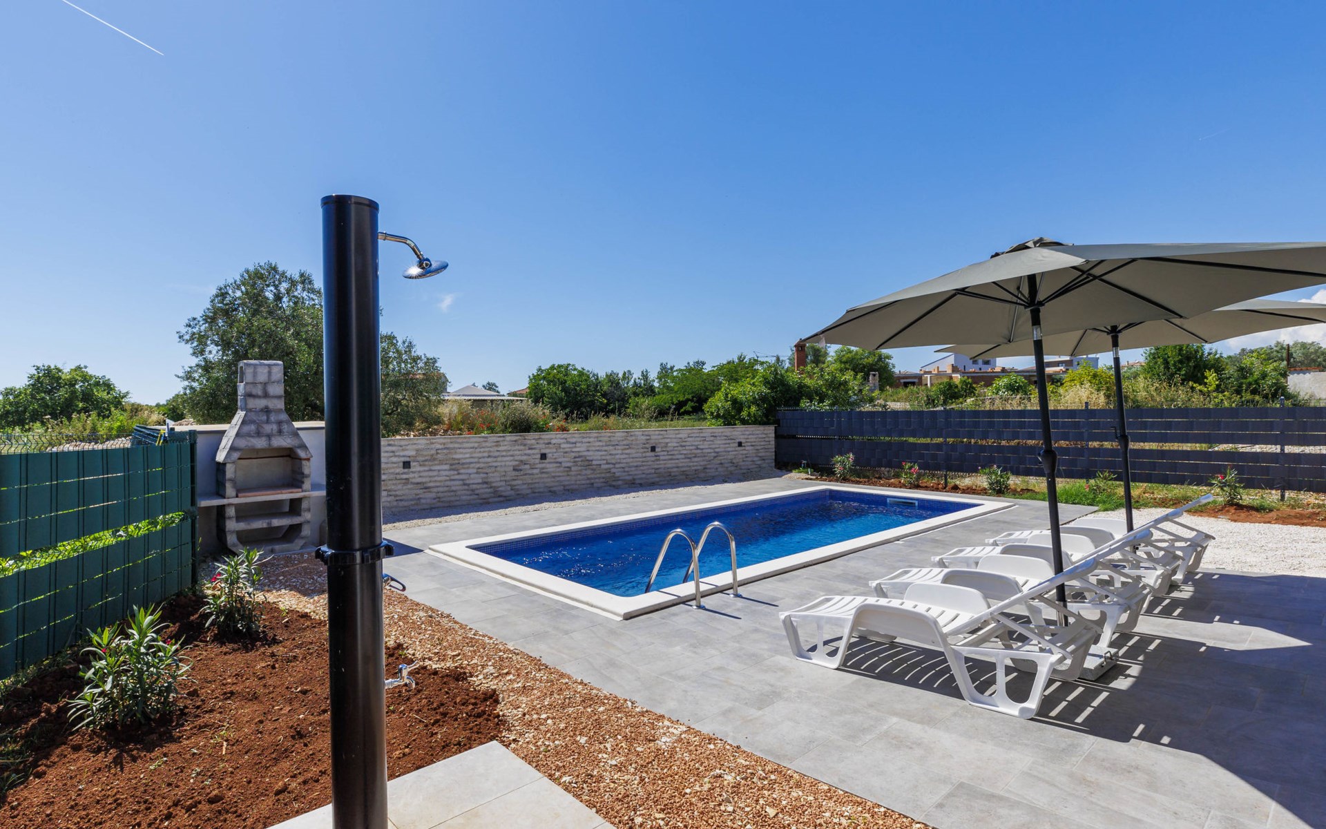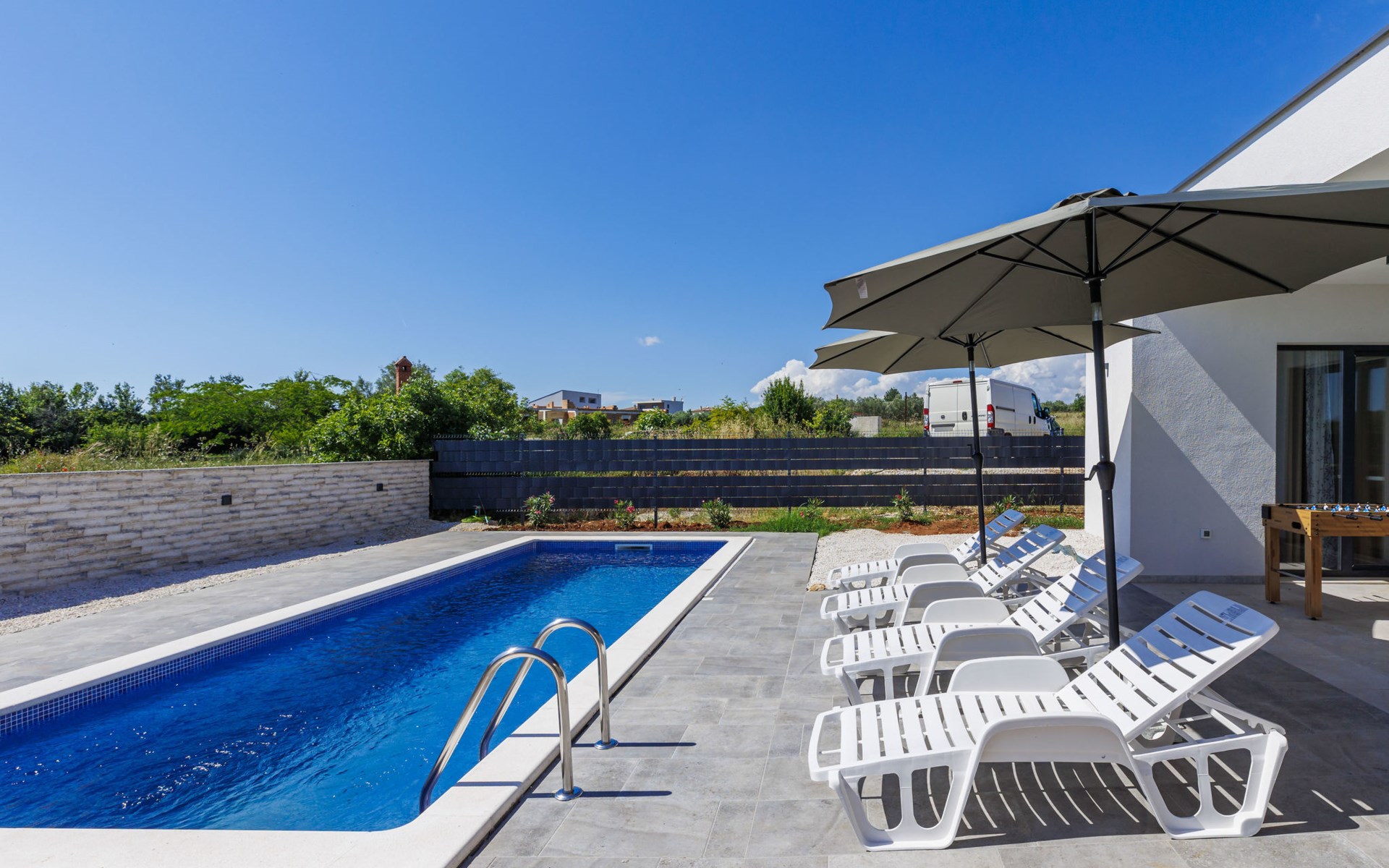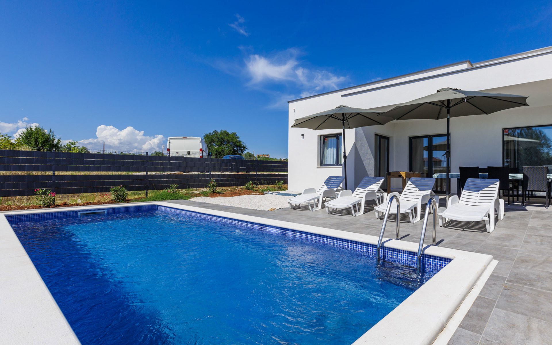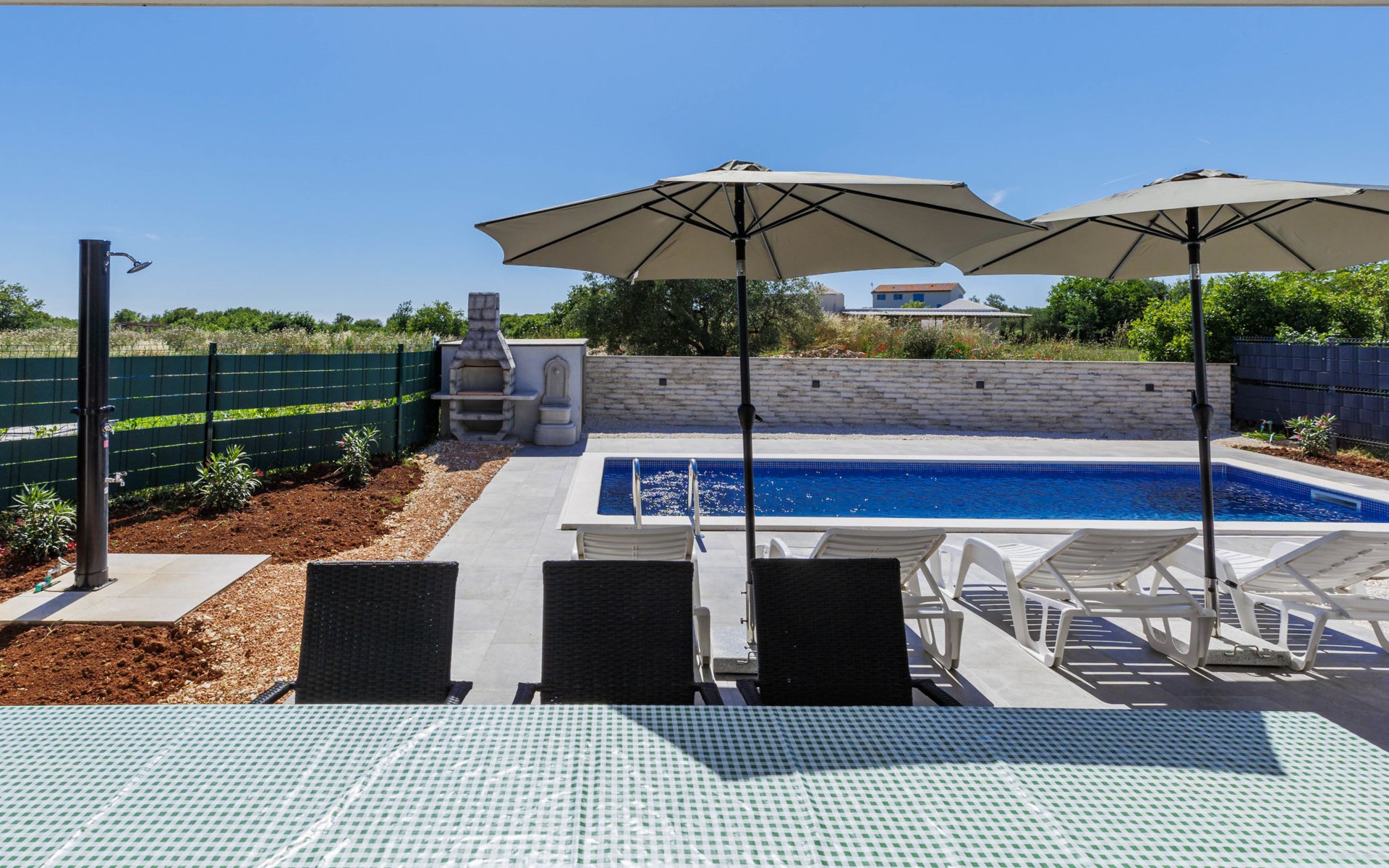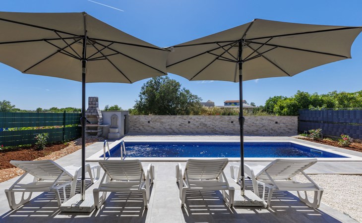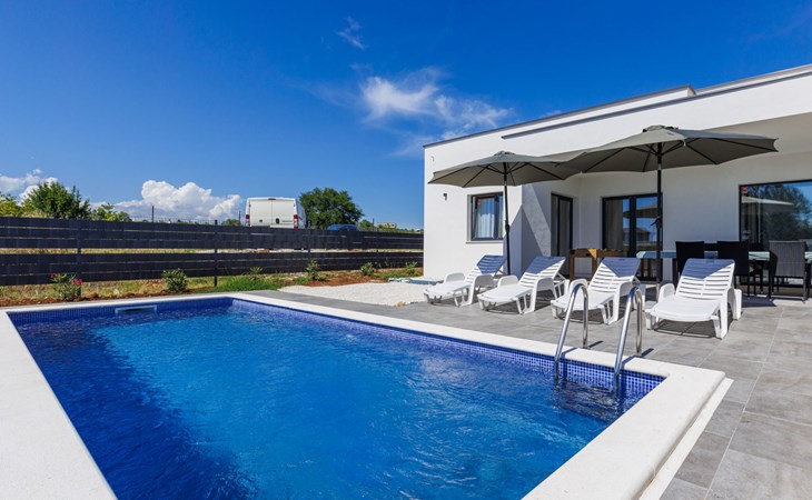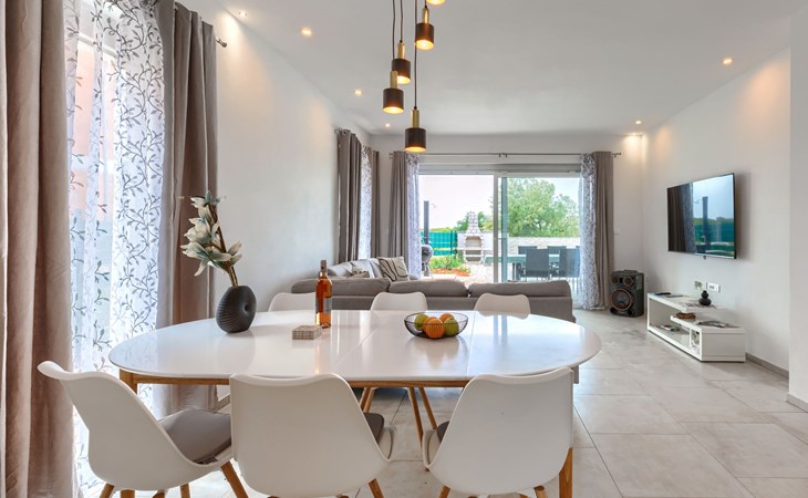 Vodnjan 7 km van Pula: Villa "Romeo". 1 km van het centrum van Vodnjan, 10 km van het centrum van Pula, zonnige ligging, 6 km van zee. Voor alleengebruik: terrein 510 m2 (omheind), tuin, openluchtzwembad hoekig (8 x 3 m, 140 cm diepte, seizoensgebonden beschikbaarheid: 01.Mei. - 01.Okt.) met zout-elektrolyse. Buitendouche, onderhoud zwembad door de eigenaar/tuinman. In het huis: internetaansluiting, air-conditioning, wasmachine. Parkeerplaats (voor 3 auto's) bij het huis op het terrein. Oplaadstation. Supermarkt 400 m, restaurant 600 m, bushalte 750 m, kiezelstrand 6 km. Voor grote groepen met jongeren is een dubbele borg gevraagd bij aankomst. .