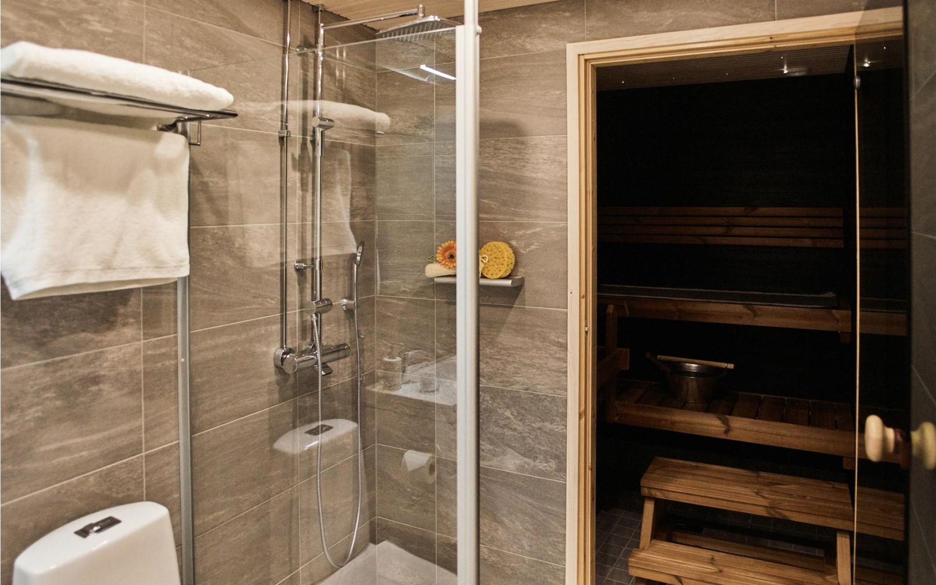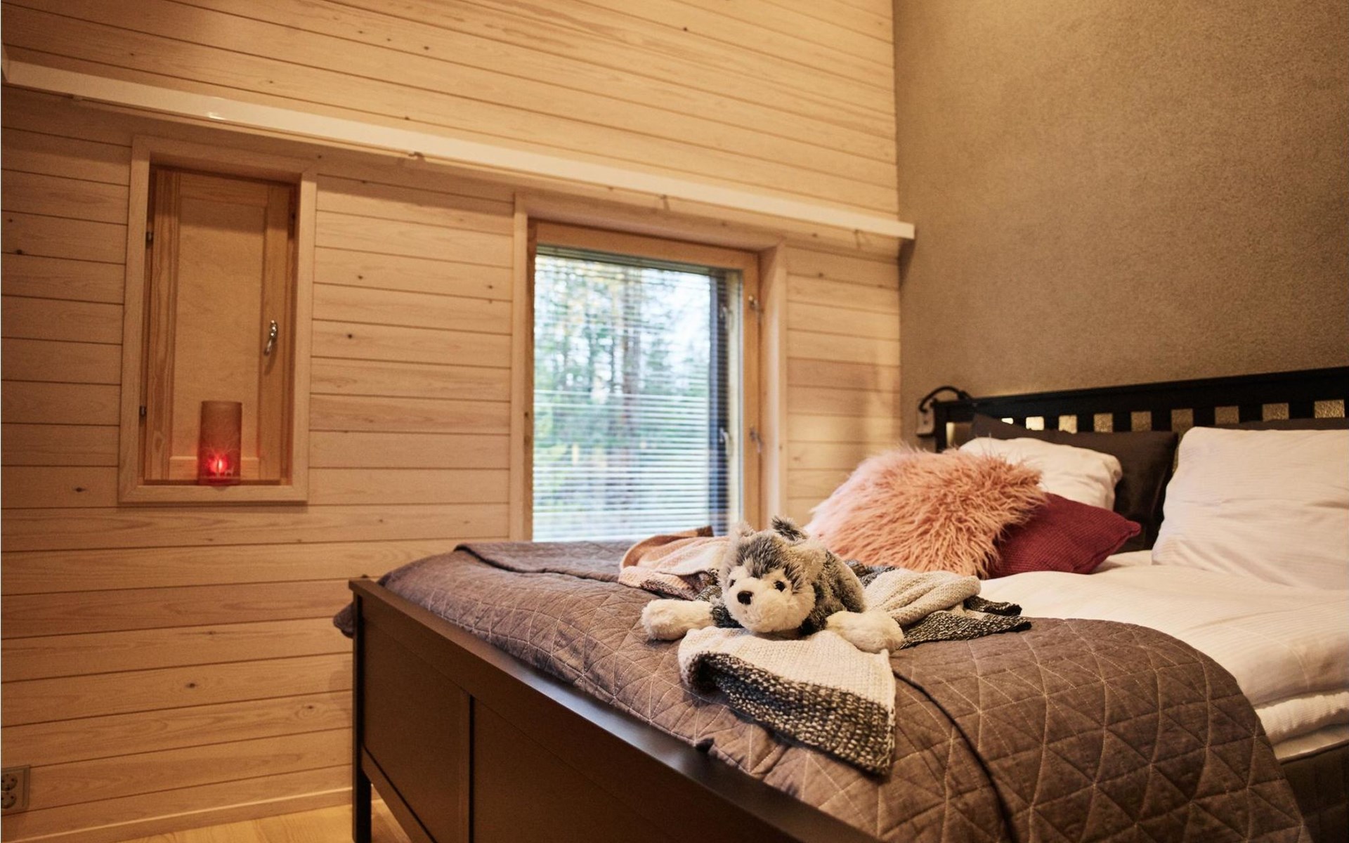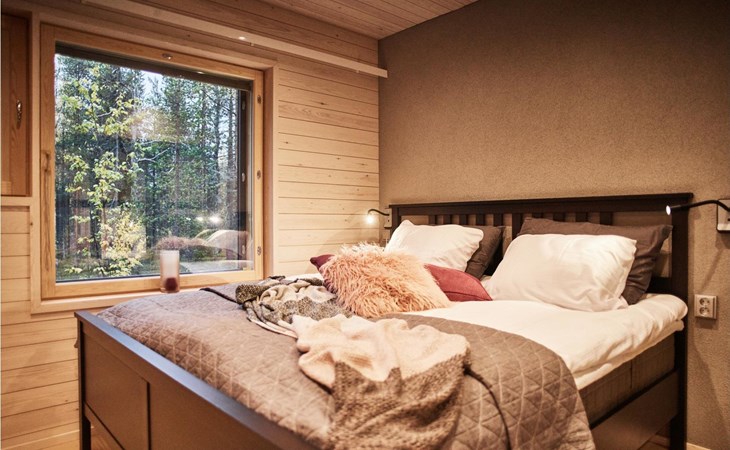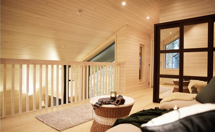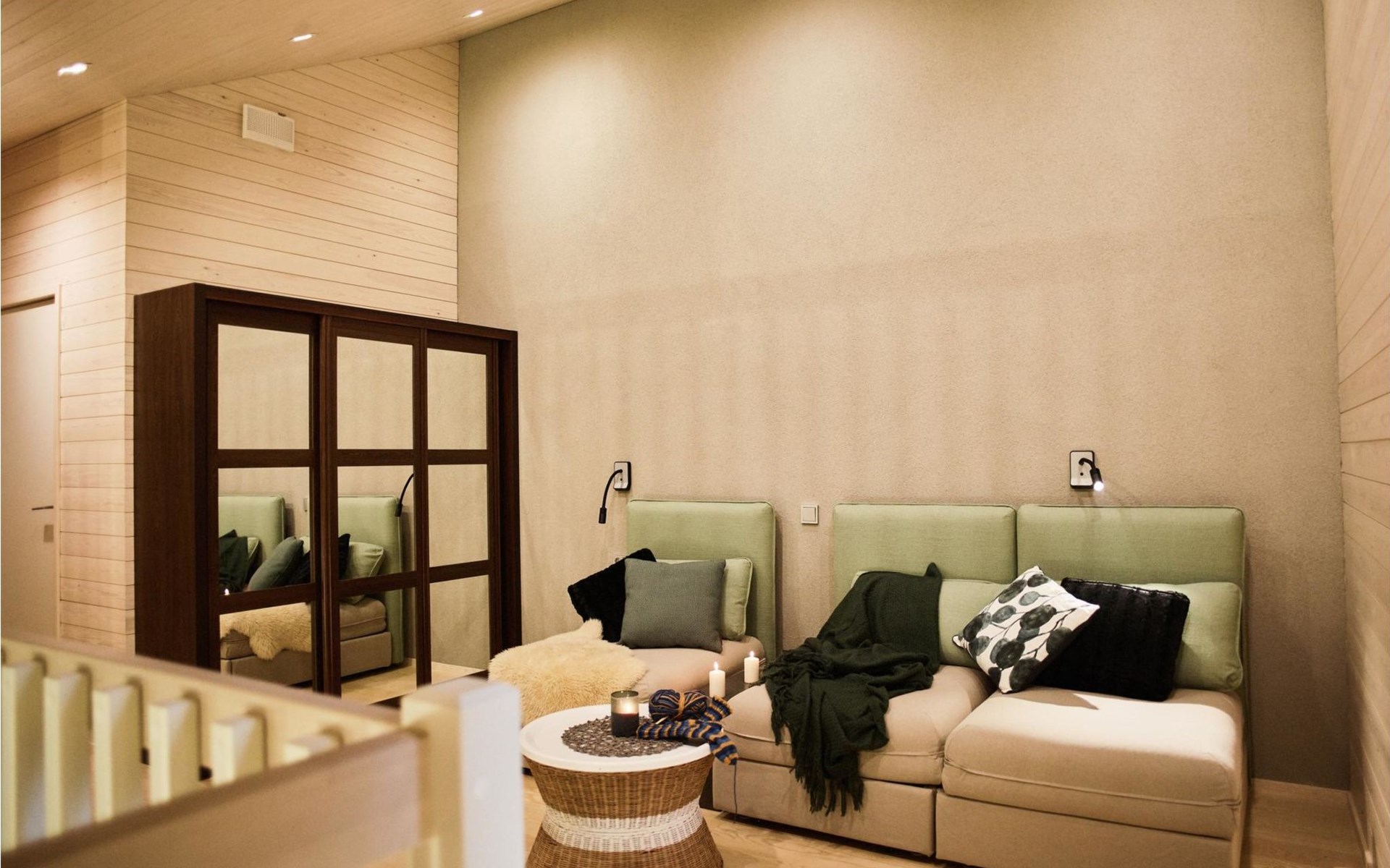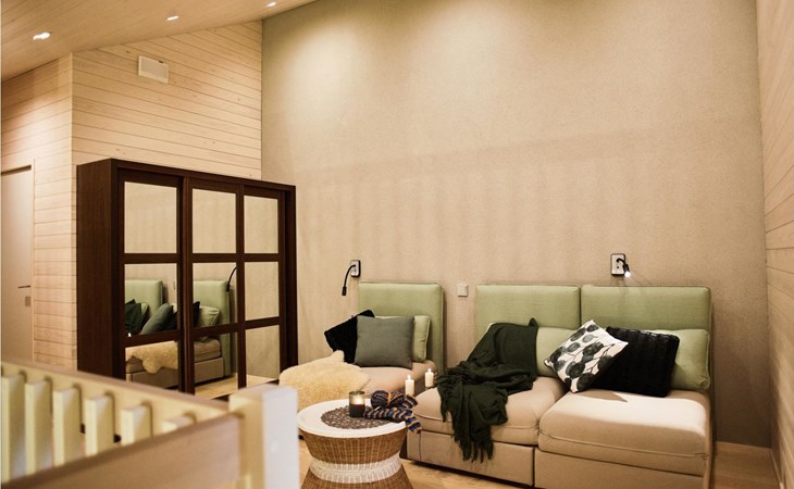 Apartment in a semi-detached house, built in 2017. Living room/kitchen with sofa bed, bedroom with double bed, sauna, washroom/WC, and covered terrace.