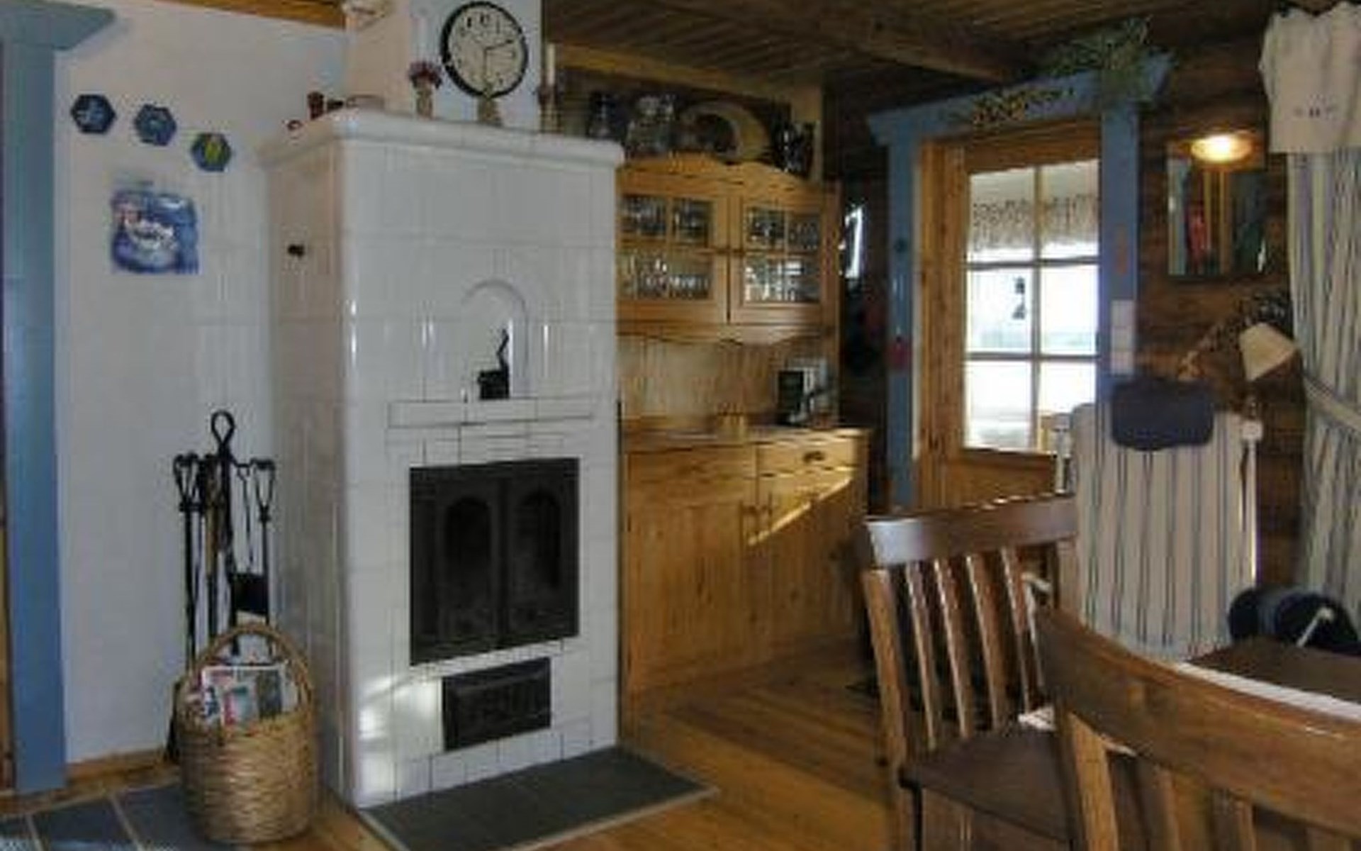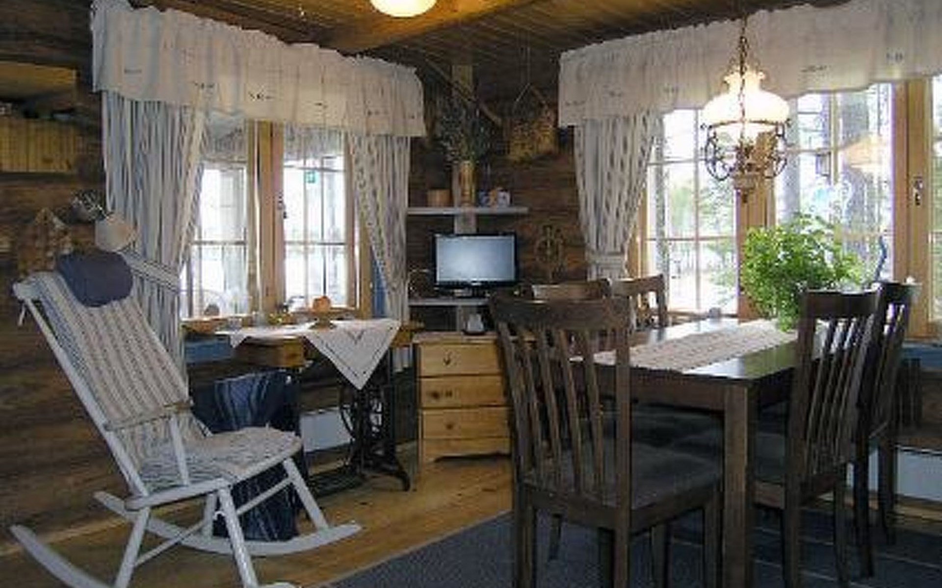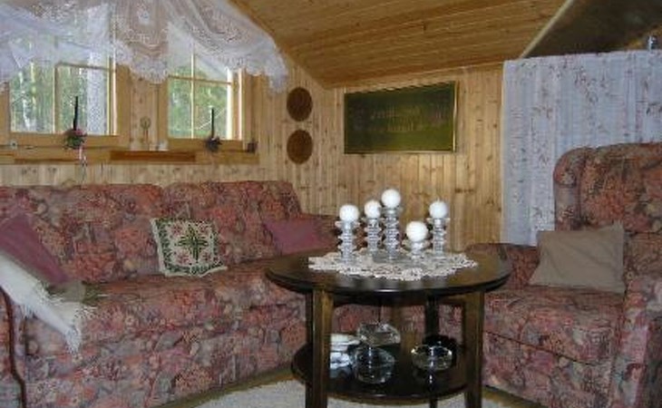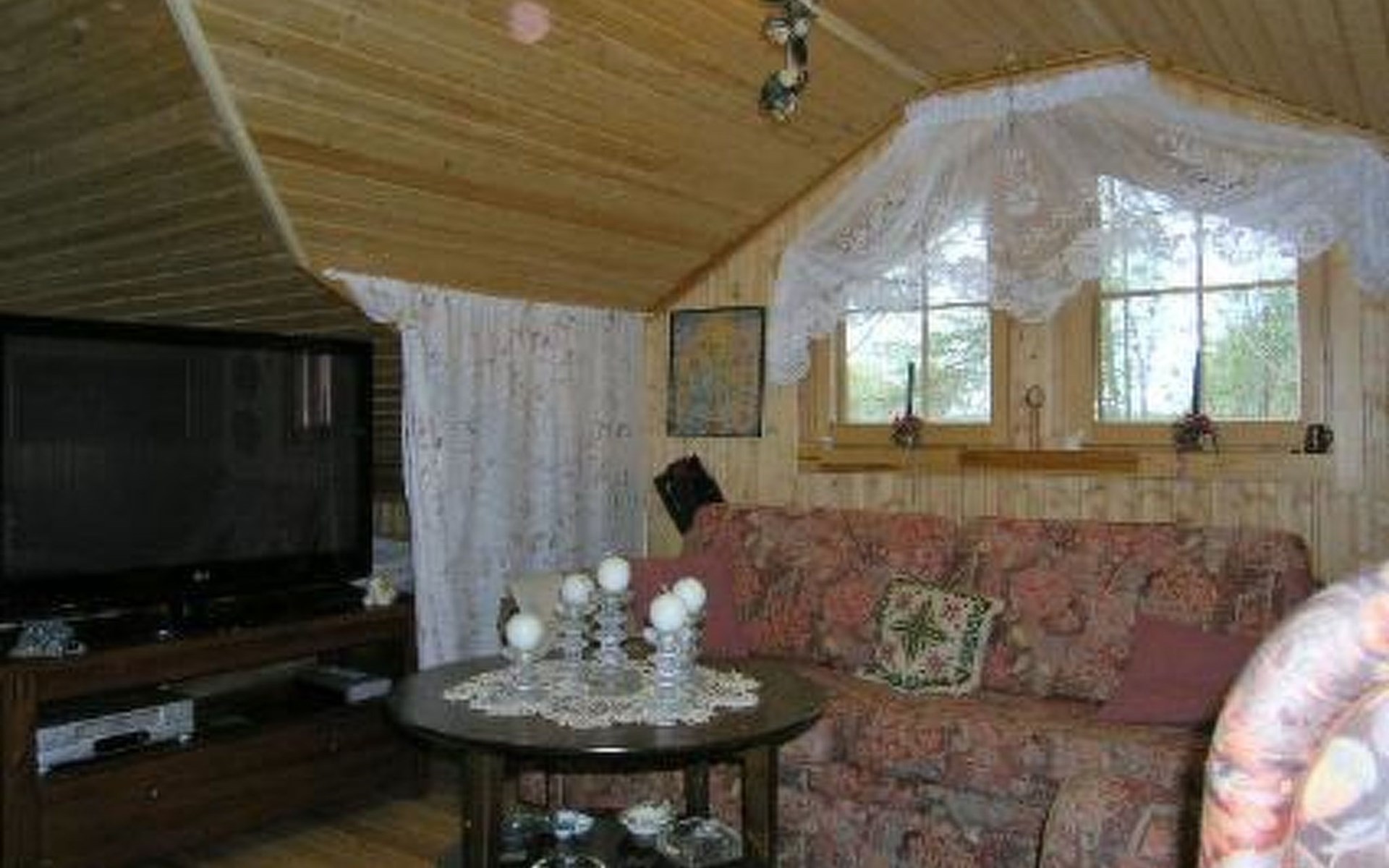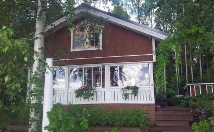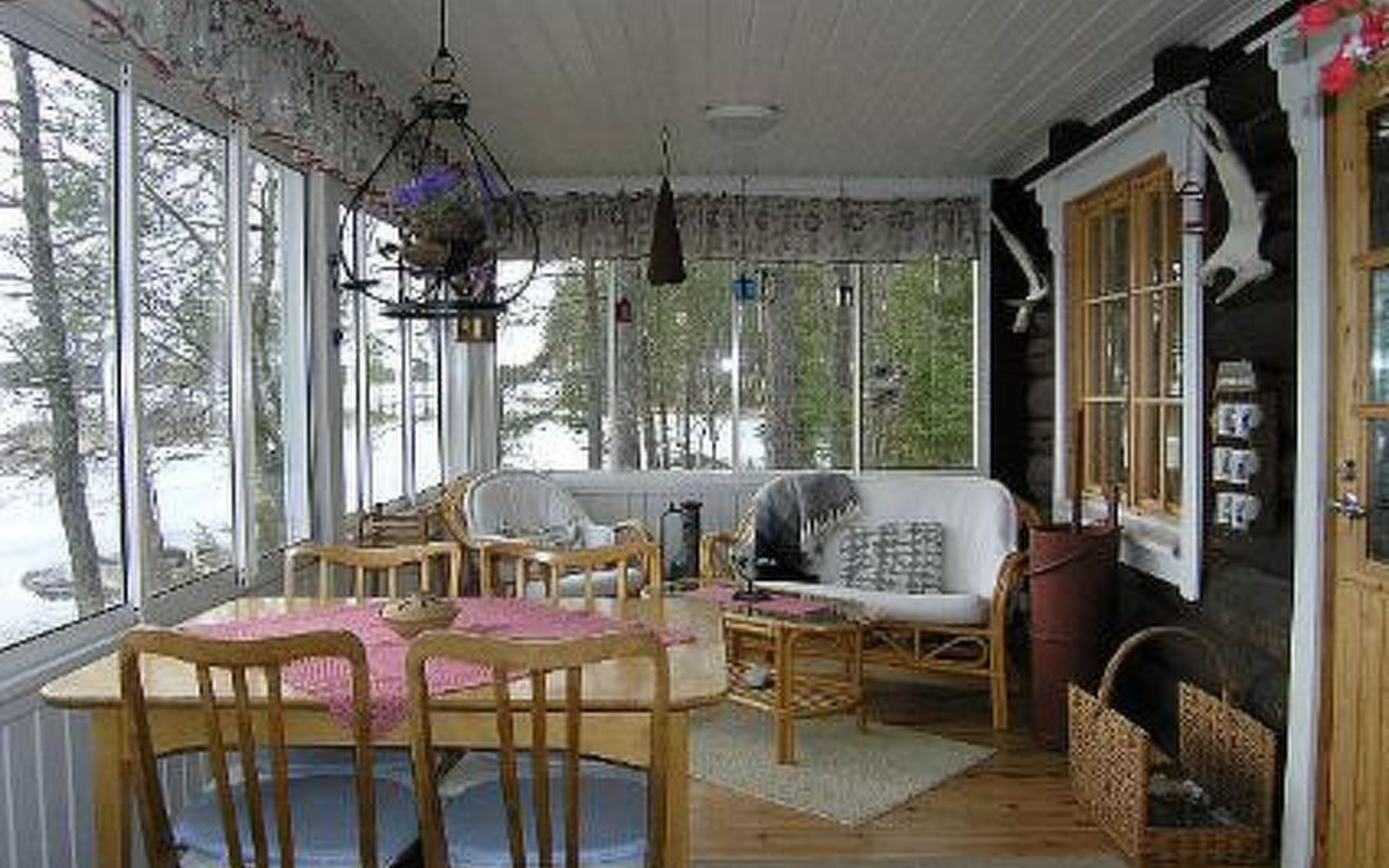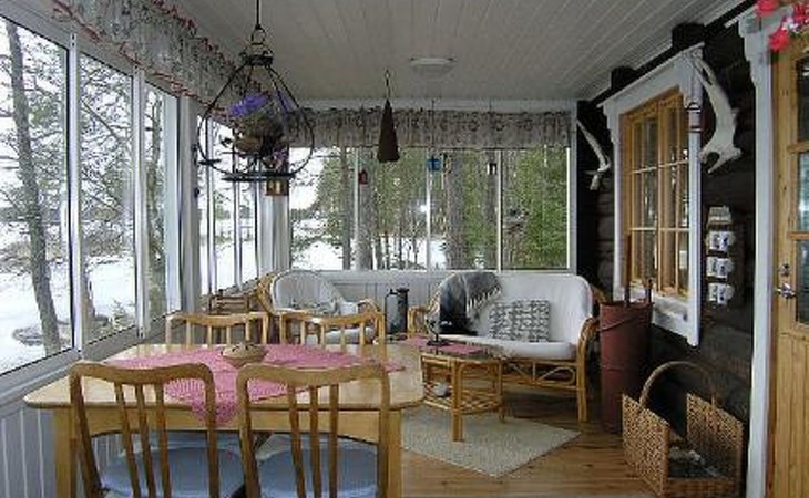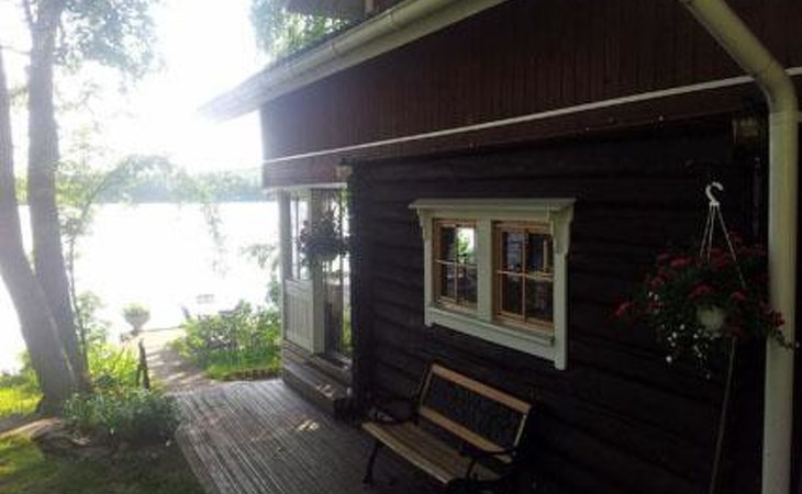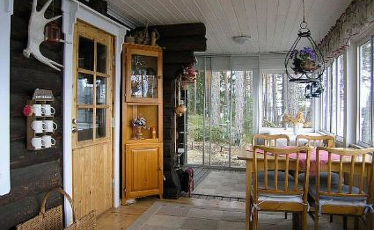 Two-storey log cottage 2006, on the ground floor entrance hall, spacious kitchen, bedroom with double bed, utility room and shower room, walk-in shower, toilet, glass veranda (15 m²) where dining table for 10 people, terrace.
