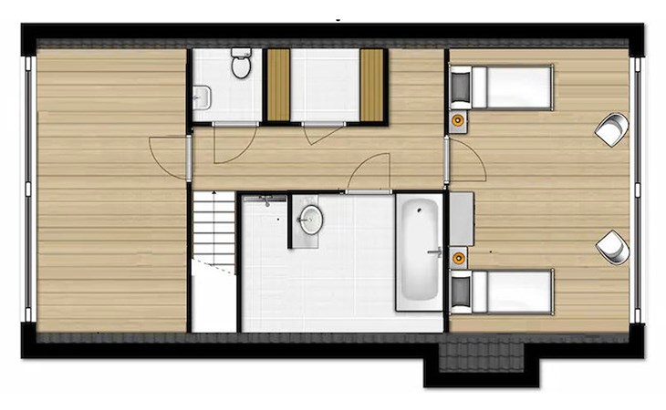 Op de begane grond bevindt zich 1 slaapkamer met 2 éénpersoons boxsprings. Grenzend aan de slaapkamer is er een open badkamer met inloopdouche en wastafel. Daarnaast is er een apart toilet. De eerste verdieping heeft 1 slaapkamer met 2 éénpersoons boxsprings en een extra kamer. De badkamer beschikt over een ligbad, inloopdouche en een wastafel. Er is ook een Finse sauna voor twee personen en een apart toilet op de eerste verdieping.