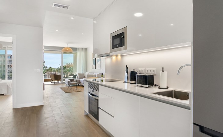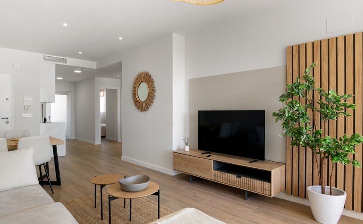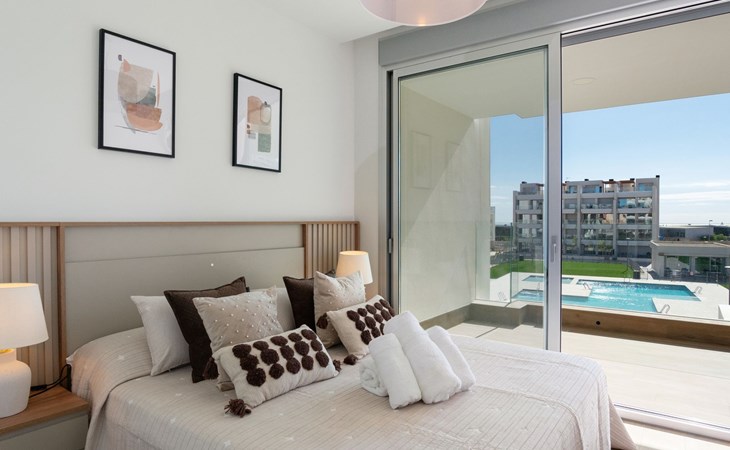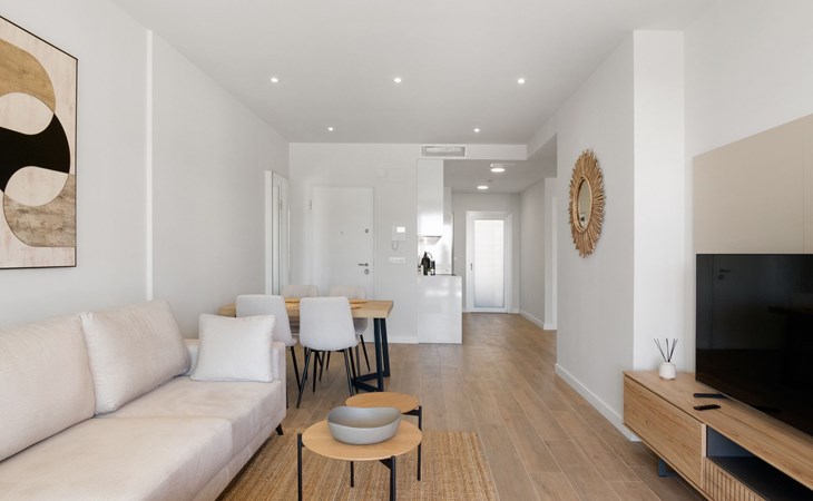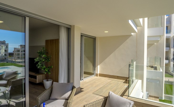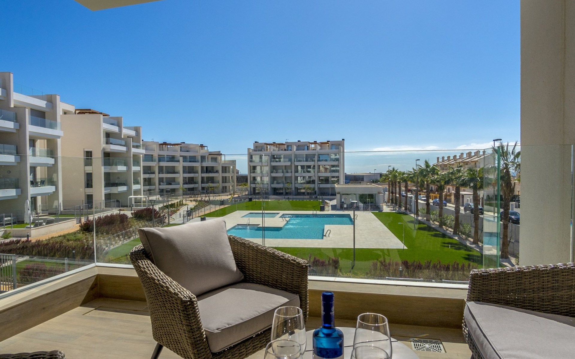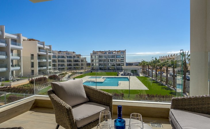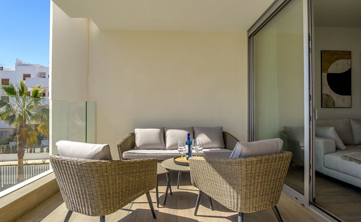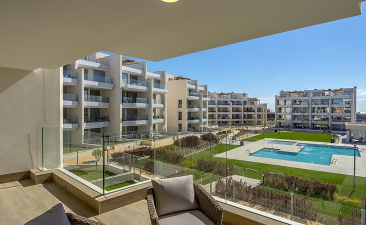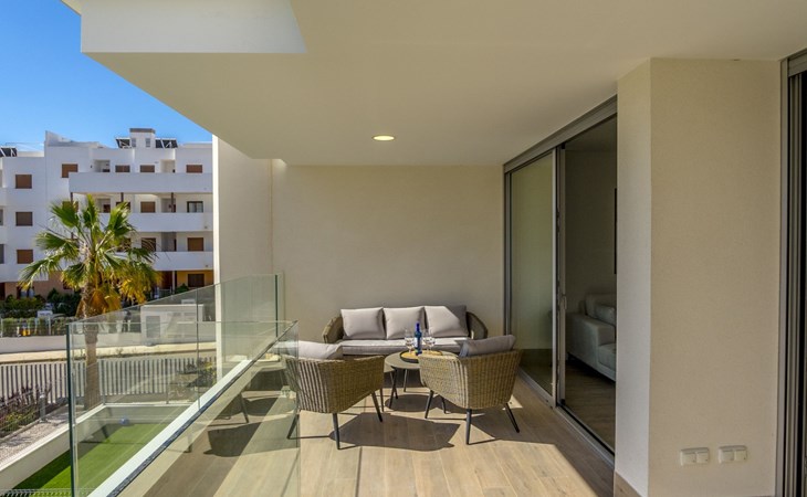 Moderne, mooi flatgebouw "Ema Residencial", van 4 verdiepingen, bouwjaar 2023. 3 km van het centrum van La Zenia, 4 km van het centrum van Punta Prima, 7 km van het centrum van Dehesa de Campoamor, gebied met weinig verkeer, 2.8 km van zee, 2.8 km van het strand. Voor medegebruik: terrein (omheind), openluchtzwembad (seizoensgebonden beschikbaarheid: 01.Jan. - 31.Dec.). Kinderzwembad, buitendouche, kinderspeelplaats. In het huis: lift. Levensmiddelenwinkel, supermarkt 950 m, restaurant 100 m, bushalte "Platja Flamenca – Mercadillo" 350 m, treinstation "Orihuela" 27 km, zandstrand "Playa la Zenia" 3 km. Golfterrein (18 holes) 1.9 km. De eigenaar accepteert geen groepen.