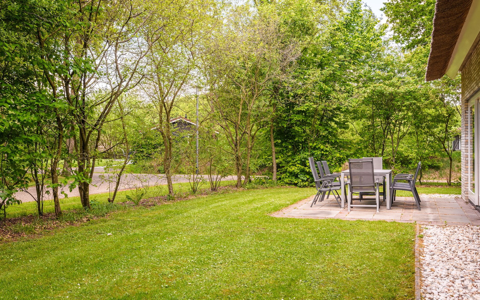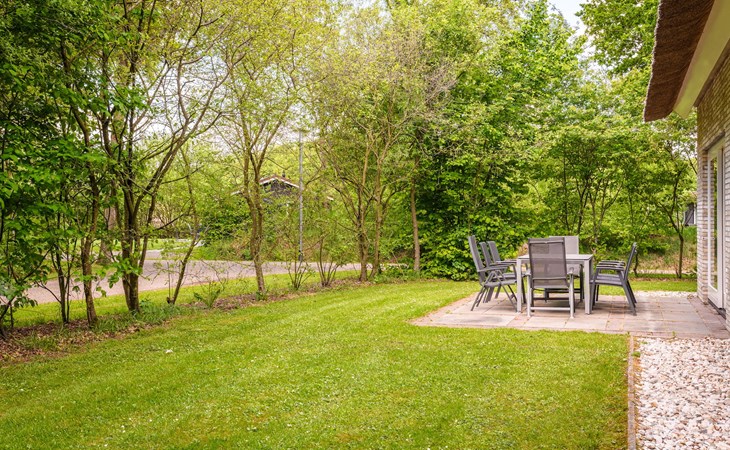 Buiten is er een royale tuin met een gemeubileerd terras en een parasol.