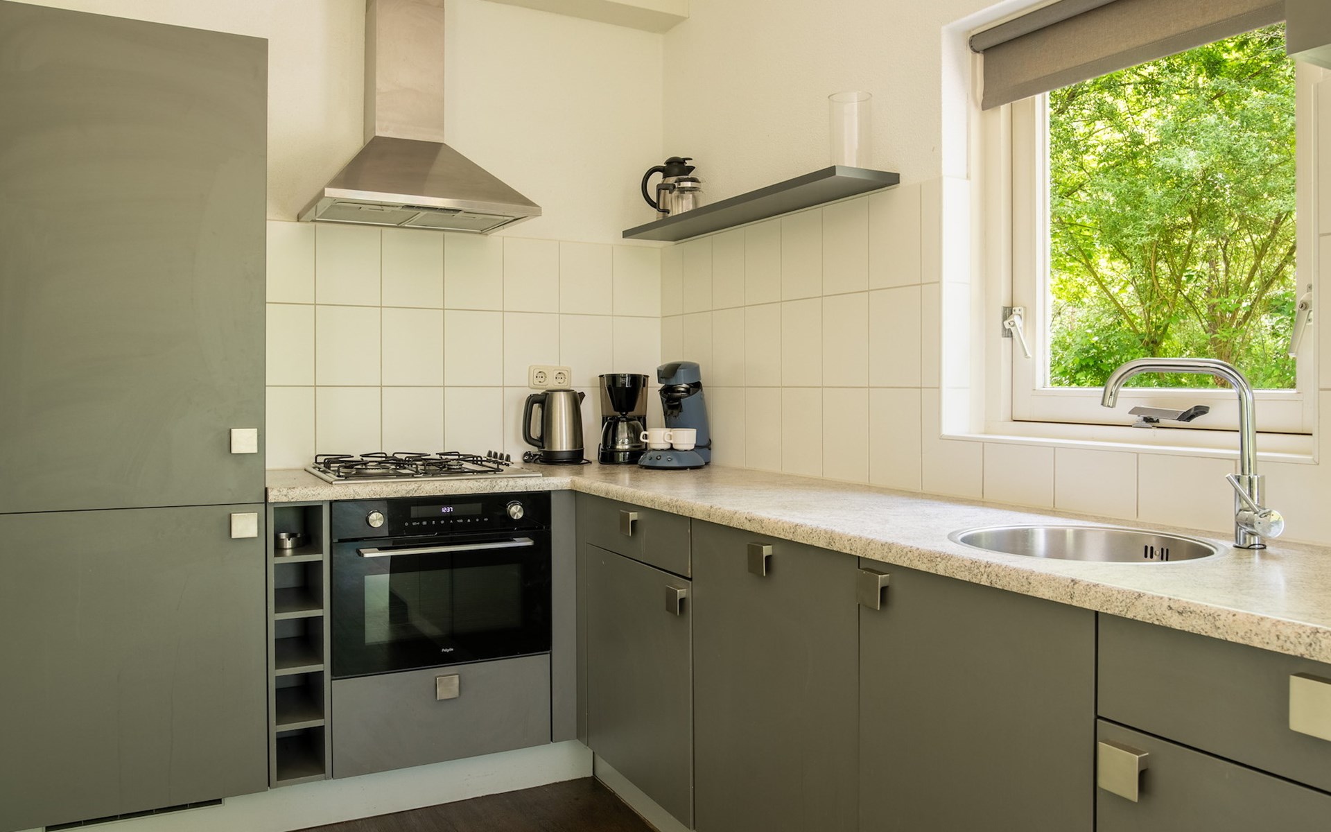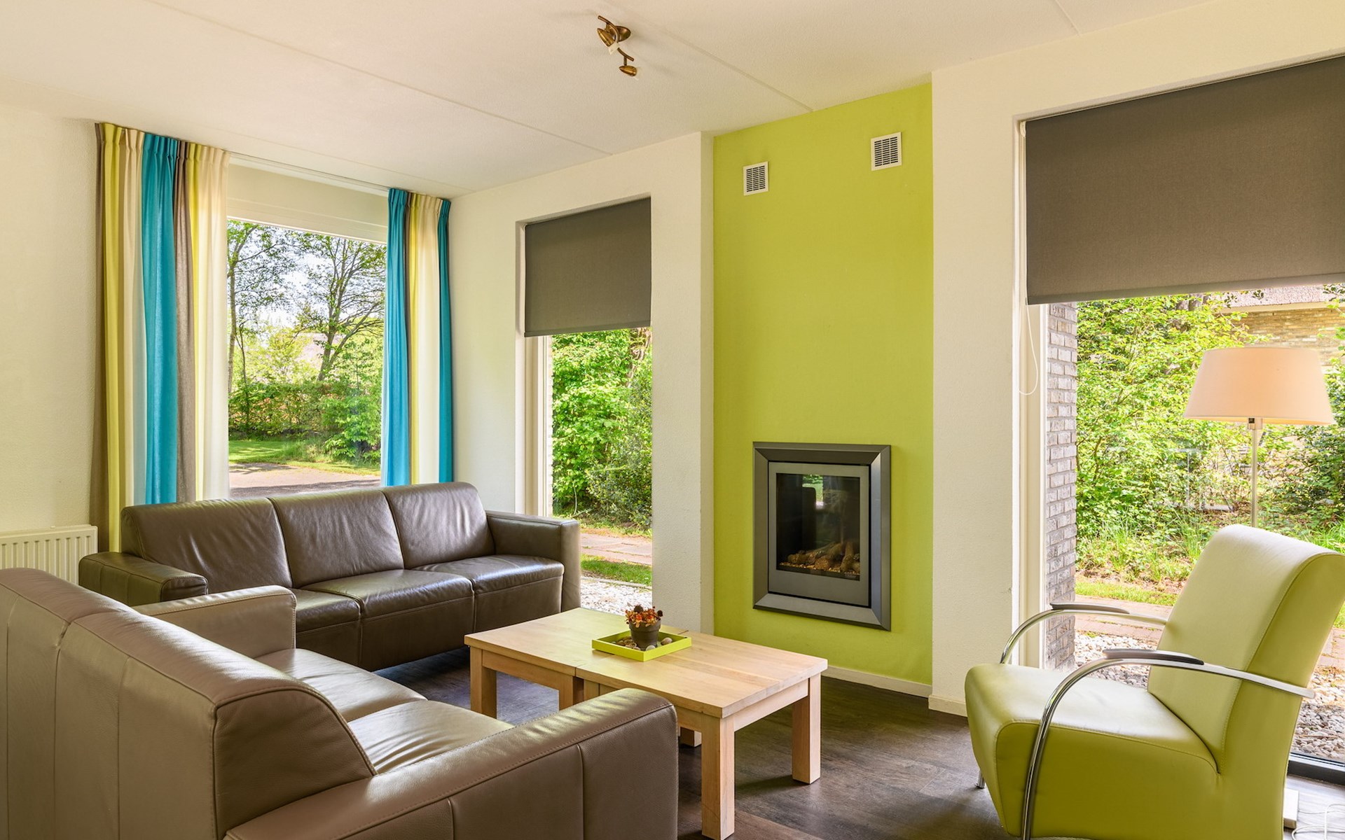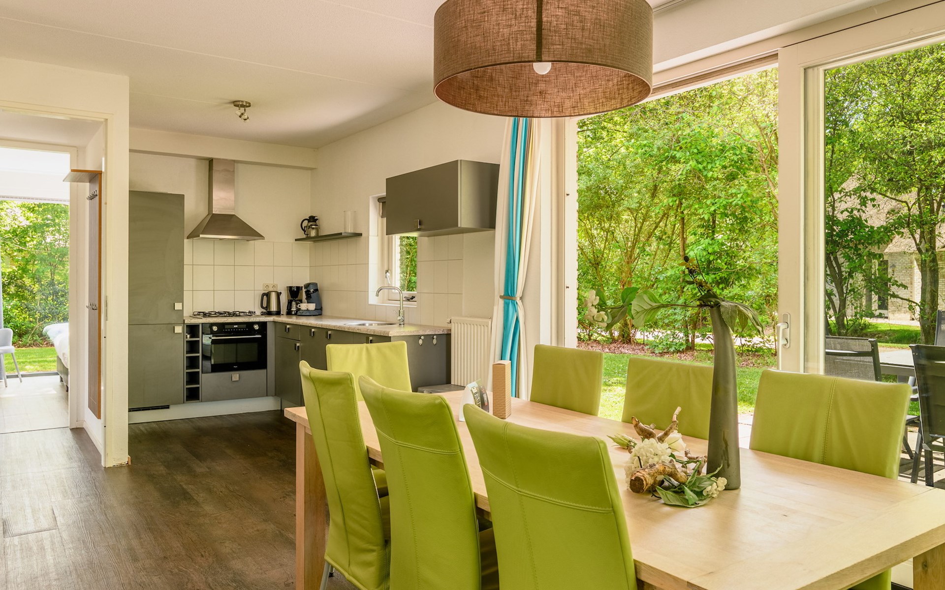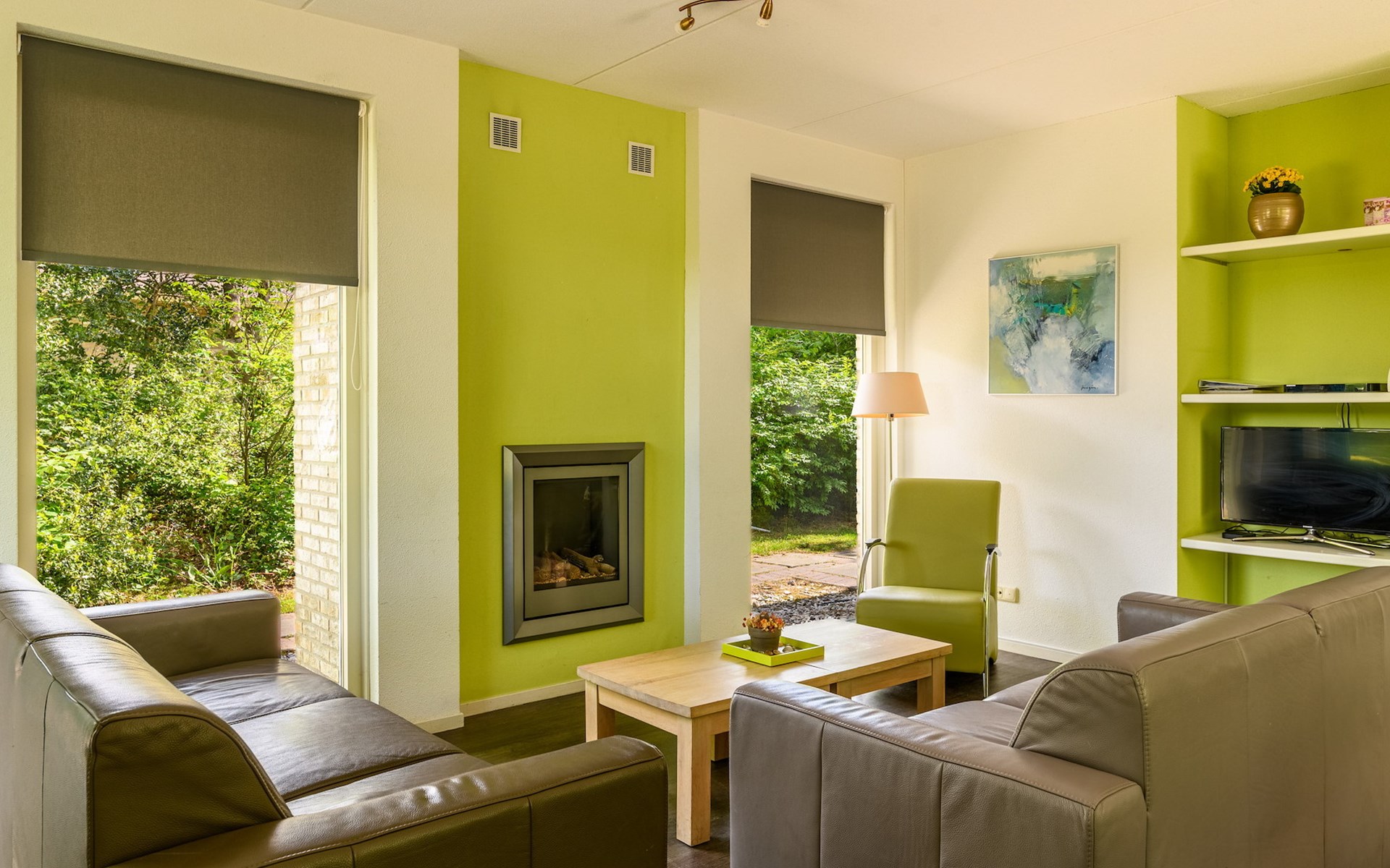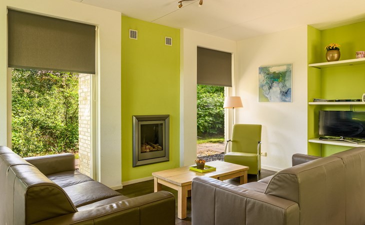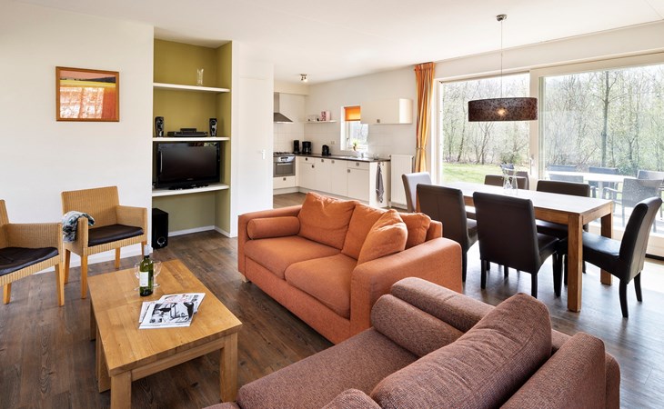 De woonkamer is ingericht met een zithoek, televisie met dvd-speler en een sfeerhaard. De villa heeft een brede schuifpui naar het terras en een open keuken met een eethoek. De keuken is voorzien van onder andere een koel-vriescombinatie, Senseo apparaat, filterkoffiezetapparaat, combimagnetron en een vaatwasser.