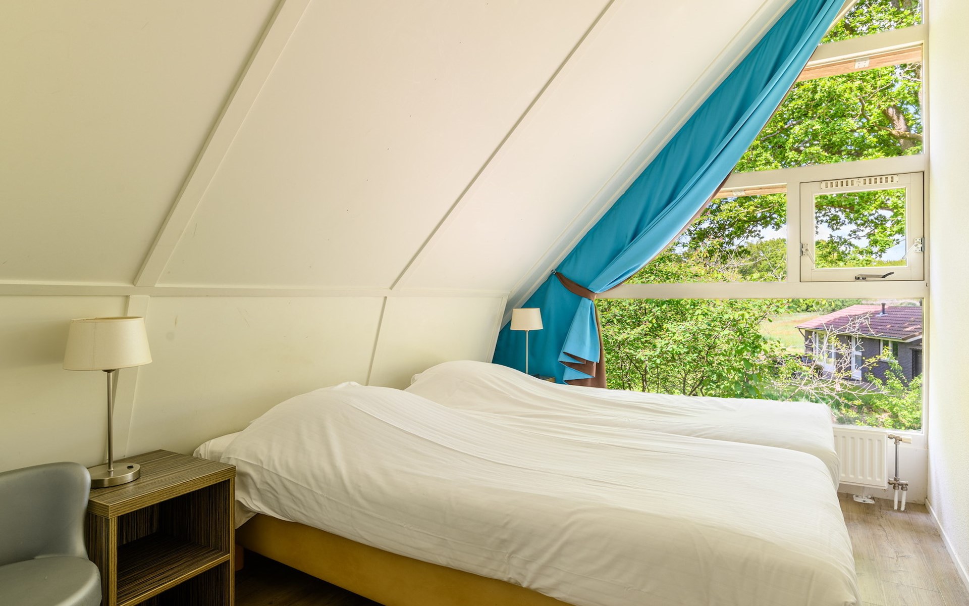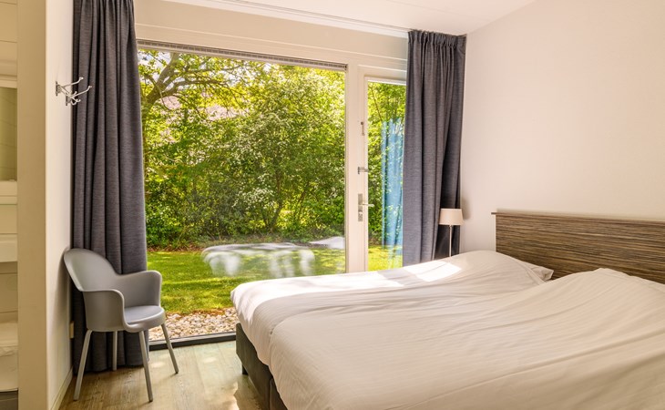 Op de begane grond bevindt zich 1 slaapkamer met 2 éénpersoons boxsprings. De aangrenzende open badkamer heeft een inloopdouche en wastafel. Daarnaast is er een apart toilet en heeft de villa een fietseninpandige berging met een wasmachine en een oplaadpunt voor elektrische fietsen.