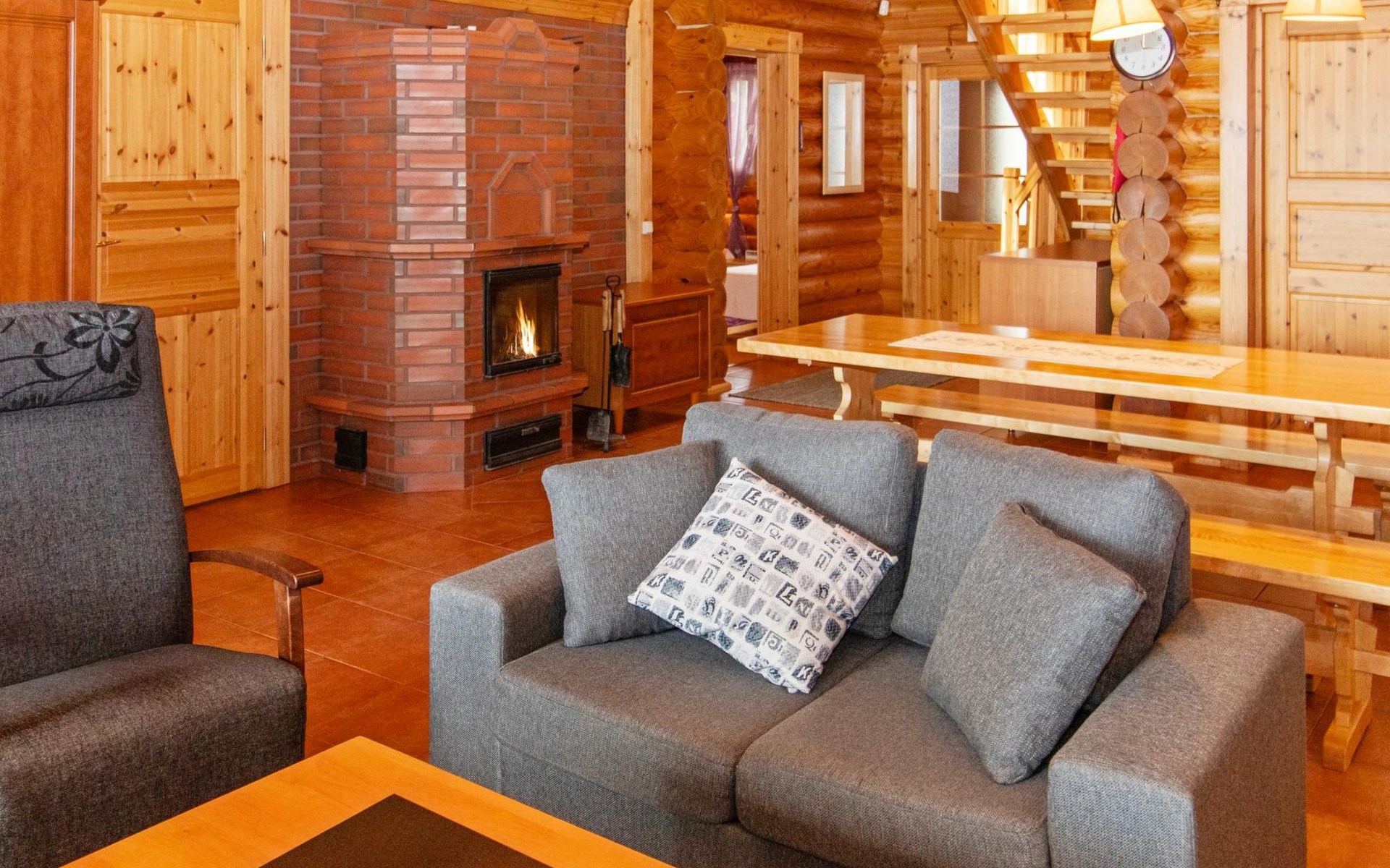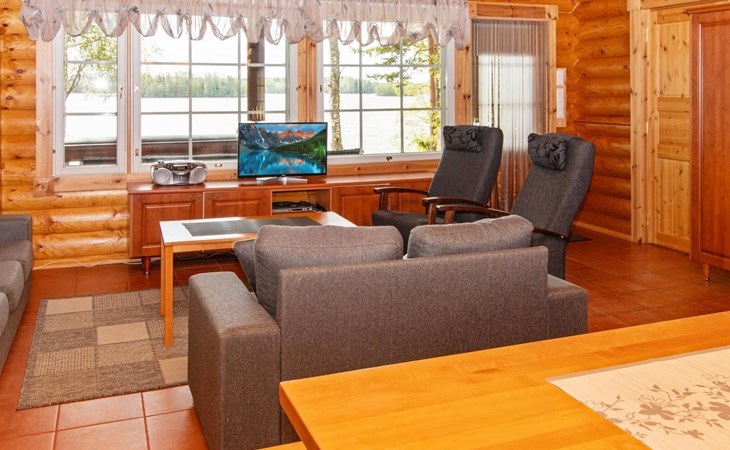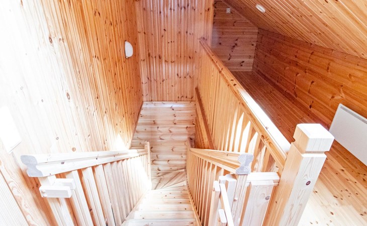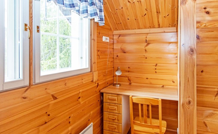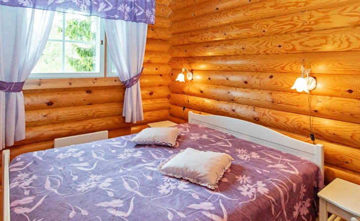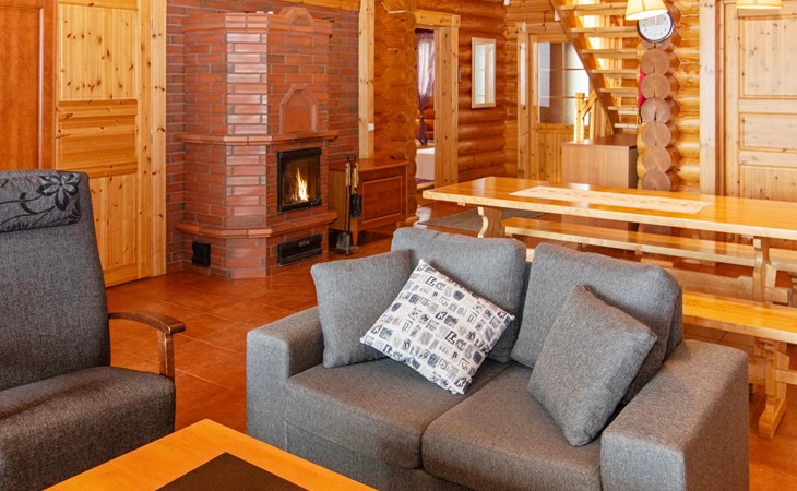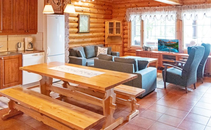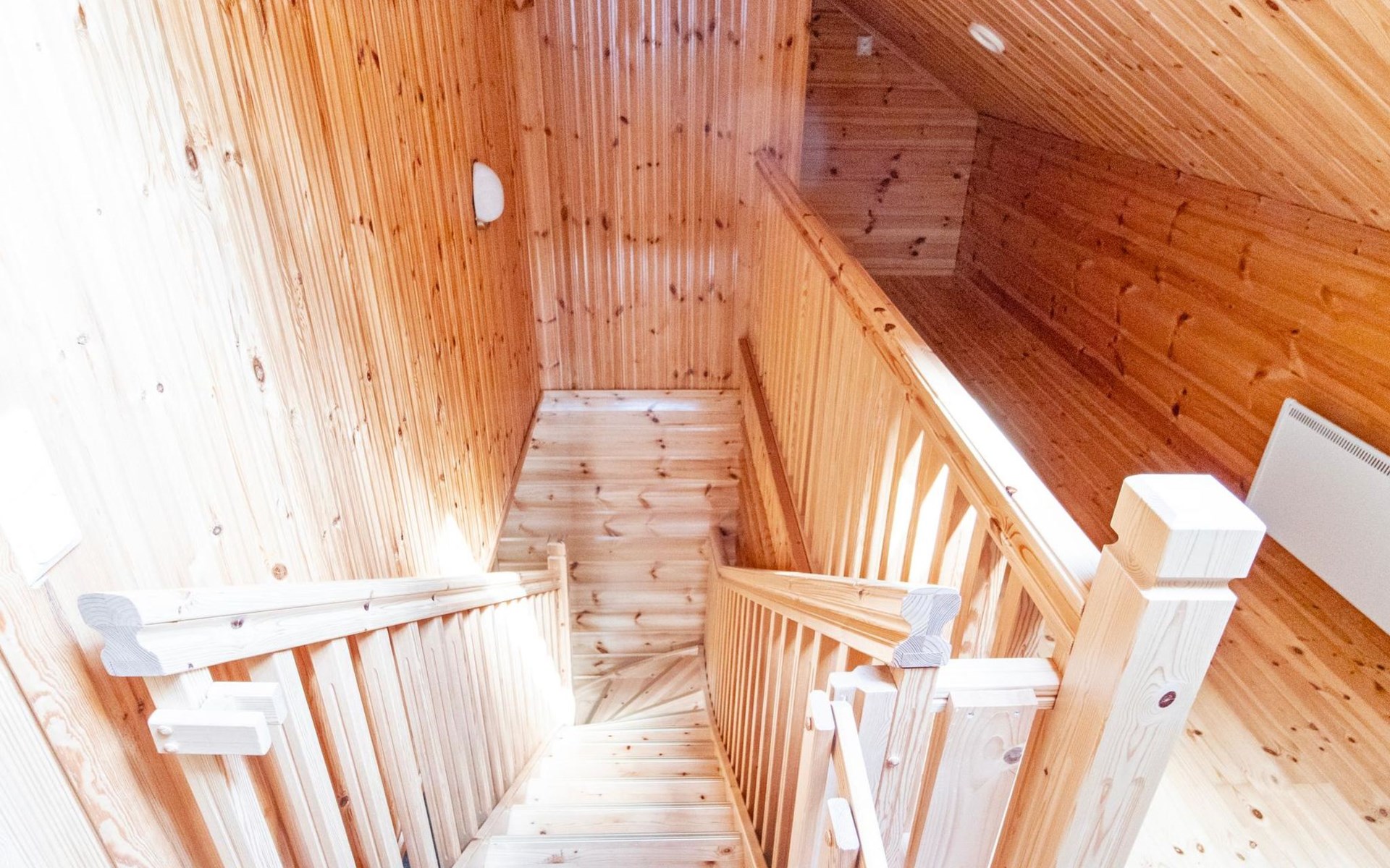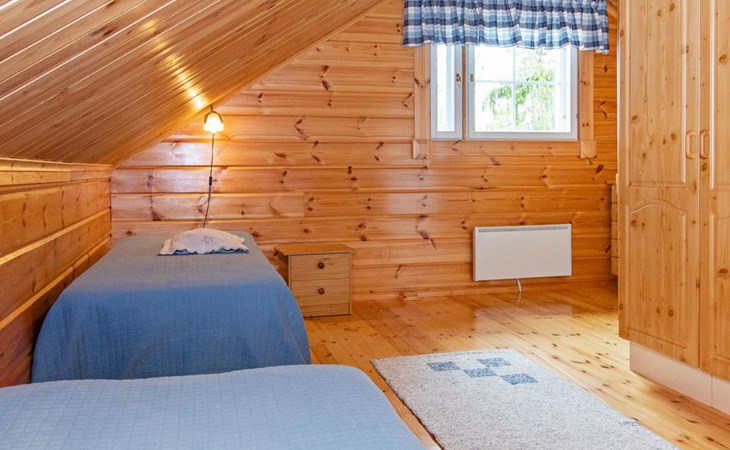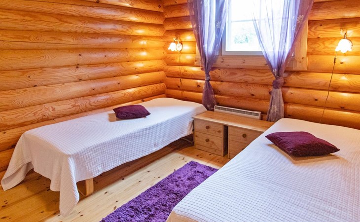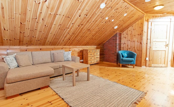 The 120 m² cabin was built in 2006. The ground floor features a living room/kitchen, and two bedrooms—one with a double bed and the other with two single beds. On the upper floor, there's a third bedroom with two single beds, and the hall has a convertible sofa bed. A child safety gate is installed at the top of the stairs. The cabin includes a washroom, a wood-heated sauna, and a separate WC.