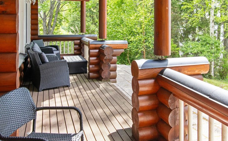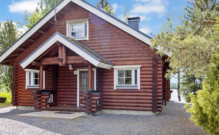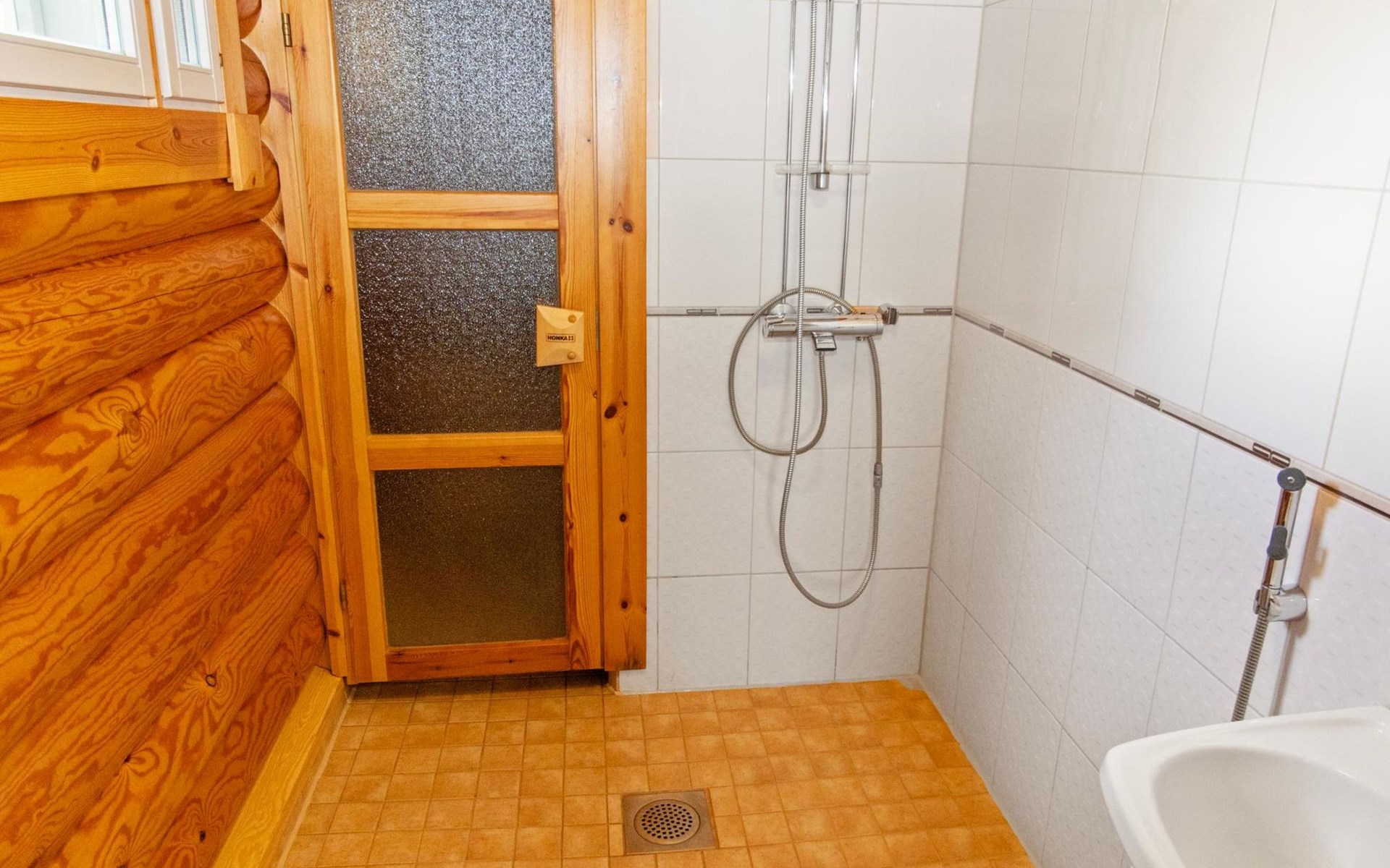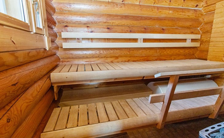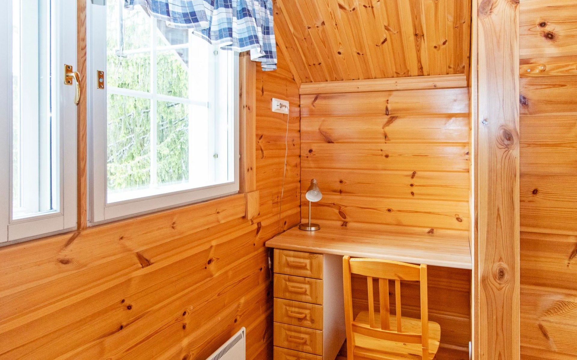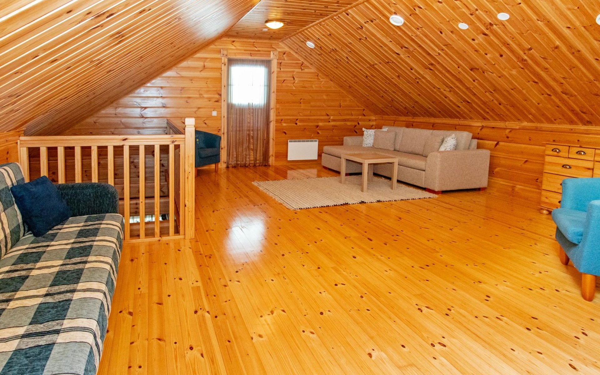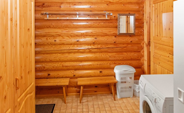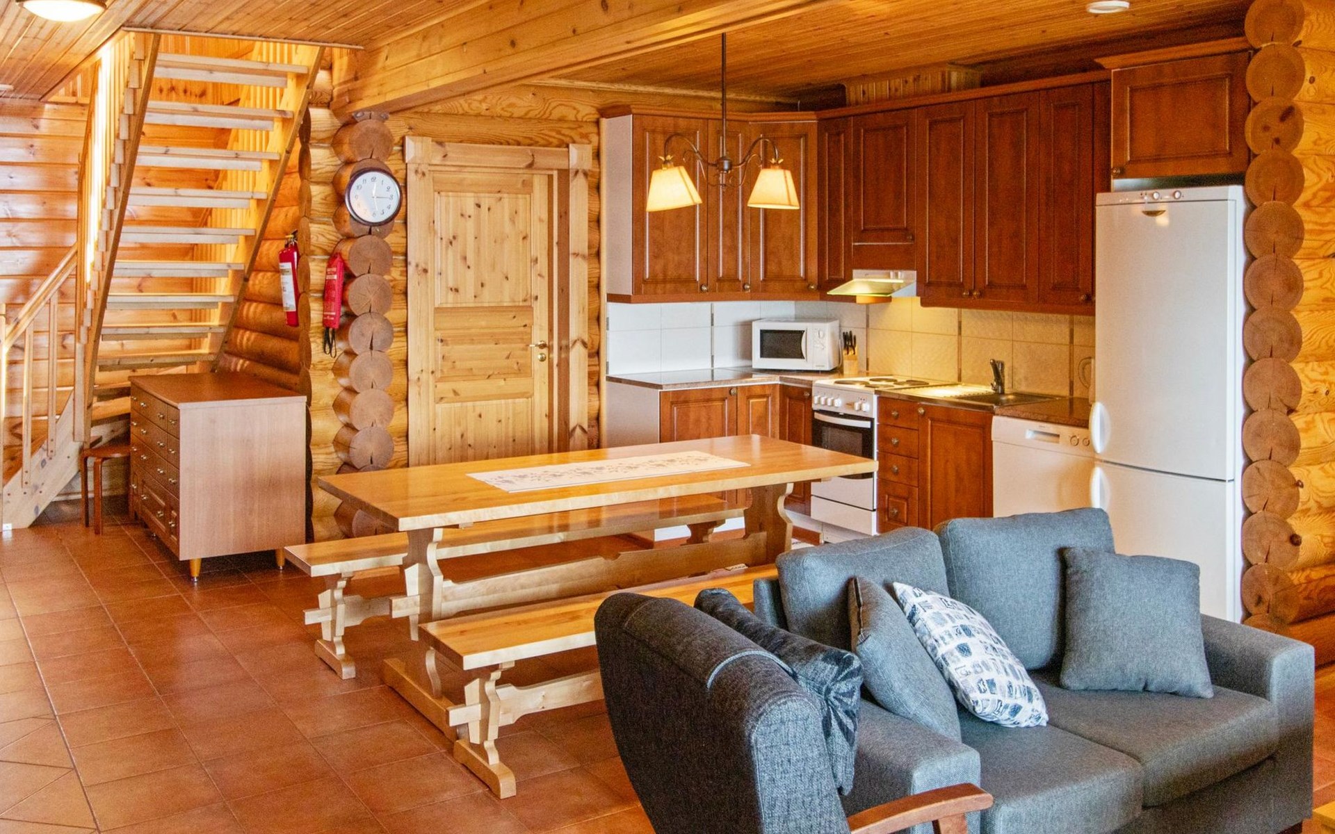 The 120 m² cabin was built in 2006. The ground floor features a living room/kitchen, and two bedrooms—one with a double bed and the other with two single beds. On the upper floor, there's a third bedroom with two single beds, and the hall has a convertible sofa bed. A child safety gate is installed at the top of the stairs. The cabin includes a washroom, a wood-heated sauna, and a separate WC.