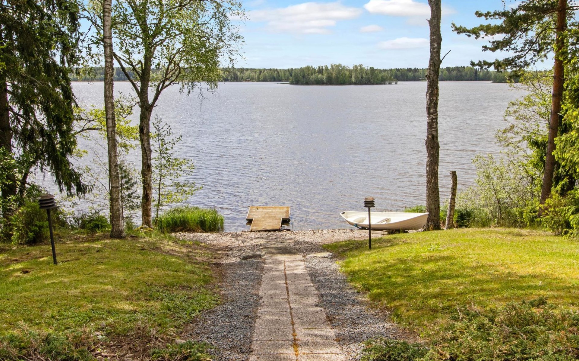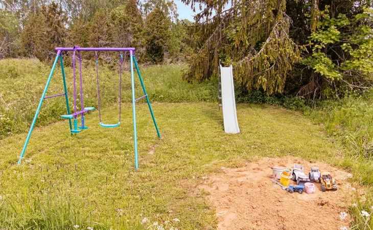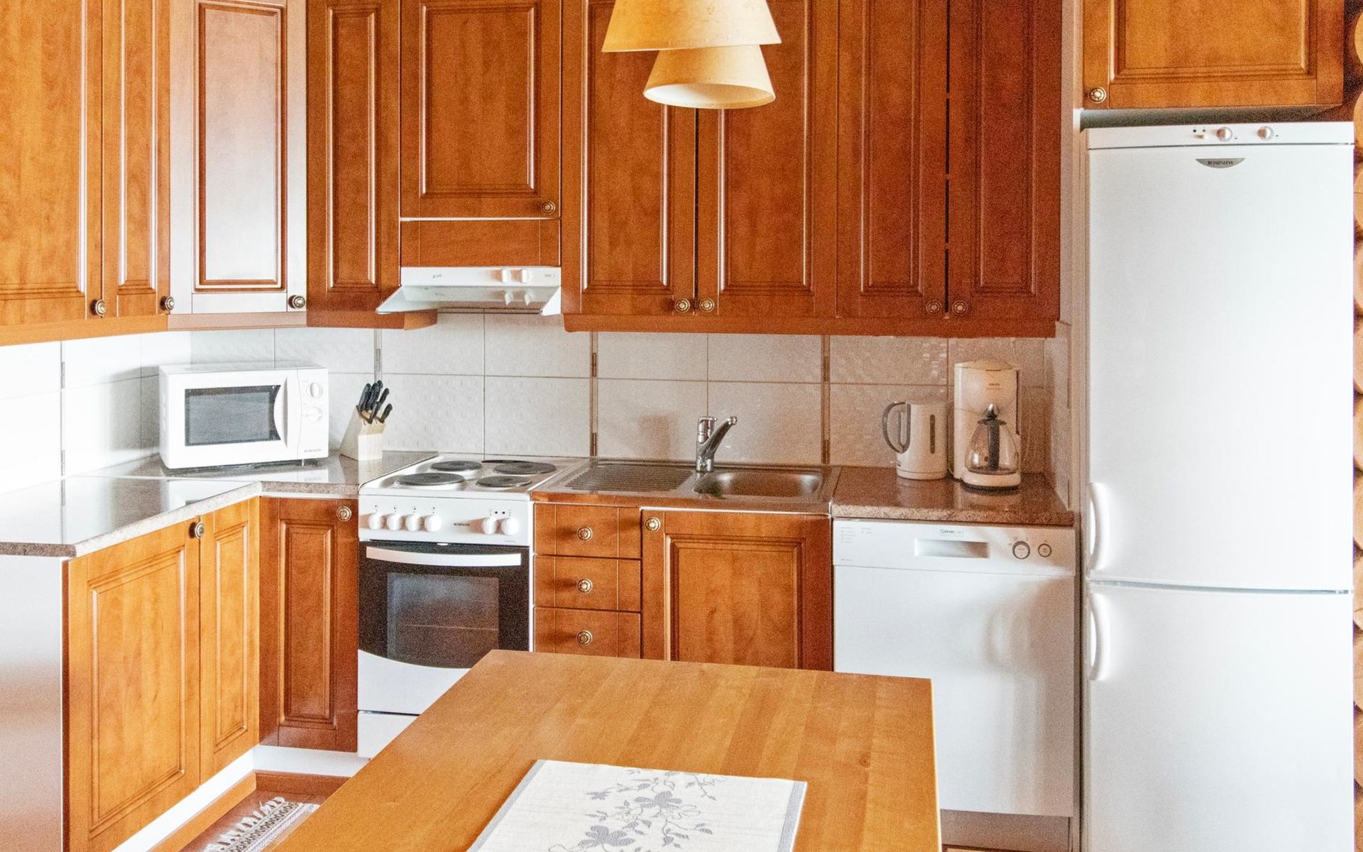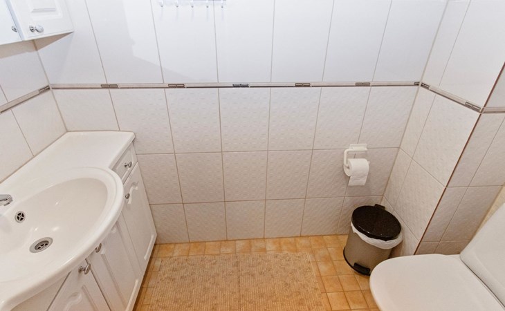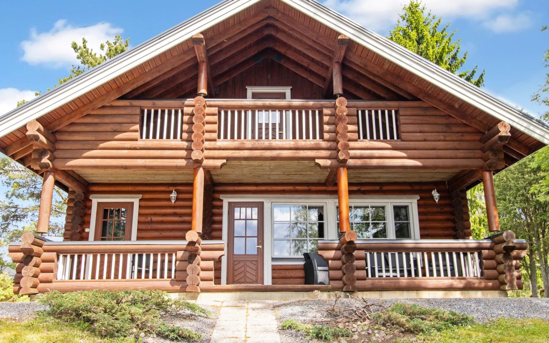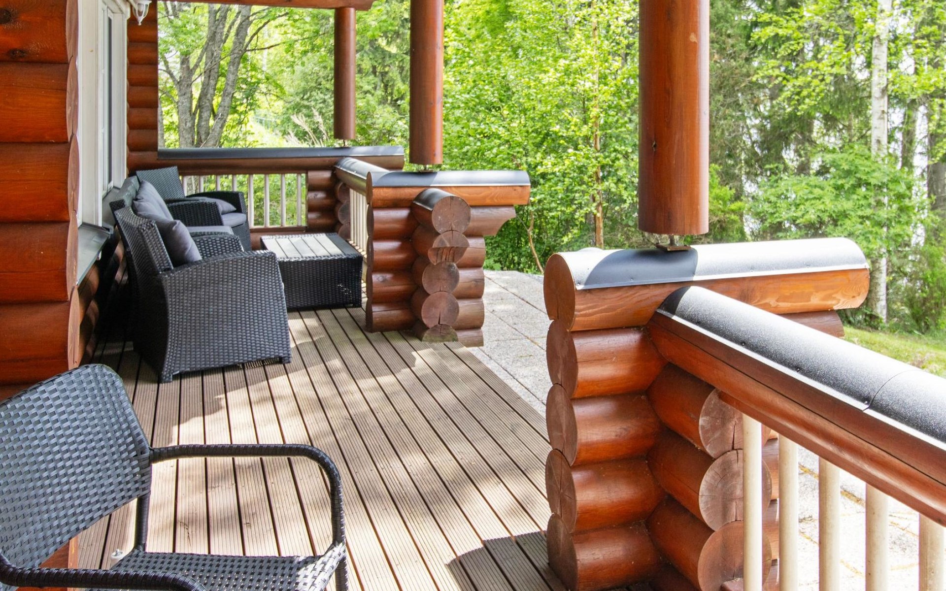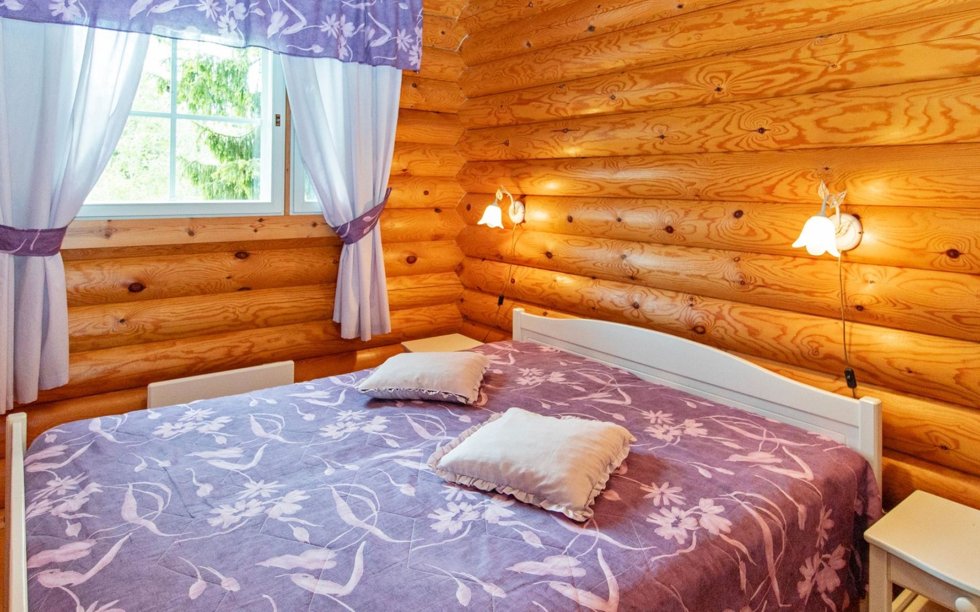 The 120 m² cabin was built in 2006. The ground floor features a living room/kitchen, and two bedrooms—one with a double bed and the other with two single beds. On the upper floor, there's a third bedroom with two single beds, and the hall has a convertible sofa bed. A child safety gate is installed at the top of the stairs. The cabin includes a washroom, a wood-heated sauna, and a separate WC.
