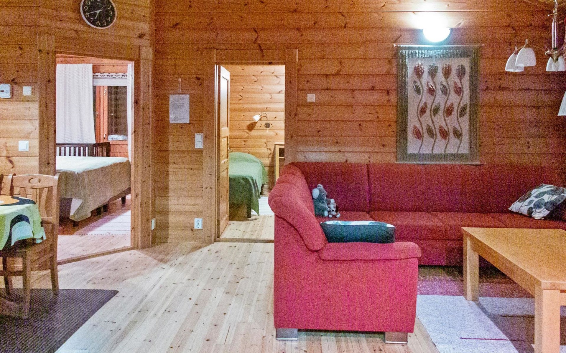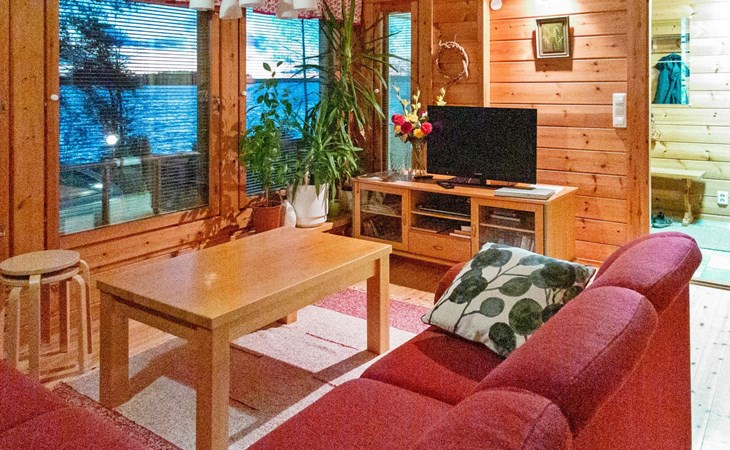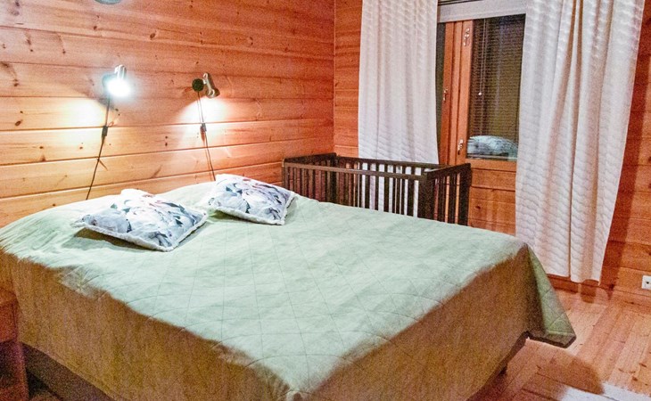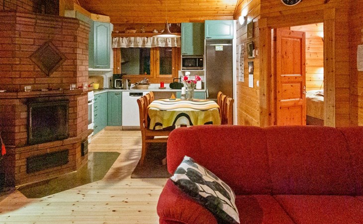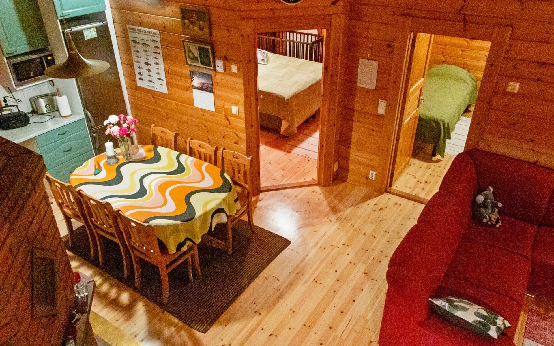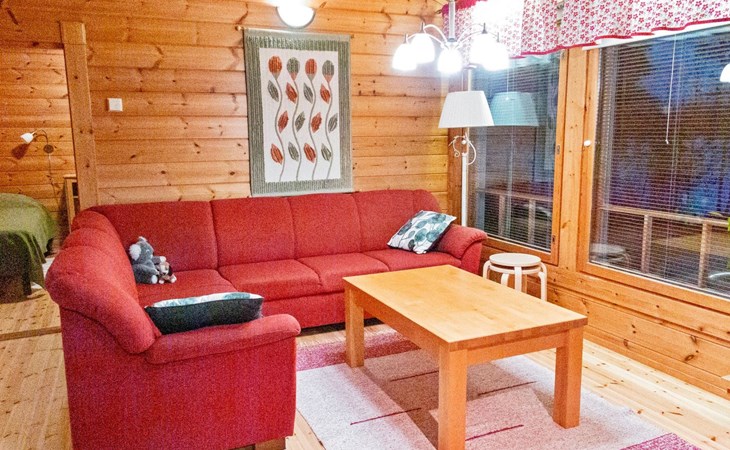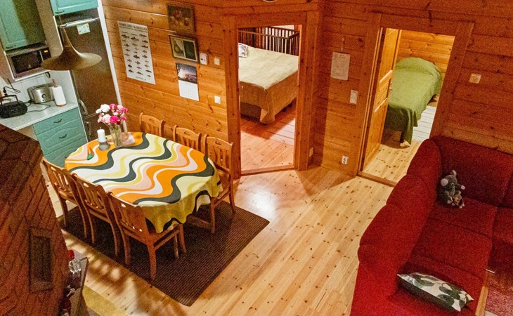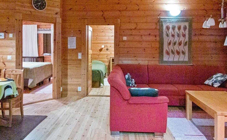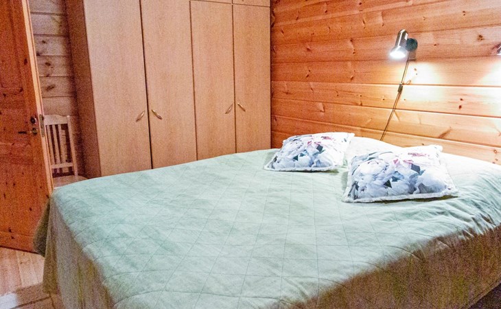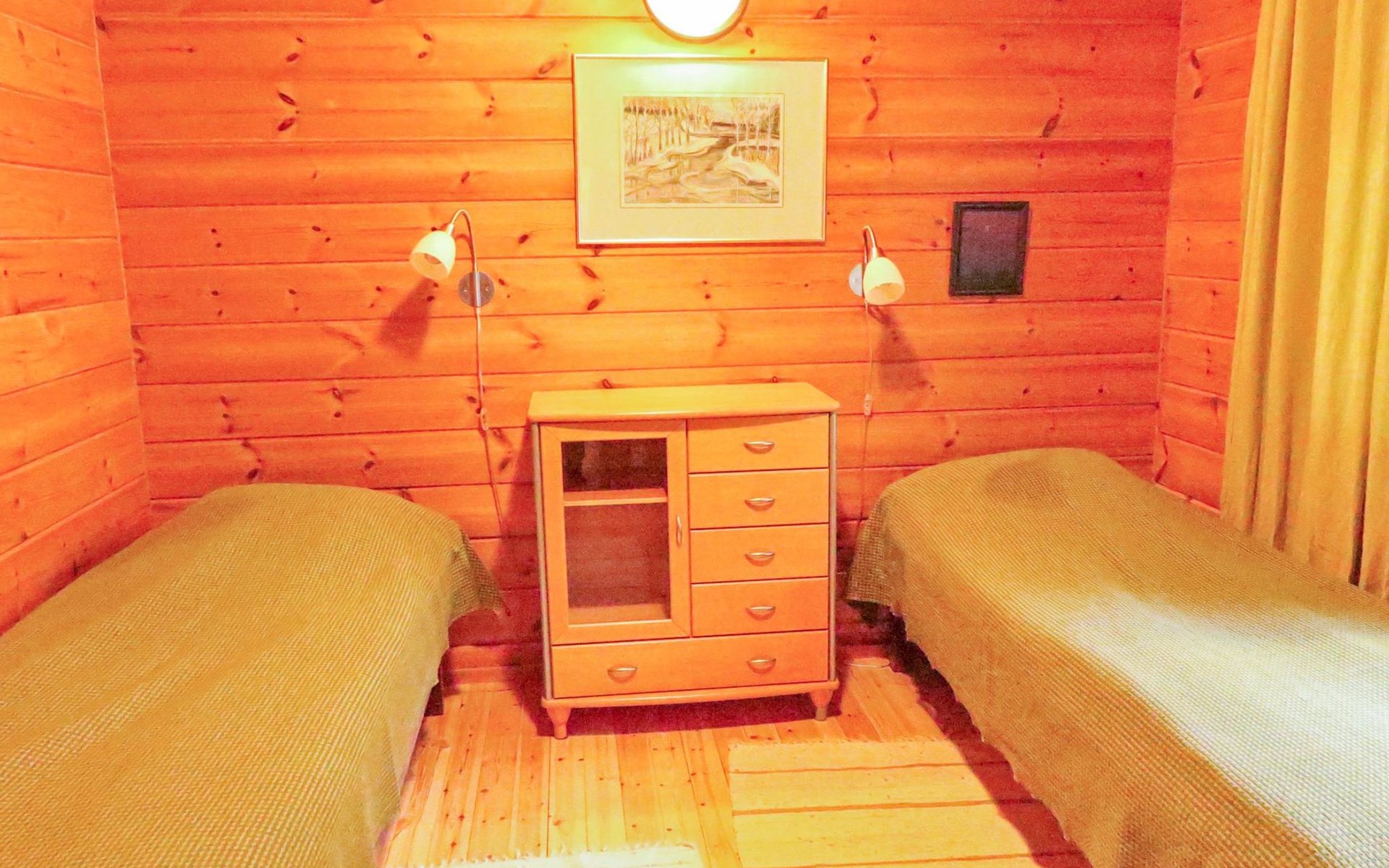 Log cabin 1999, living room/kitchen, 2 bedrooms with double bed in one and single beds in another, dressing room, washroom, sauna, drying room, foyer, open veranda. Sleeping loft (sloping ceilings, maximum height 130 cm) 2 mattresses (other 80 cm wide and other 140 cm wide).