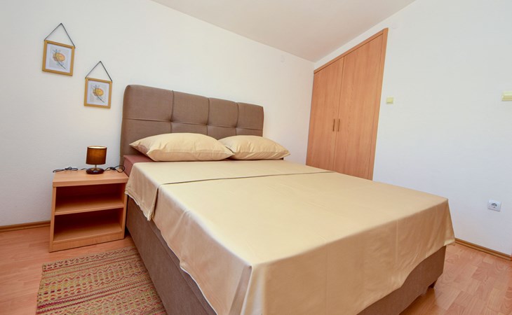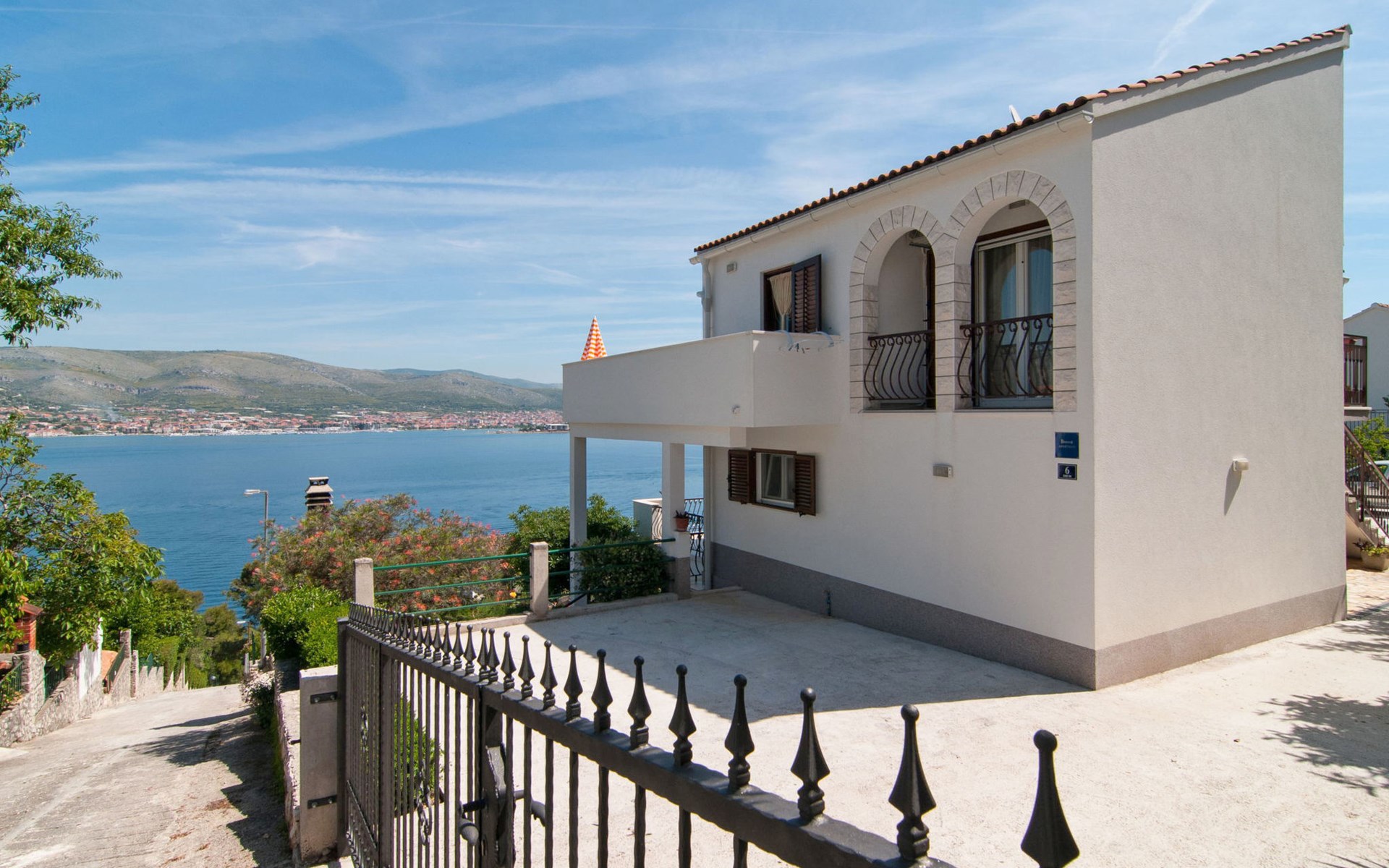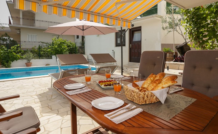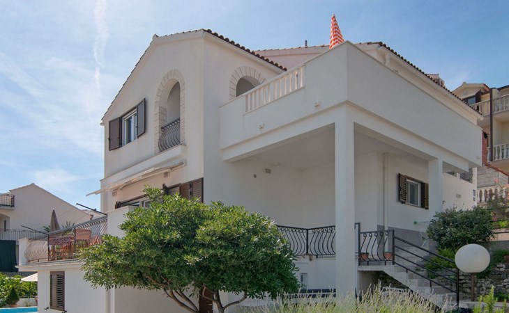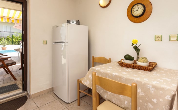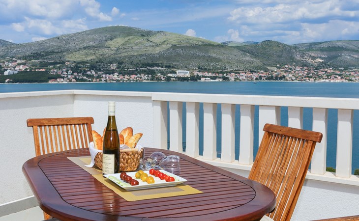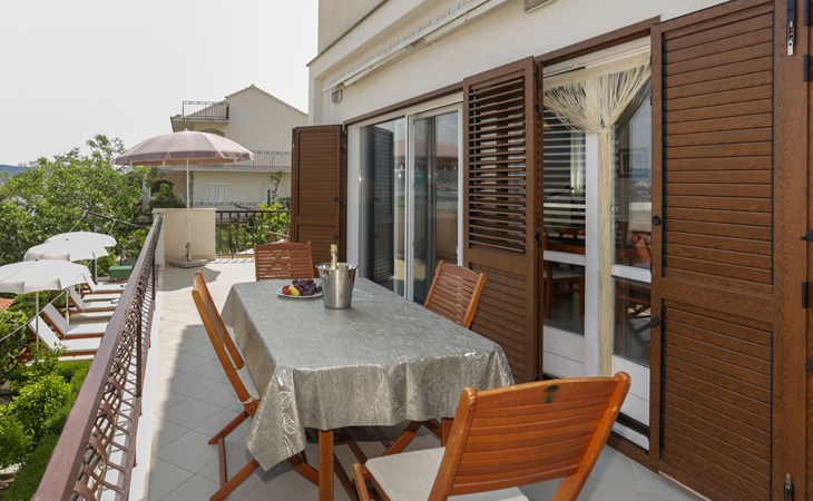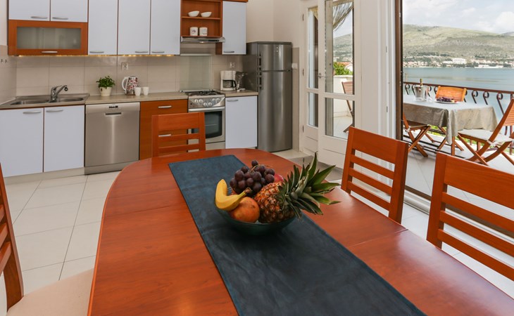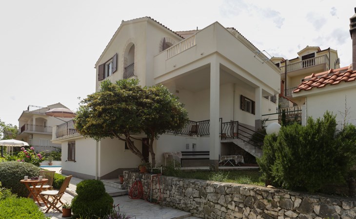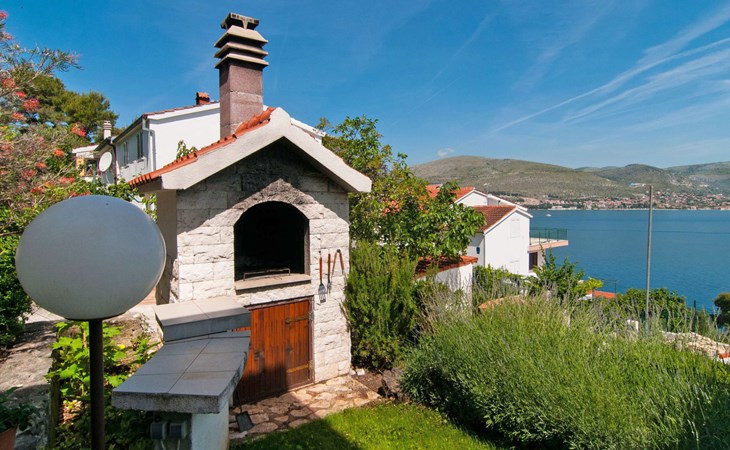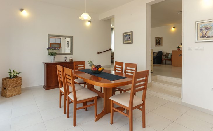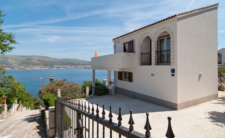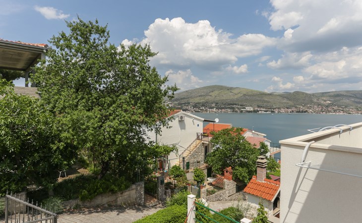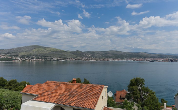 Okrug Donji 8 km van Trogir: Eengezinswoning "Villa Anita", van 3 verdiepingen. Rustige, zonnige, verhoogde ligging, 100 m van zee, 100 m van het strand, op het noorden. Voor alleengebruik: terrein 600 m2, openluchtzwembad hoekig (6 x 4 m, 150 cm diepte, seizoensgebonden beschikbaarheid: 01.Mei. - 01.Okt.) met trap. Buitendouche, terras (20 m2), tuinmeubelen, barbecue. In het huis: internetaansluiting, wasmachine. Parkeerplaats (voor 3 auto's) bij het huis op het terrein. Winkel 500 m, restaurant 2.5 km, bushalte 350 m, rotsstrand, betonnen strand 100 m. Tennis 3 km. Vliegveld 12 km van het huis. Het huis bestaat uit 3 appartementen, die worden verhuurd als een eenheid: een appartement op de begane grond, een appartement op de eerste verdieping en een appartement op de tweede verdieping.