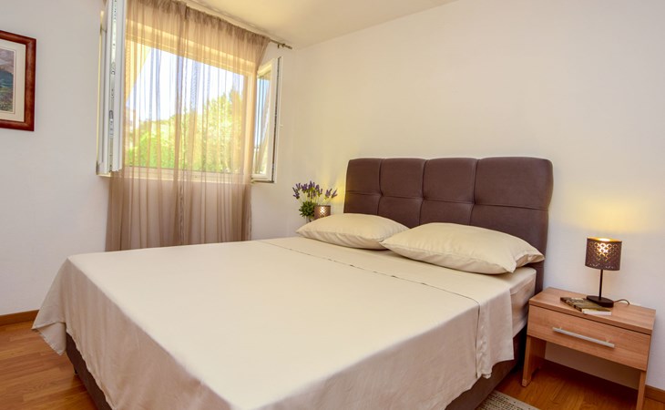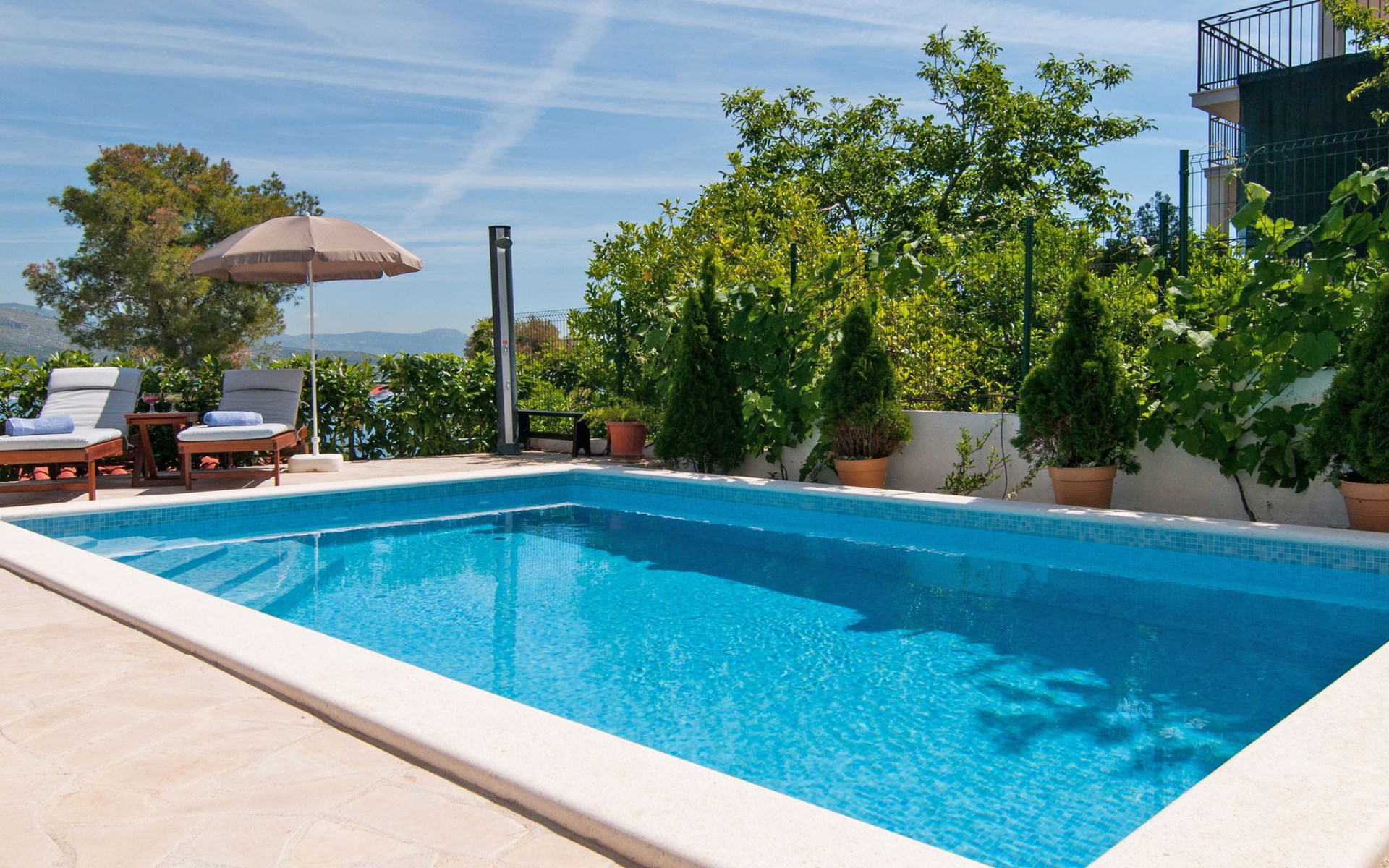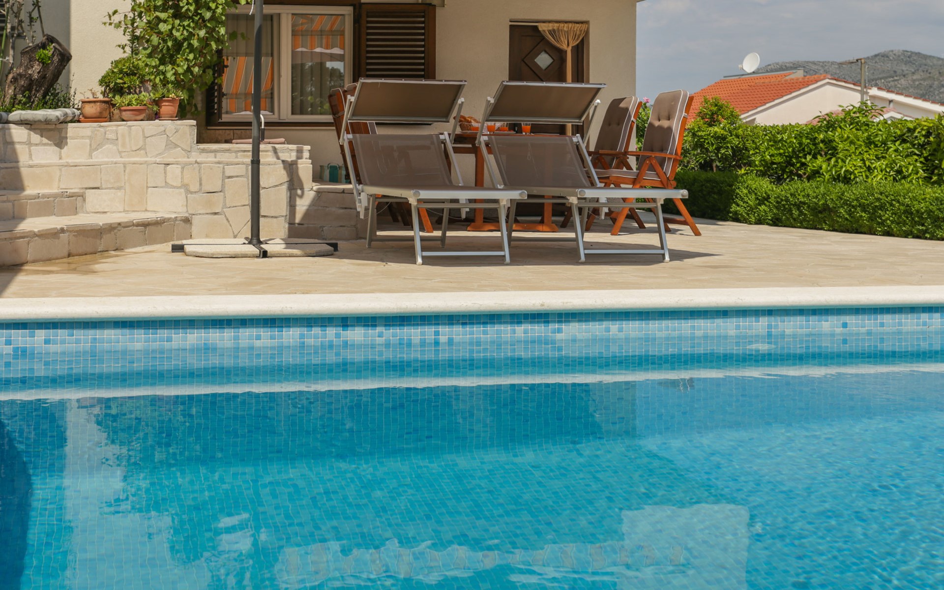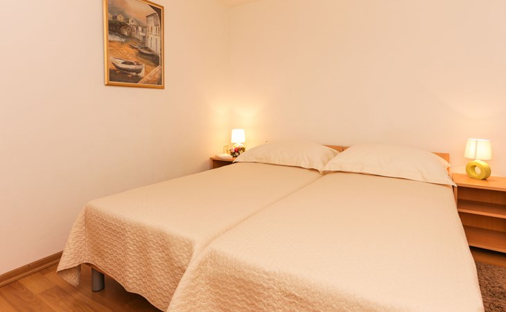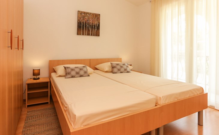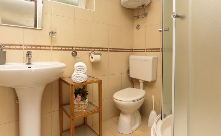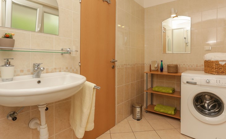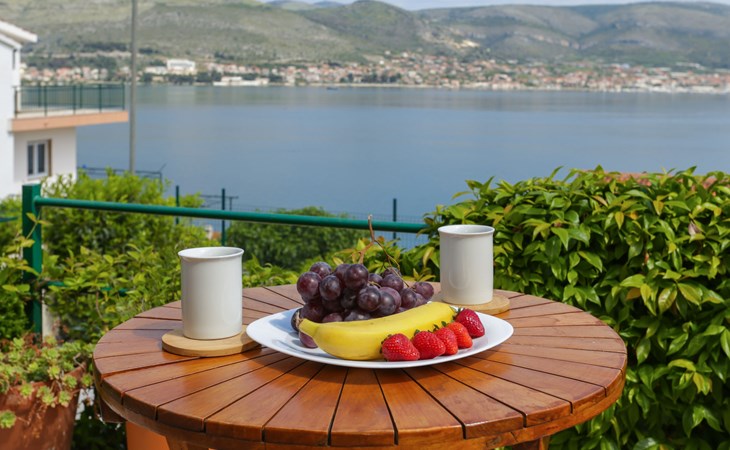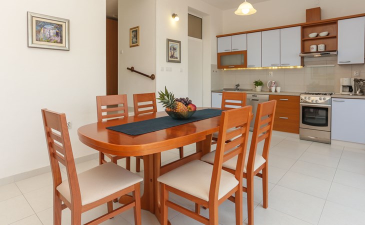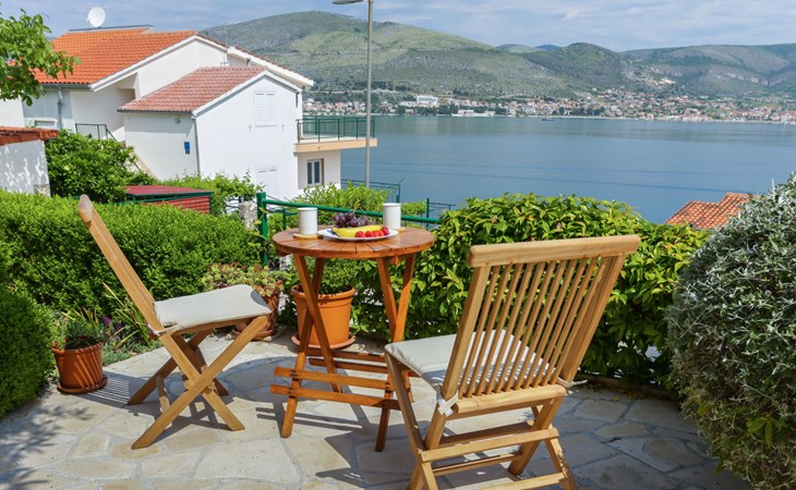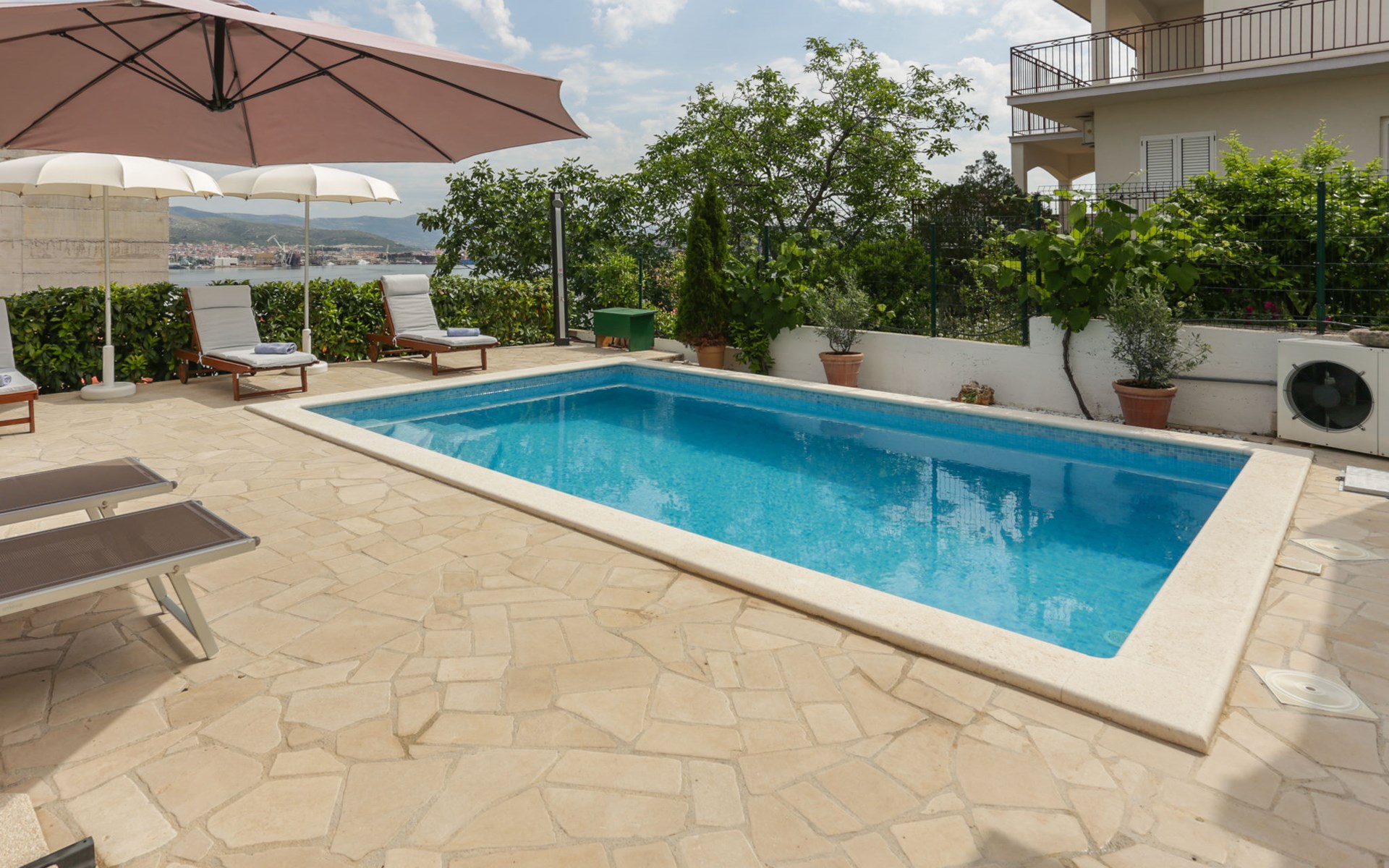 Okrug Donji 8 km van Trogir: Eengezinswoning "Villa Anita", van 3 verdiepingen. Rustige, zonnige, verhoogde ligging, 100 m van zee, 100 m van het strand, op het noorden. Voor alleengebruik: terrein 600 m2, openluchtzwembad hoekig (6 x 4 m, 150 cm diepte, seizoensgebonden beschikbaarheid: 01.Mei. - 01.Okt.) met trap. Buitendouche, terras (20 m2), tuinmeubelen, barbecue. In het huis: internetaansluiting, wasmachine. Parkeerplaats (voor 3 auto's) bij het huis op het terrein. Winkel 500 m, restaurant 2.5 km, bushalte 350 m, rotsstrand, betonnen strand 100 m. Tennis 3 km. Vliegveld 12 km van het huis. Het huis bestaat uit 3 appartementen, die worden verhuurd als een eenheid: een appartement op de begane grond, een appartement op de eerste verdieping en een appartement op de tweede verdieping.