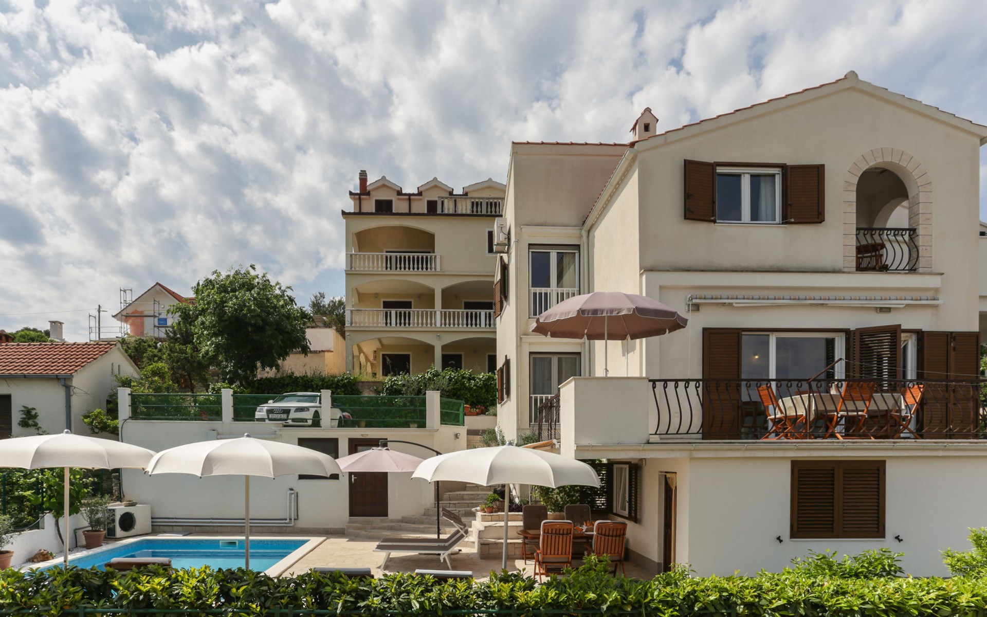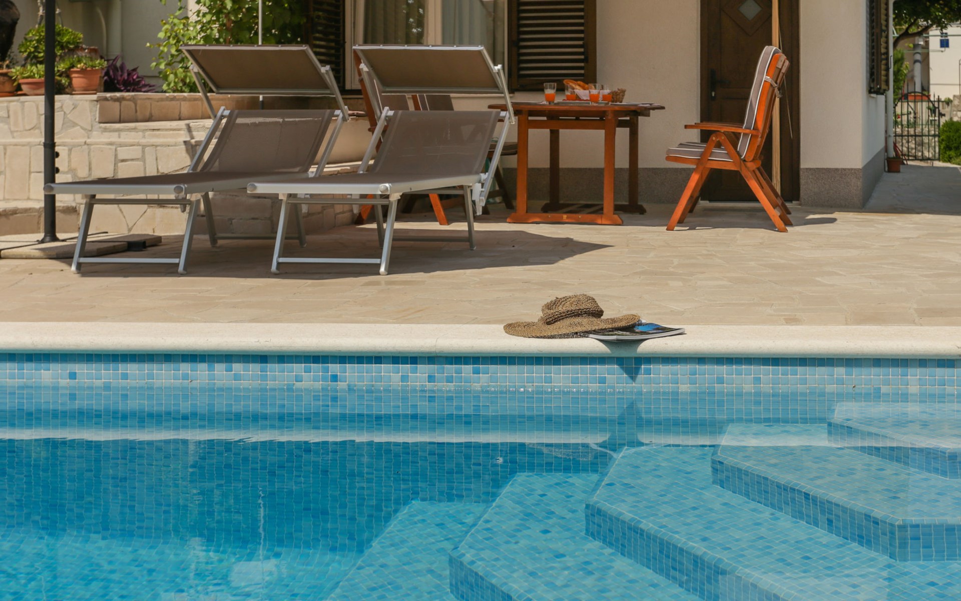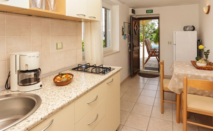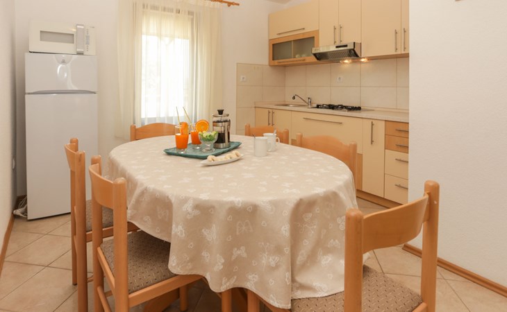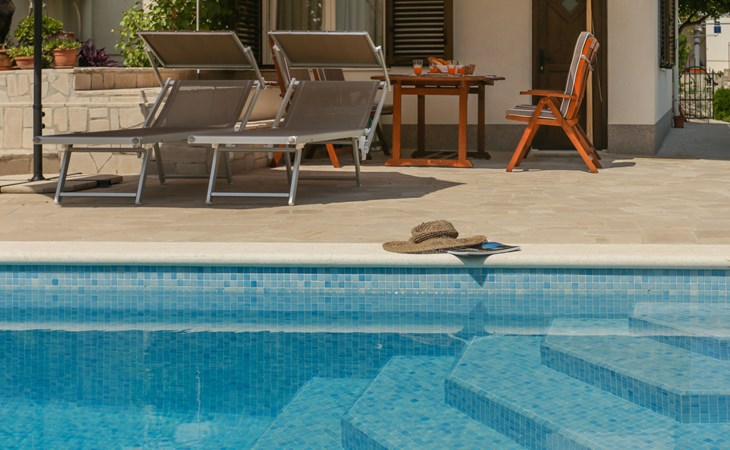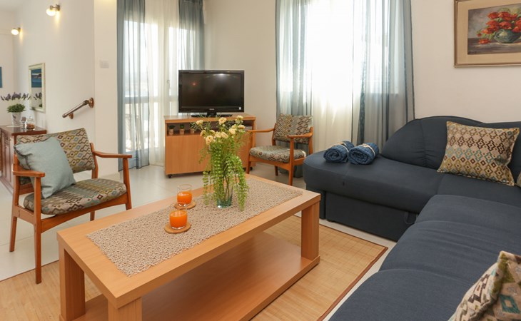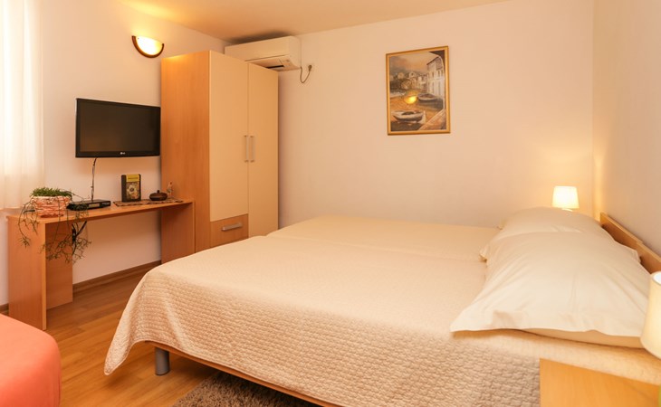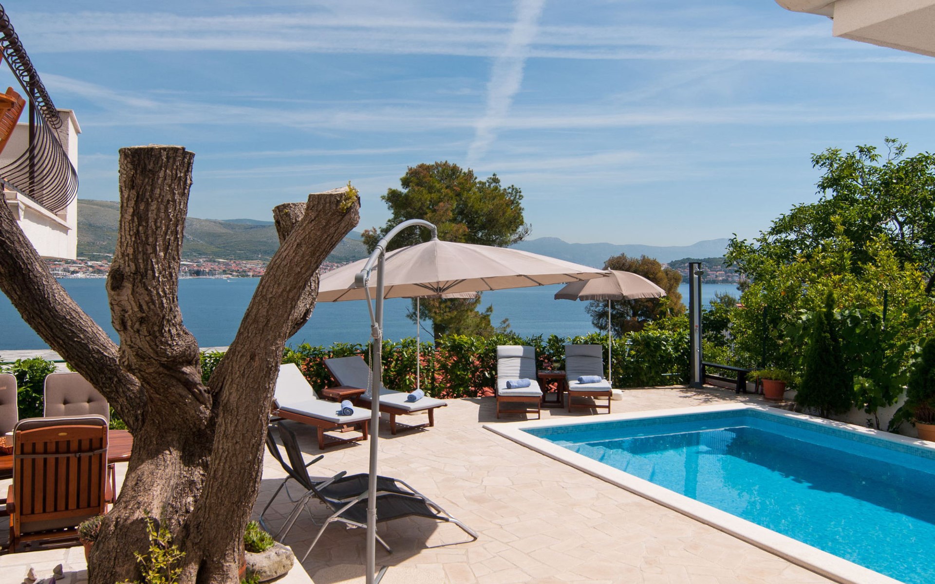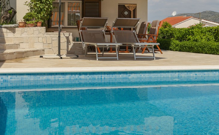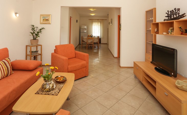Okrug Donji 8 km van Trogir: Eengezinswoning "Villa Anita", van 3 verdiepingen. Rustige, zonnige, verhoogde ligging, 100 m van zee, 100 m van het strand, op het noorden. Voor alleengebruik: terrein 600 m2, openluchtzwembad hoekig (6 x 4 m, 150 cm diepte, seizoensgebonden beschikbaarheid: 01.Mei. - 01.Okt.) met trap. Buitendouche, terras (20 m2), tuinmeubelen, barbecue. In het huis: internetaansluiting, wasmachine. Parkeerplaats (voor 3 auto's) bij het huis op het terrein. Winkel 500 m, restaurant 2.5 km, bushalte 350 m, rotsstrand, betonnen strand 100 m. Tennis 3 km. Vliegveld 12 km van het huis. Het huis bestaat uit 3 appartementen, die worden verhuurd als een eenheid: een appartement op de begane grond, een appartement op de eerste verdieping en een appartement op de tweede verdieping.