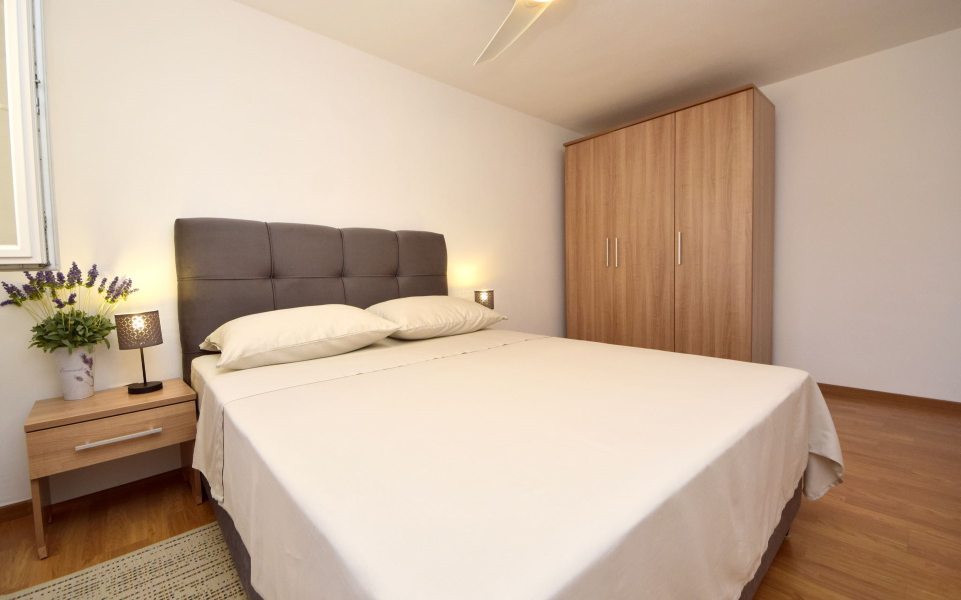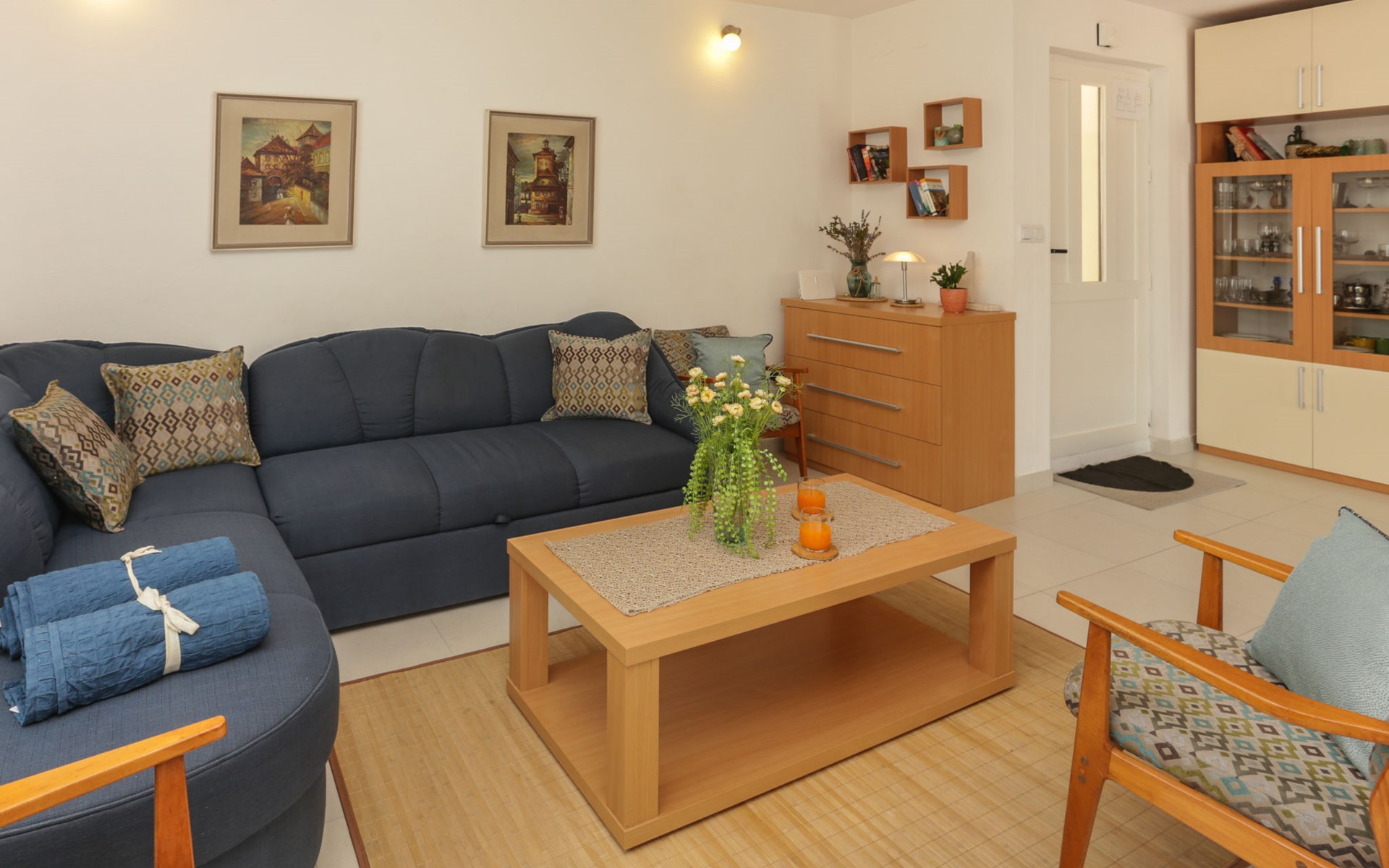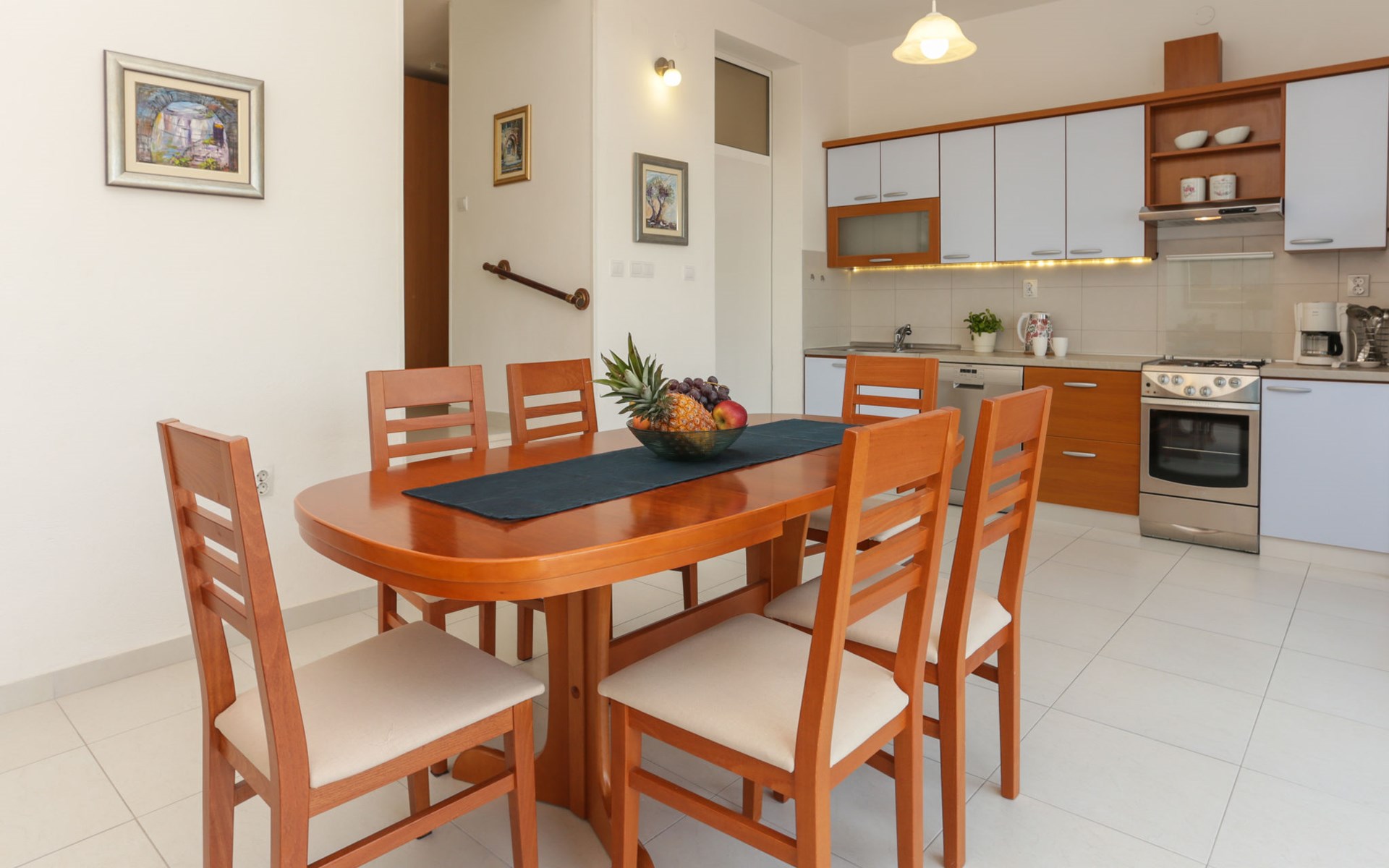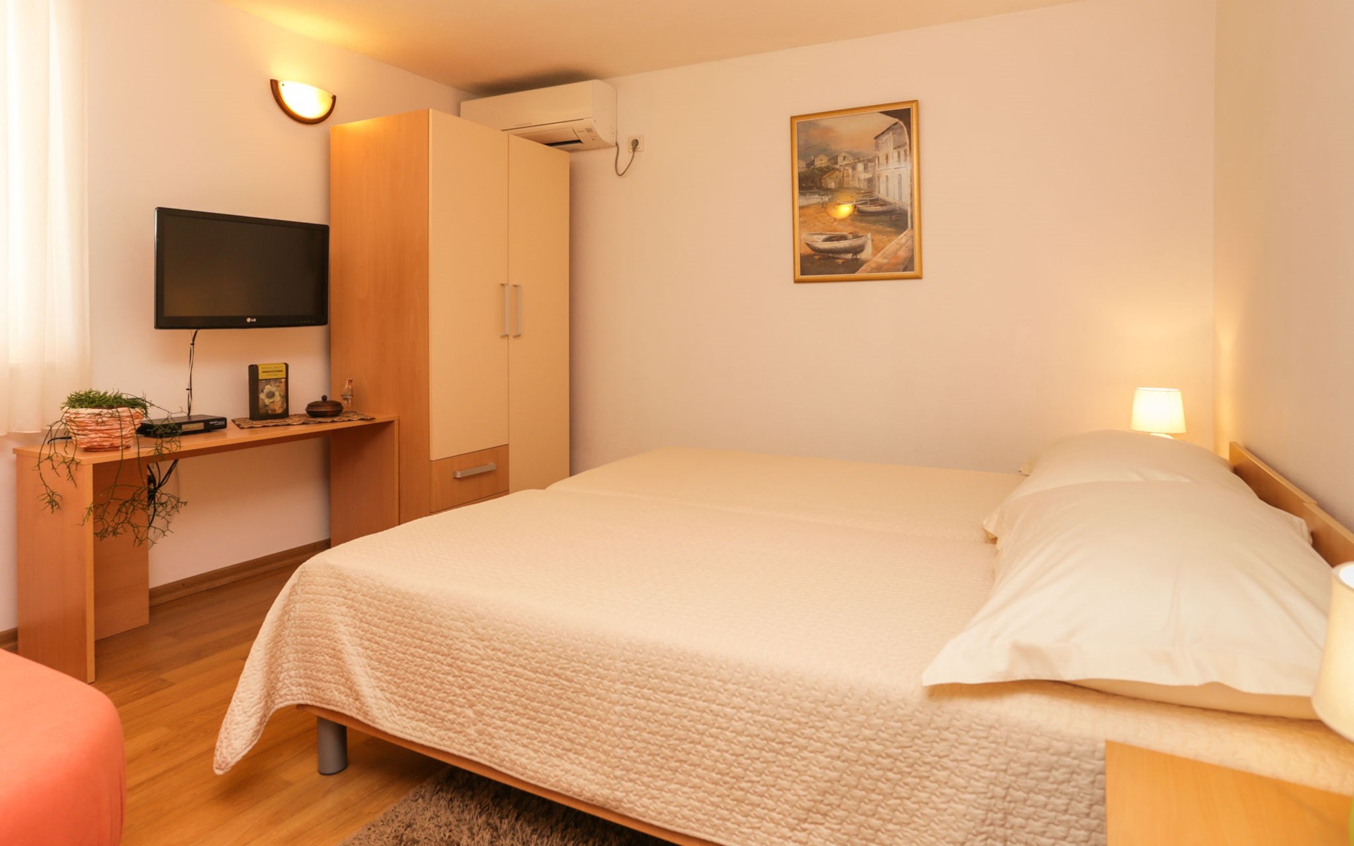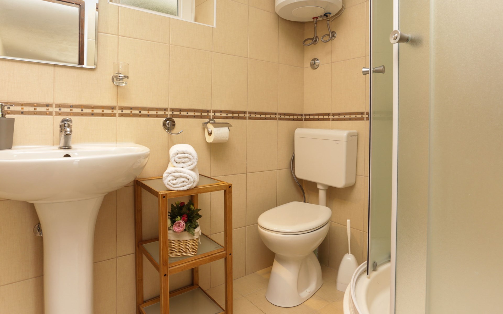 Okrug Donji 8 km van Trogir: Eengezinswoning "Villa Anita", van 3 verdiepingen. Rustige, zonnige, verhoogde ligging, 100 m van zee, 100 m van het strand, op het noorden. Voor alleengebruik: terrein 600 m2, openluchtzwembad hoekig (6 x 4 m, 150 cm diepte, seizoensgebonden beschikbaarheid: 01.Mei. - 01.Okt.) met trap. Buitendouche, terras (20 m2), tuinmeubelen, barbecue. In het huis: internetaansluiting, wasmachine. Parkeerplaats (voor 3 auto's) bij het huis op het terrein. Winkel 500 m, restaurant 2.5 km, bushalte 350 m, rotsstrand, betonnen strand 100 m. Tennis 3 km. Vliegveld 12 km van het huis. Het huis bestaat uit 3 appartementen, die worden verhuurd als een eenheid: een appartement op de begane grond, een appartement op de eerste verdieping en een appartement op de tweede verdieping.