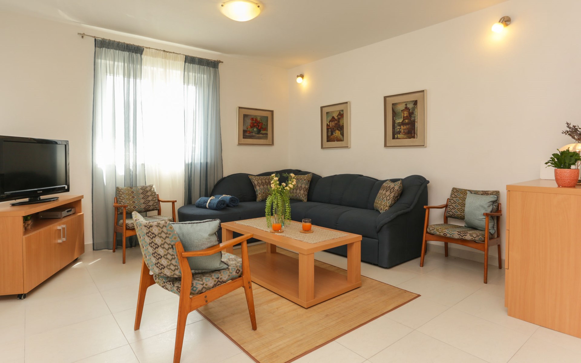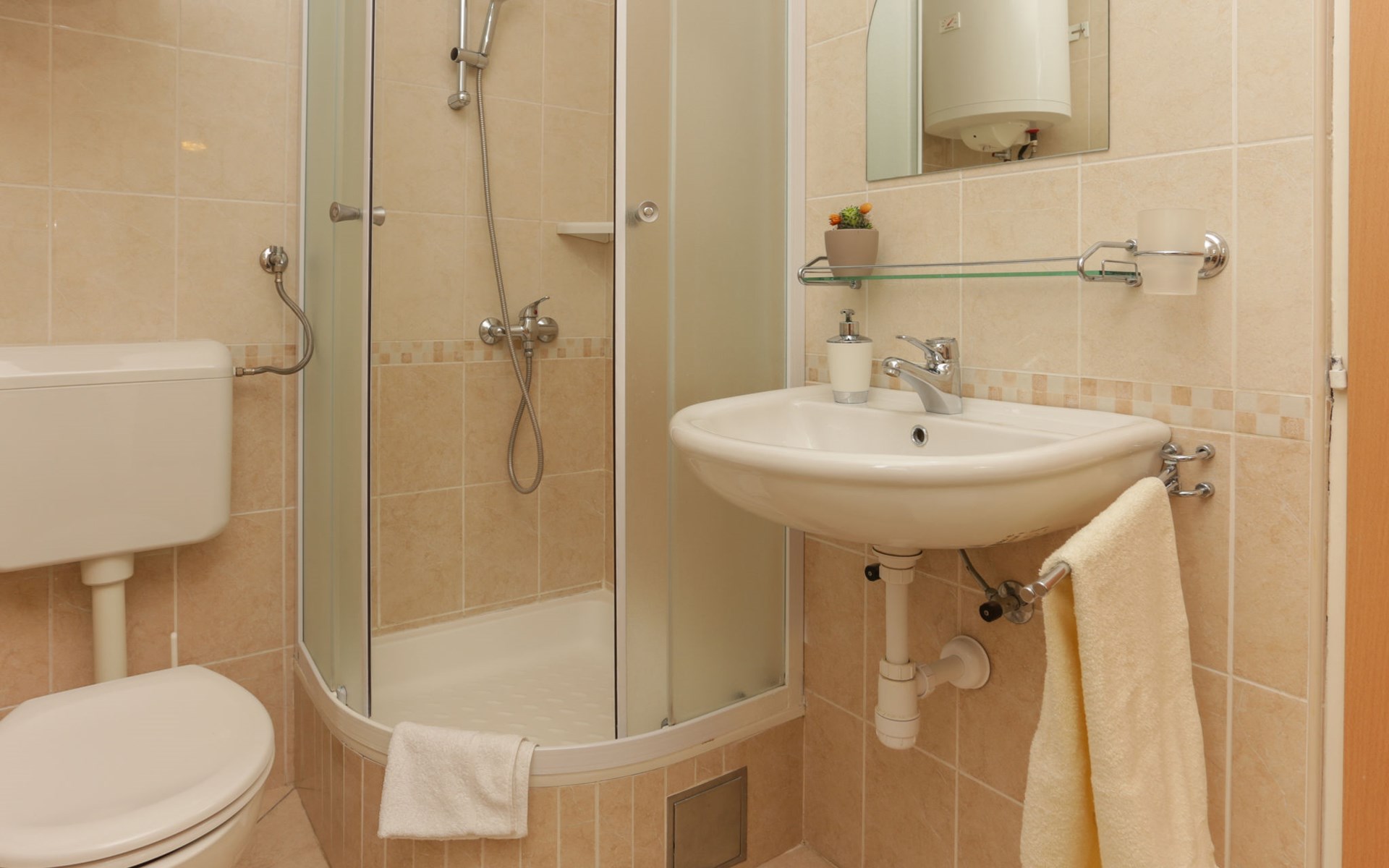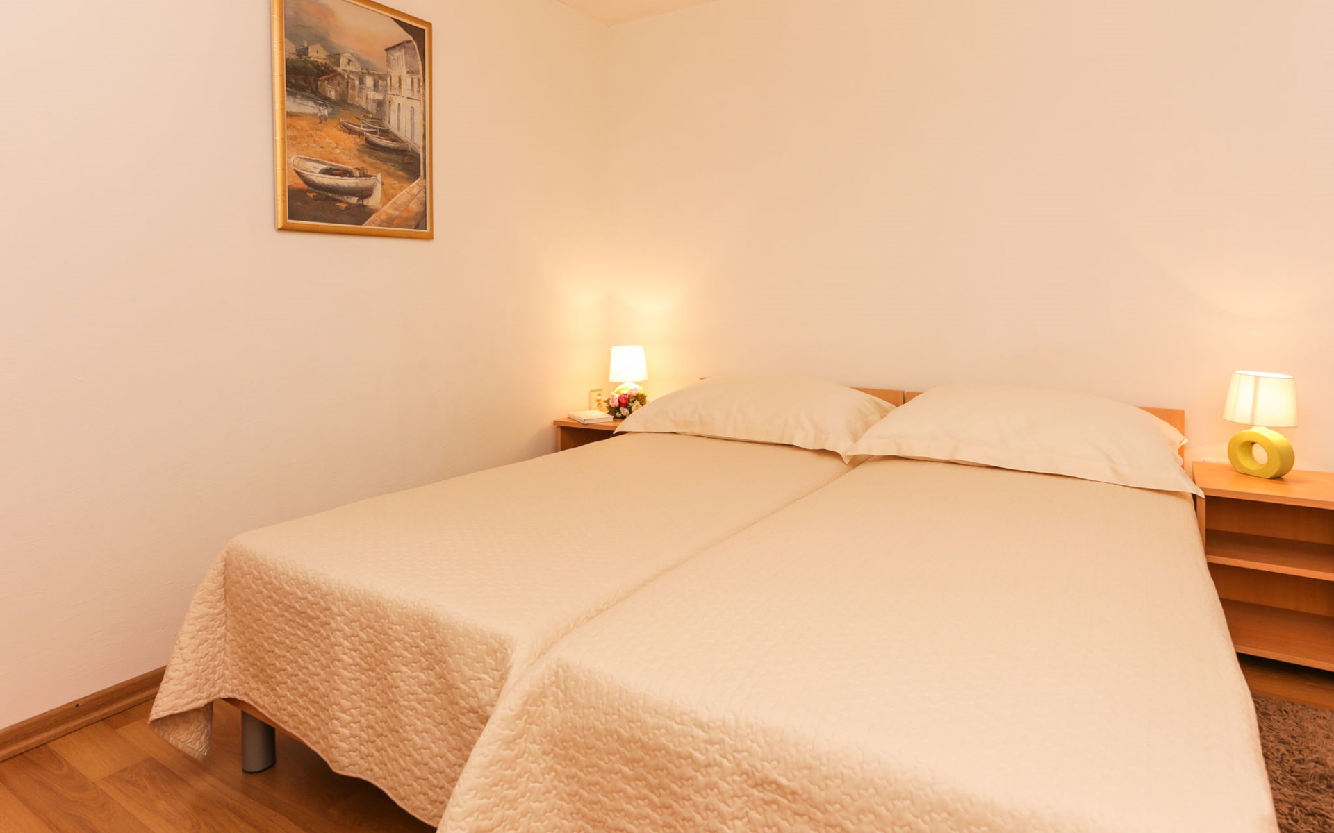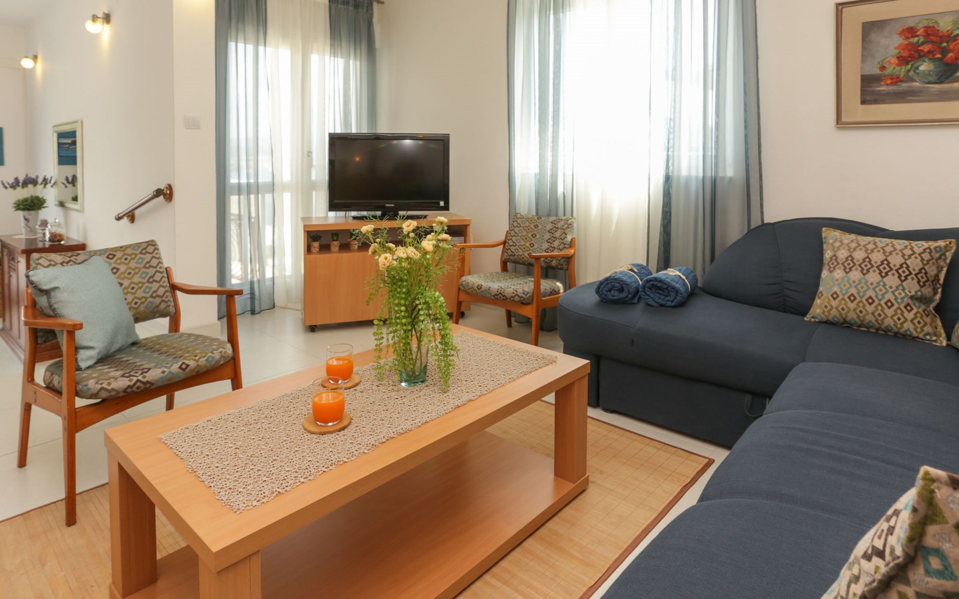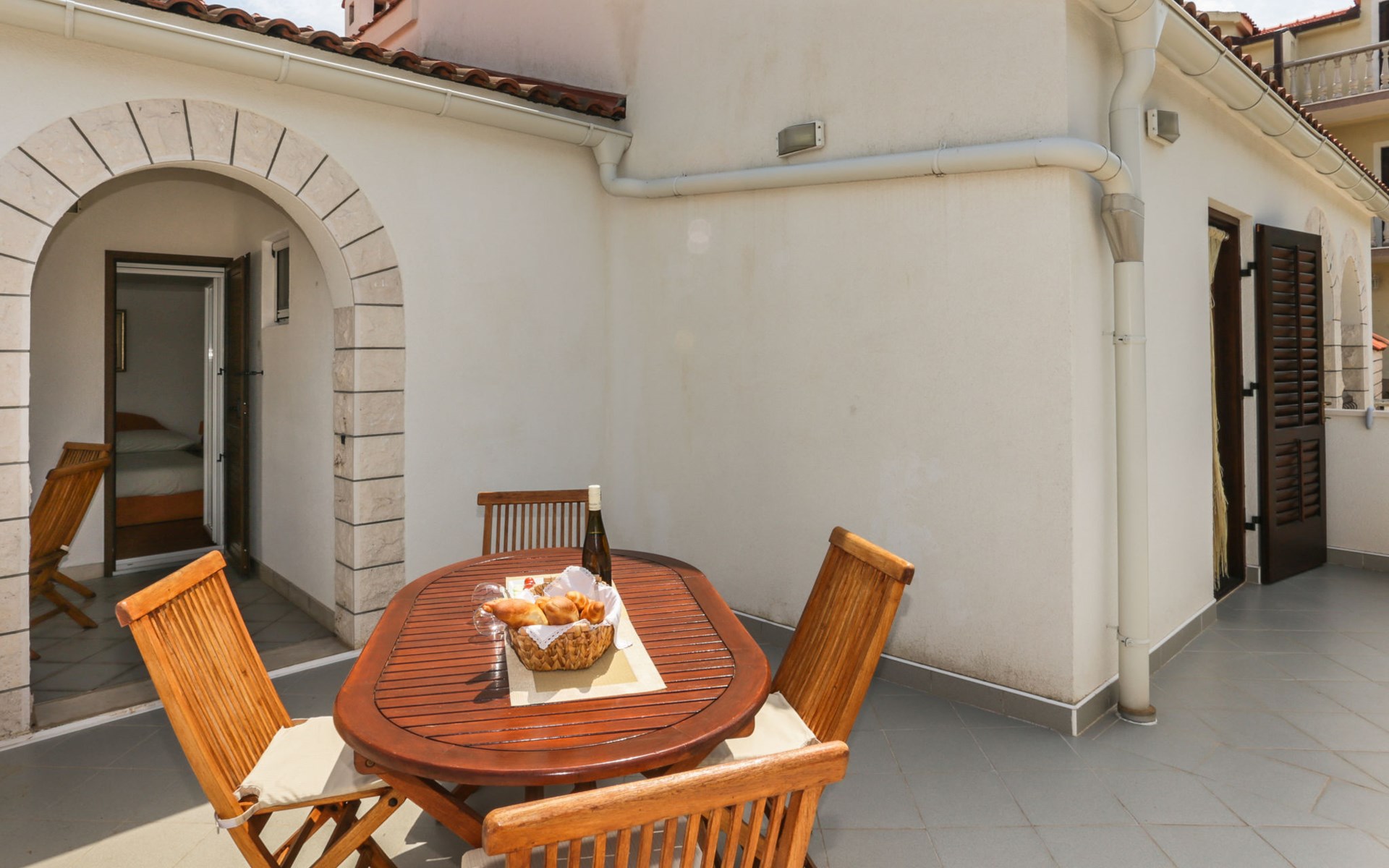 Okrug Donji 8 km van Trogir: Eengezinswoning "Villa Anita", van 3 verdiepingen. Rustige, zonnige, verhoogde ligging, 100 m van zee, 100 m van het strand, op het noorden. Voor alleengebruik: terrein 600 m2, openluchtzwembad hoekig (6 x 4 m, 150 cm diepte, seizoensgebonden beschikbaarheid: 01.Mei. - 01.Okt.) met trap. Buitendouche, terras (20 m2), tuinmeubelen, barbecue. In het huis: internetaansluiting, wasmachine. Parkeerplaats (voor 3 auto's) bij het huis op het terrein. Winkel 500 m, restaurant 2.5 km, bushalte 350 m, rotsstrand, betonnen strand 100 m. Tennis 3 km. Vliegveld 12 km van het huis. Het huis bestaat uit 3 appartementen, die worden verhuurd als een eenheid: een appartement op de begane grond, een appartement op de eerste verdieping en een appartement op de tweede verdieping.