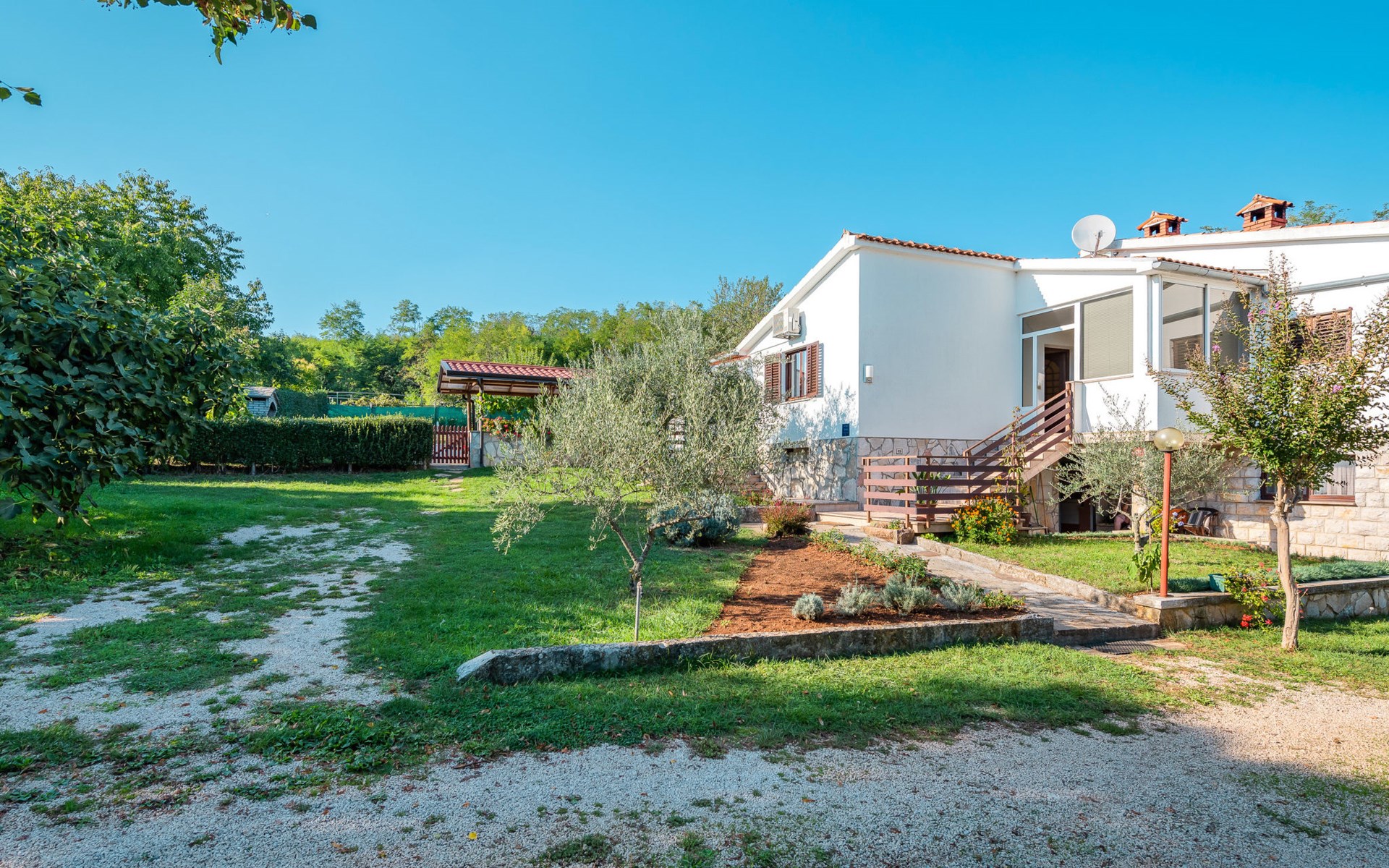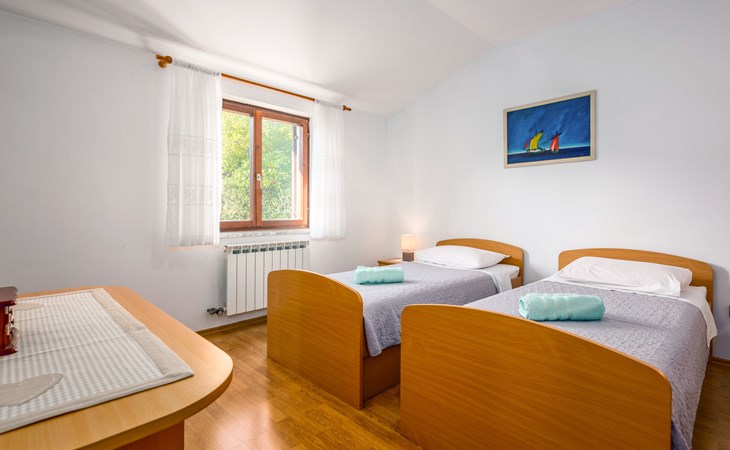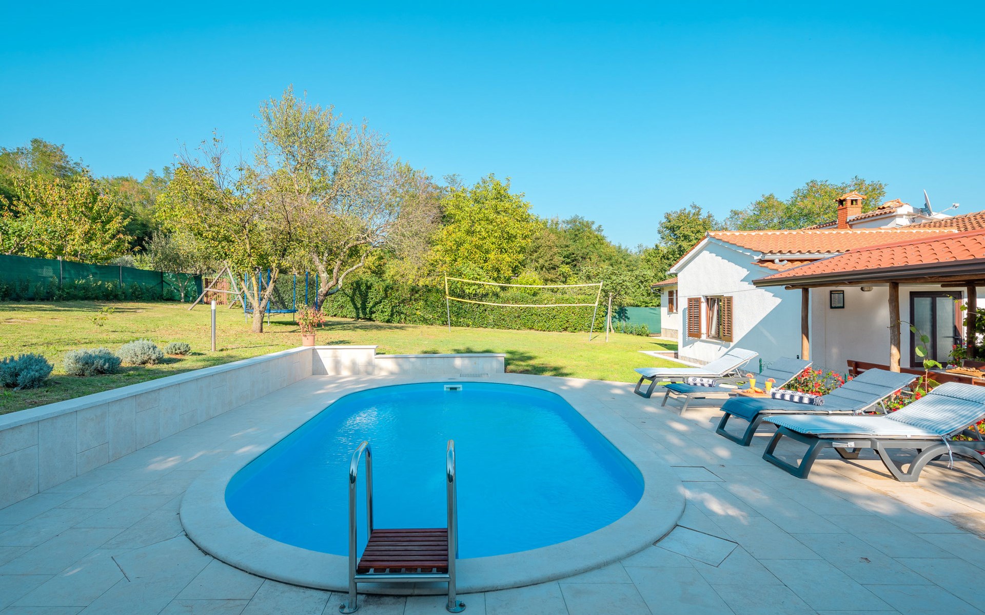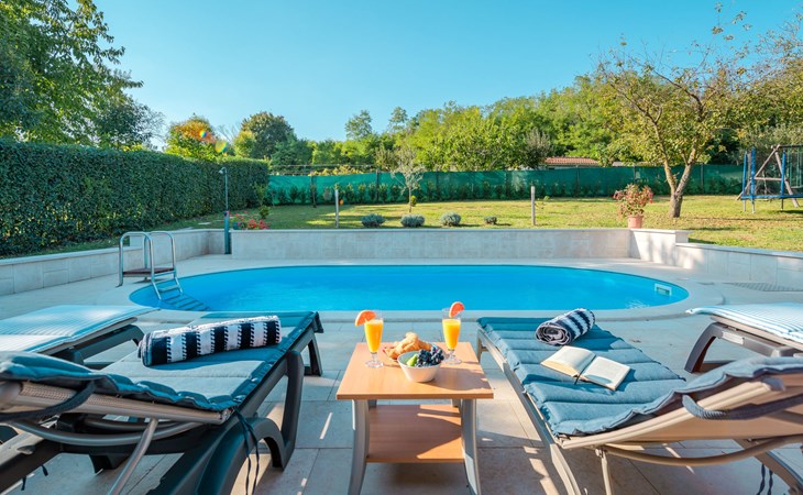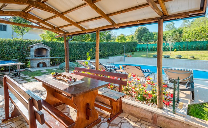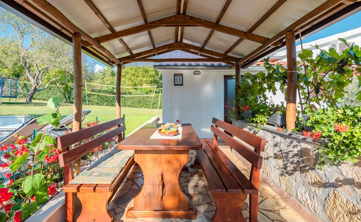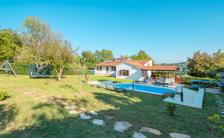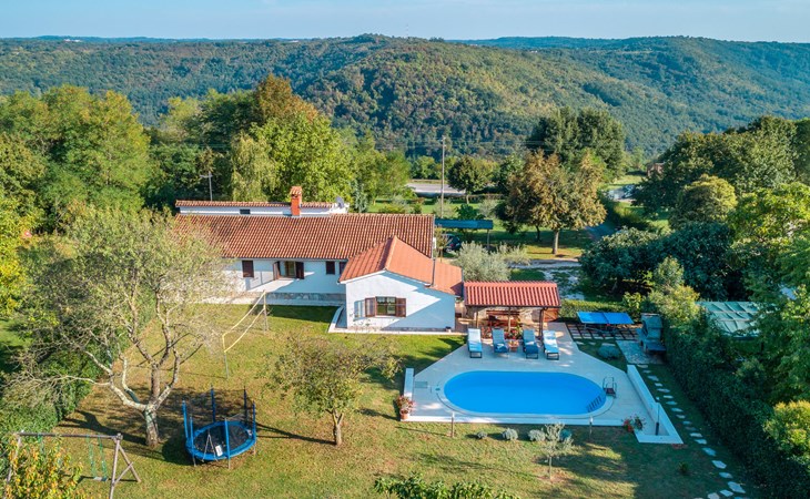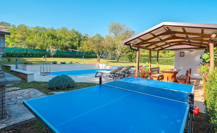 Twee onder één kap woning "Hacienda". 2 km van het centrum van Tinjan, 20 km van het centrum van Poreč, 30 km van het centrum van Pula, 20 km van zee, te midden van groen. Voor medegebruik: terrein 15.000 m2 met gazon en bomen. Voor alleengebruik: terrein 4.000 m2 met gazon, openluchtzwembad (7 x 4 m, 150 cm diepte, seizoensgebonden beschikbaarheid: 04.Apr. - 06.Nov.). Buitendouche, tafeltennis, terras, tuinmeubelen, barbecue (schommel), onderhoud zwembad door de eigenaar/tuinman. In het huis: internetaansluiting, trampoline, wasmachine. Parkeerplaats op het terrein. Winkel 2 km, restaurant 2 km, bushalte 450 m, rotsstrand 20 km. Lokale verkoop van streekproducten. De eigenaar woont in hetzelfde huis. Groepen jongeren zijn niet toegestaan.