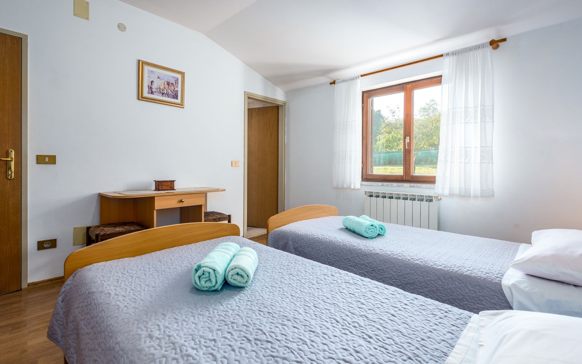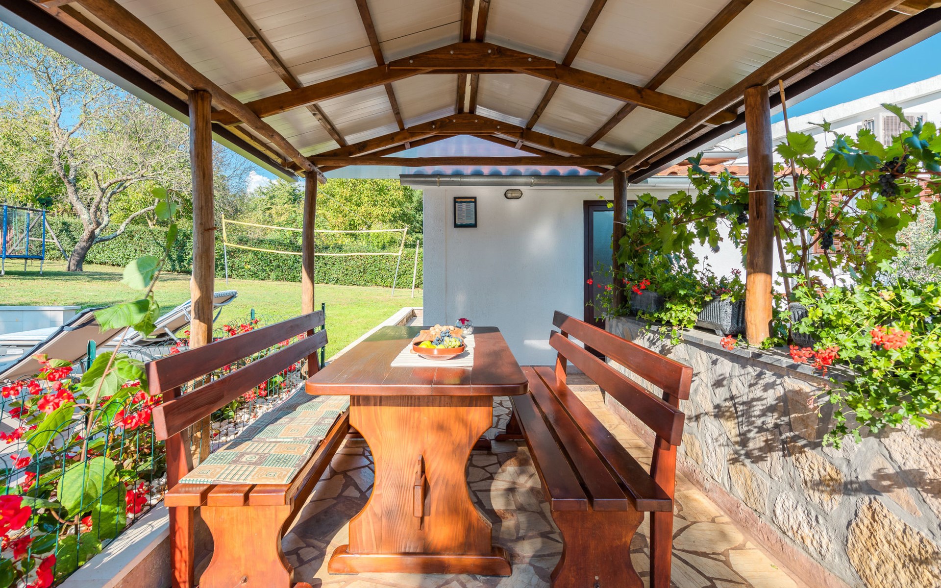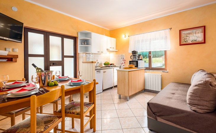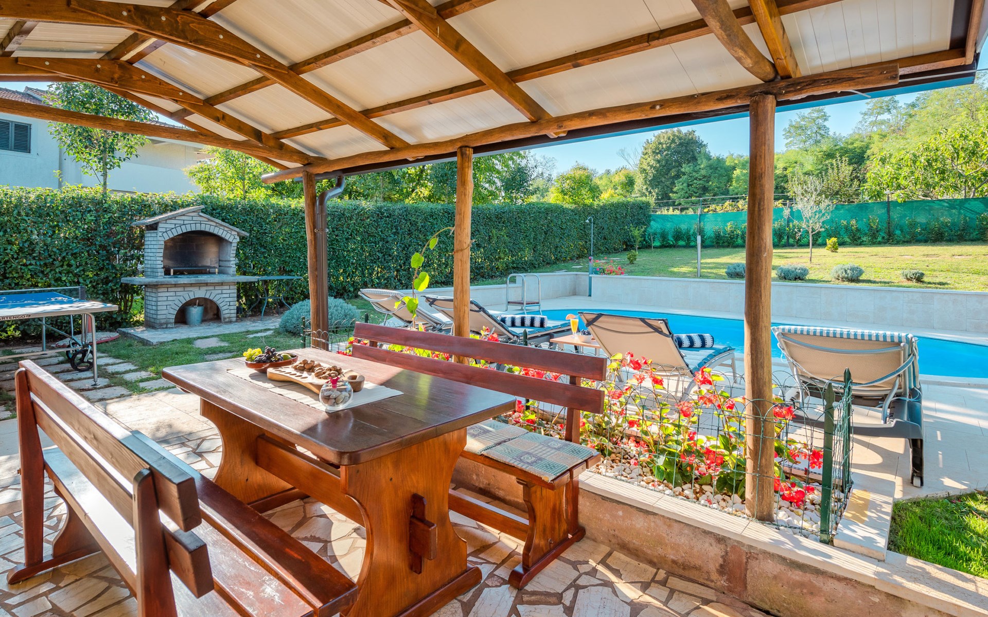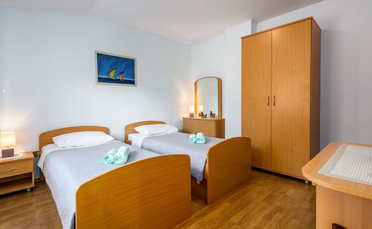 Twee onder één kap woning "Hacienda". 2 km van het centrum van Tinjan, 20 km van het centrum van Poreč, 30 km van het centrum van Pula, 20 km van zee, te midden van groen. Voor medegebruik: terrein 15.000 m2 met gazon en bomen. Voor alleengebruik: terrein 4.000 m2 met gazon, openluchtzwembad (7 x 4 m, 150 cm diepte, seizoensgebonden beschikbaarheid: 04.Apr. - 06.Nov.). Buitendouche, tafeltennis, terras, tuinmeubelen, barbecue (schommel), onderhoud zwembad door de eigenaar/tuinman. In het huis: internetaansluiting, trampoline, wasmachine. Parkeerplaats op het terrein. Winkel 2 km, restaurant 2 km, bushalte 450 m, rotsstrand 20 km. Lokale verkoop van streekproducten. De eigenaar woont in hetzelfde huis. Groepen jongeren zijn niet toegestaan.